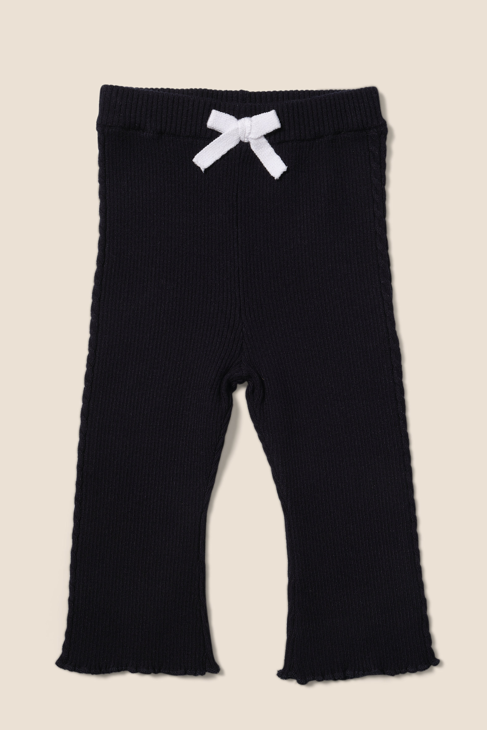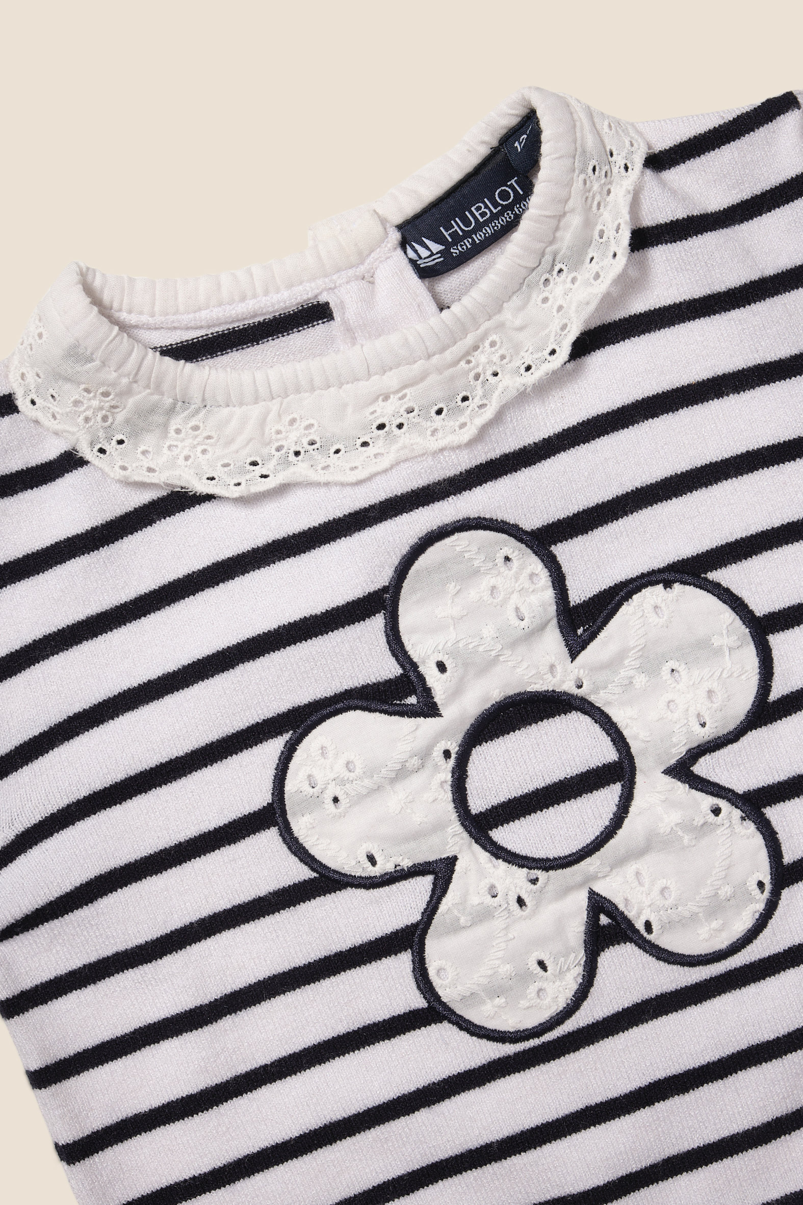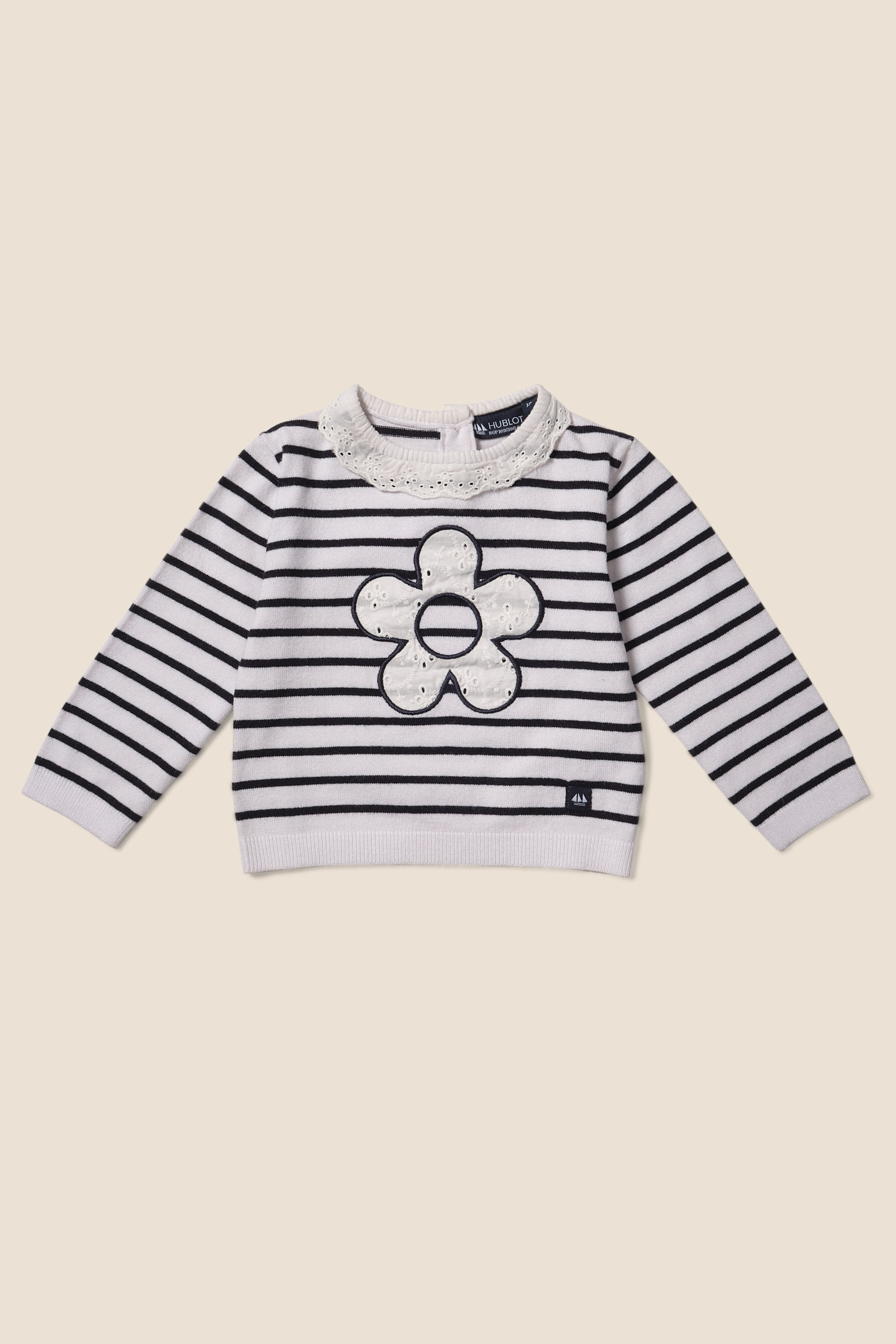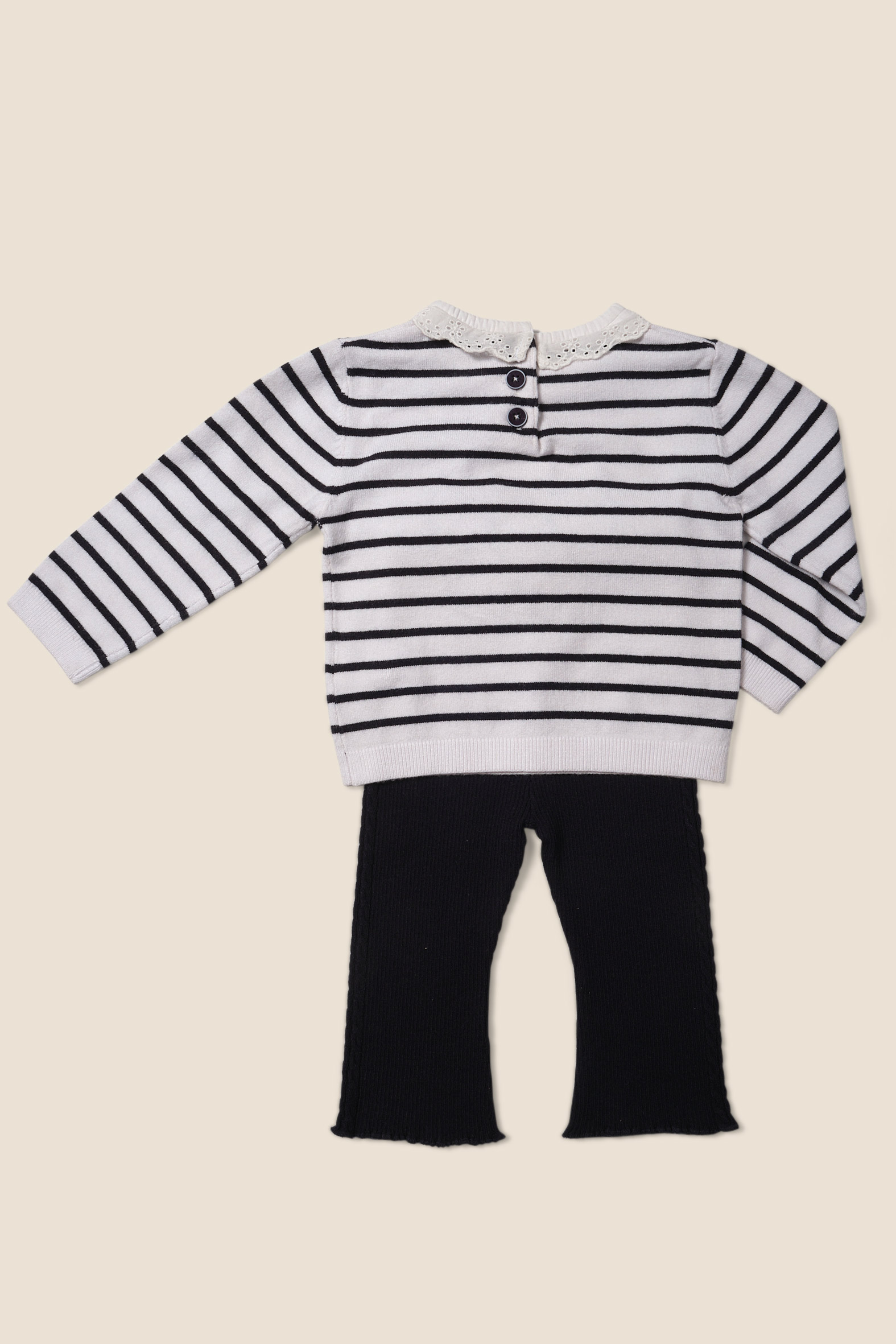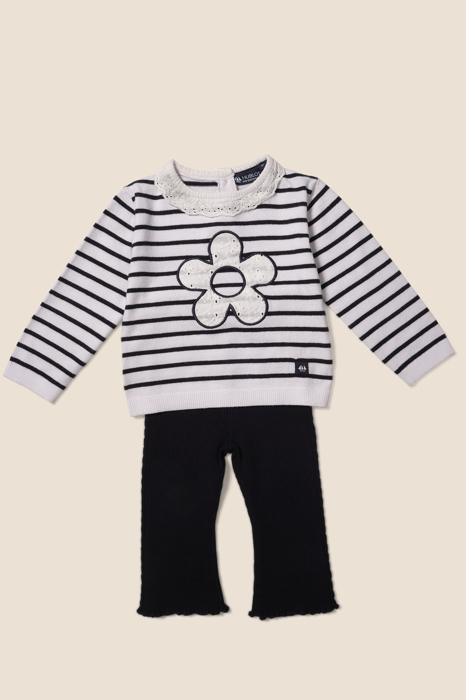 Ensemble fille avec un pull animation broderie anglaise et un pantalon évasé