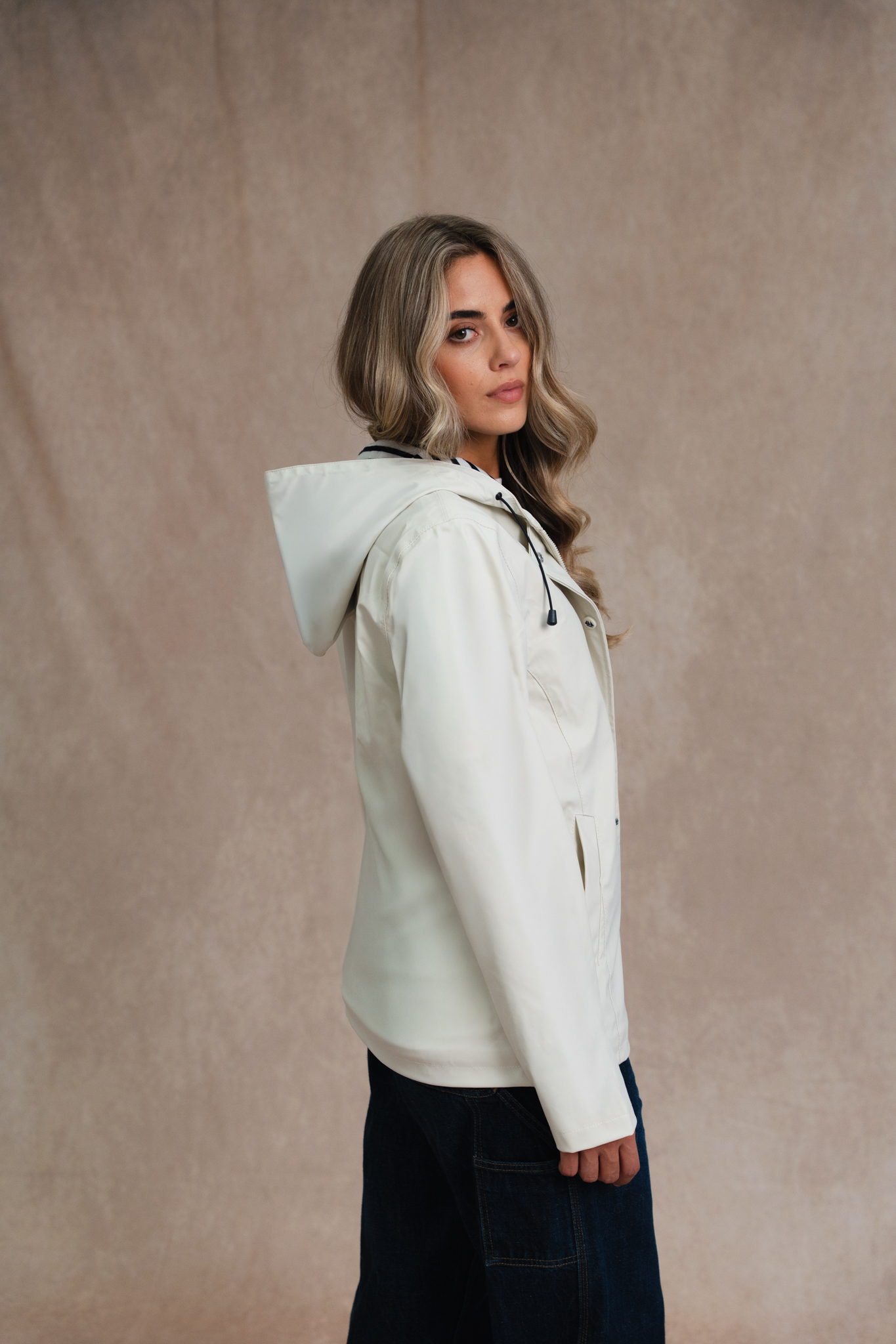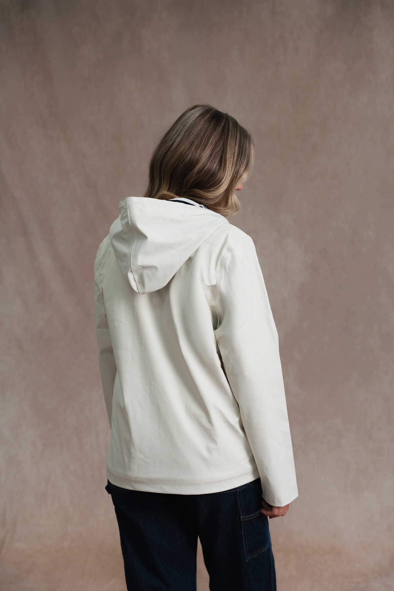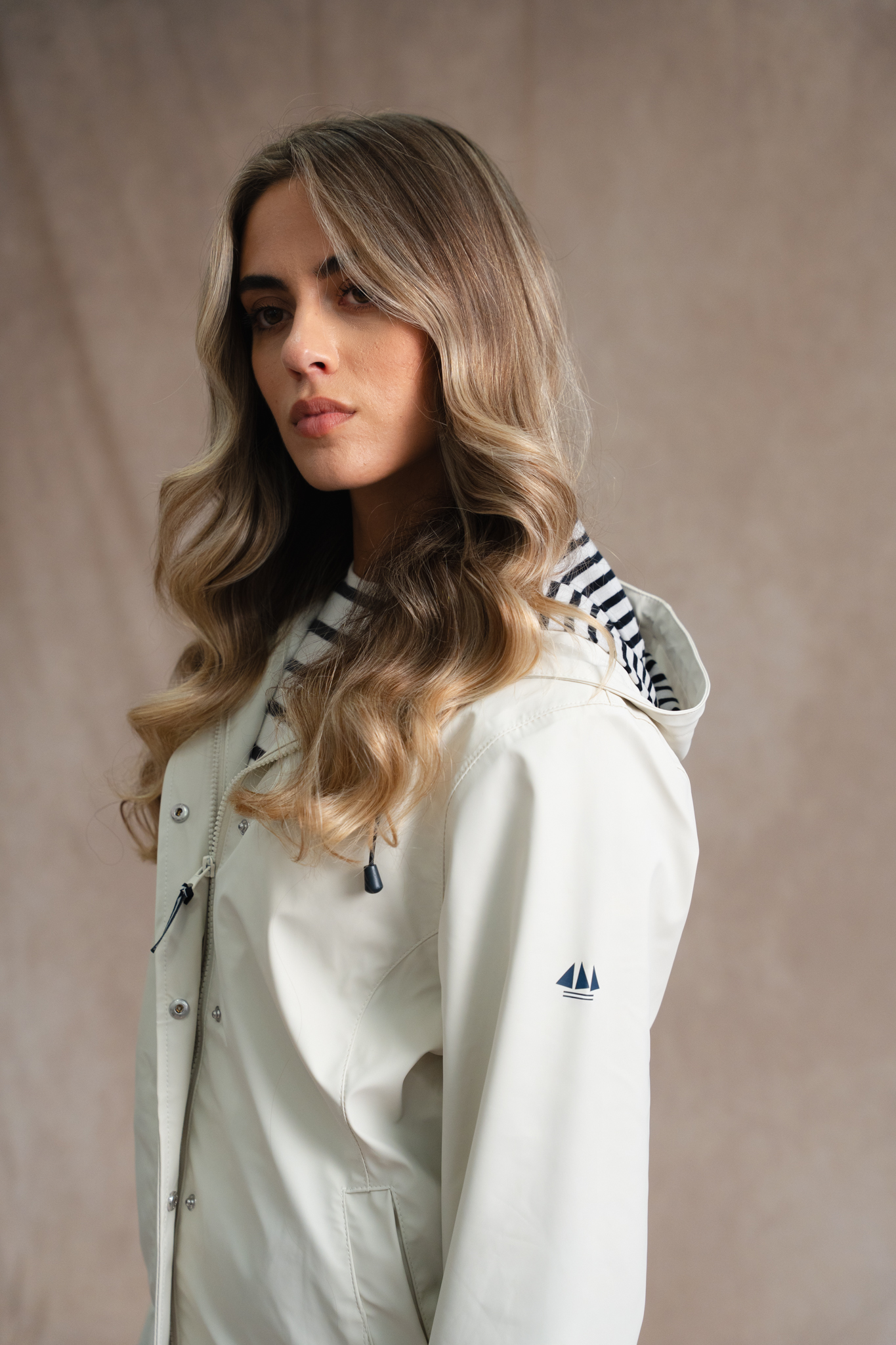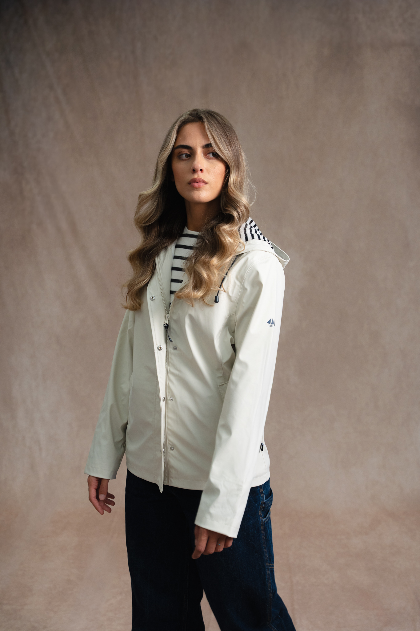 Alliez chaleur, style et féminité avec le ciré Soleane : coupe ajustée, doublure polaire, capuche rayée ajustable et finitions soignées pour rester chic même sous la pluie.