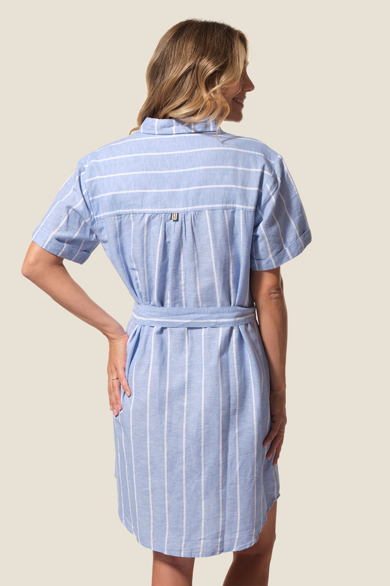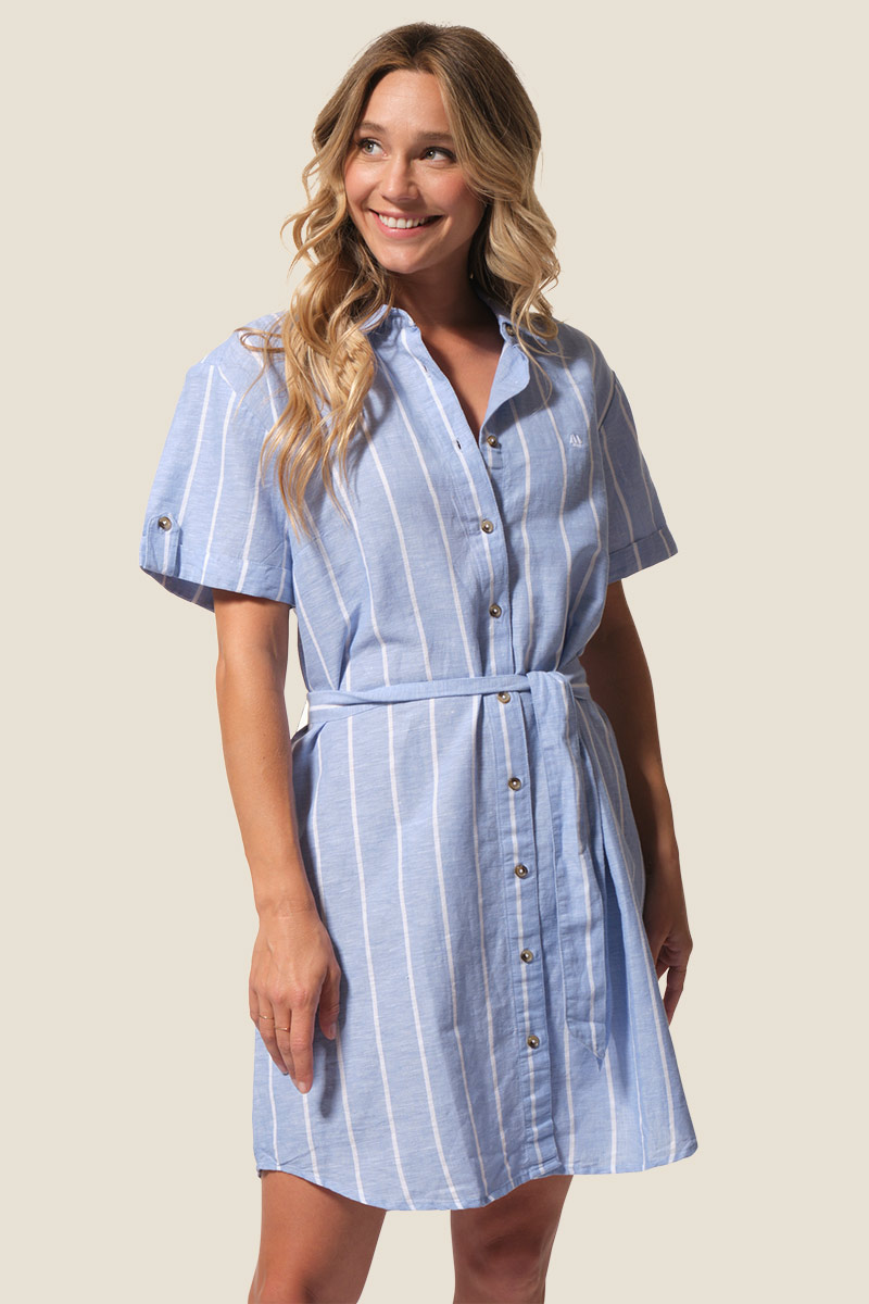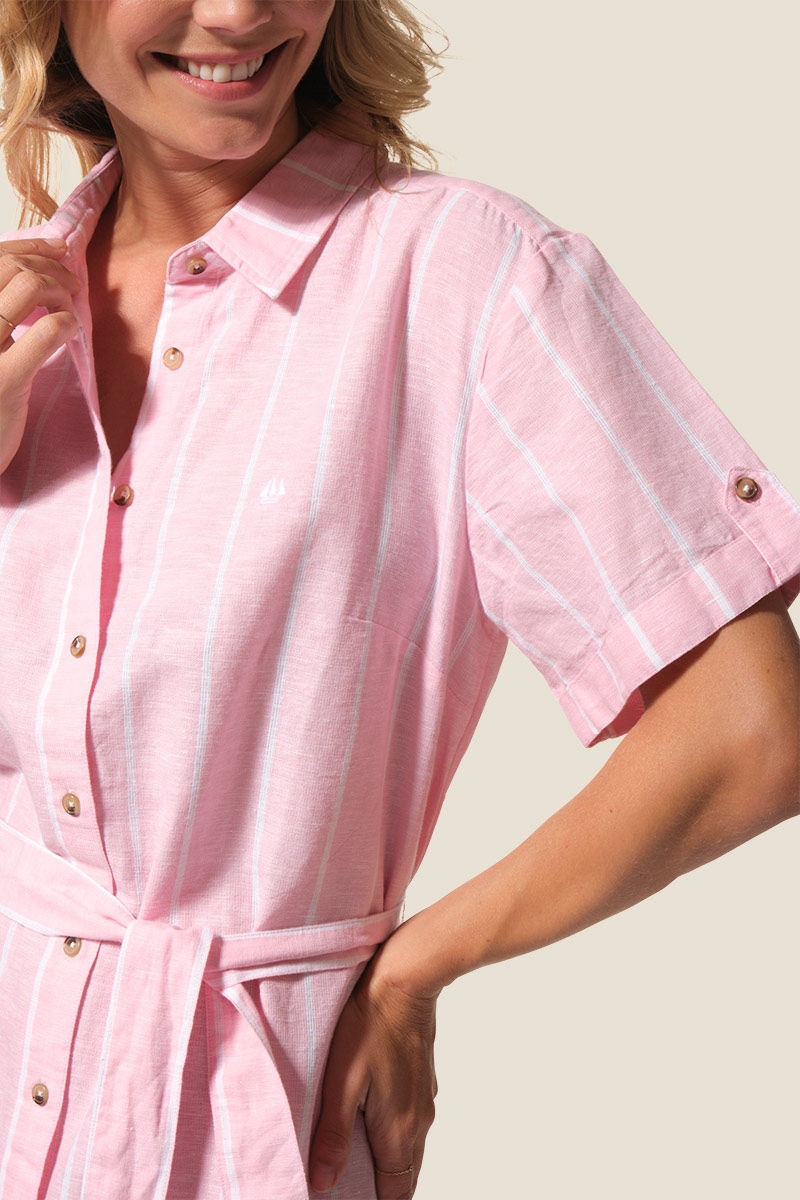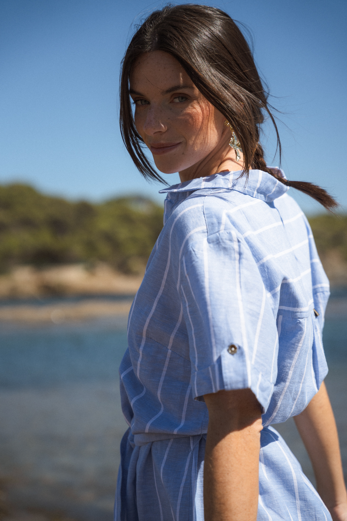 - Coupe légèrement évasée sur le bas et ceinture tissus amovible pour resserrer la taille