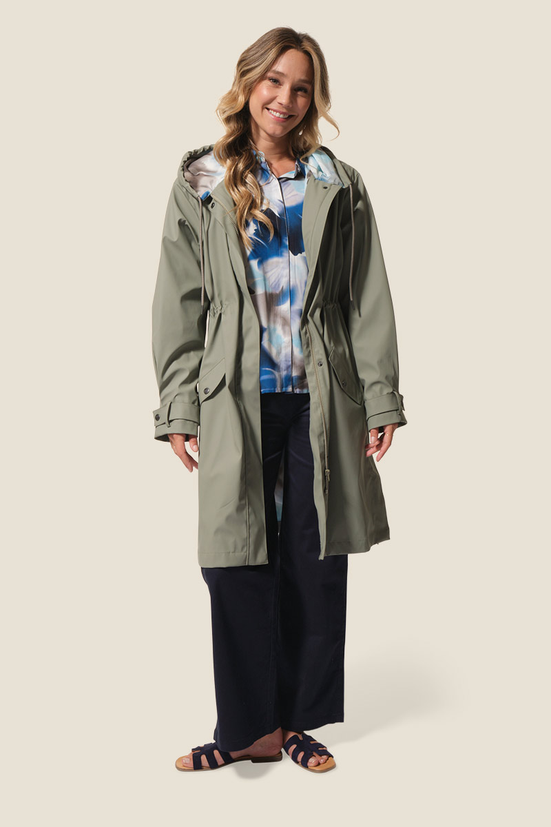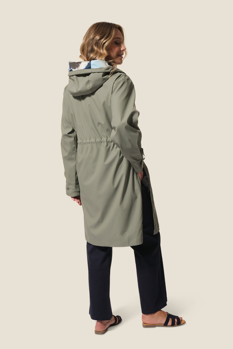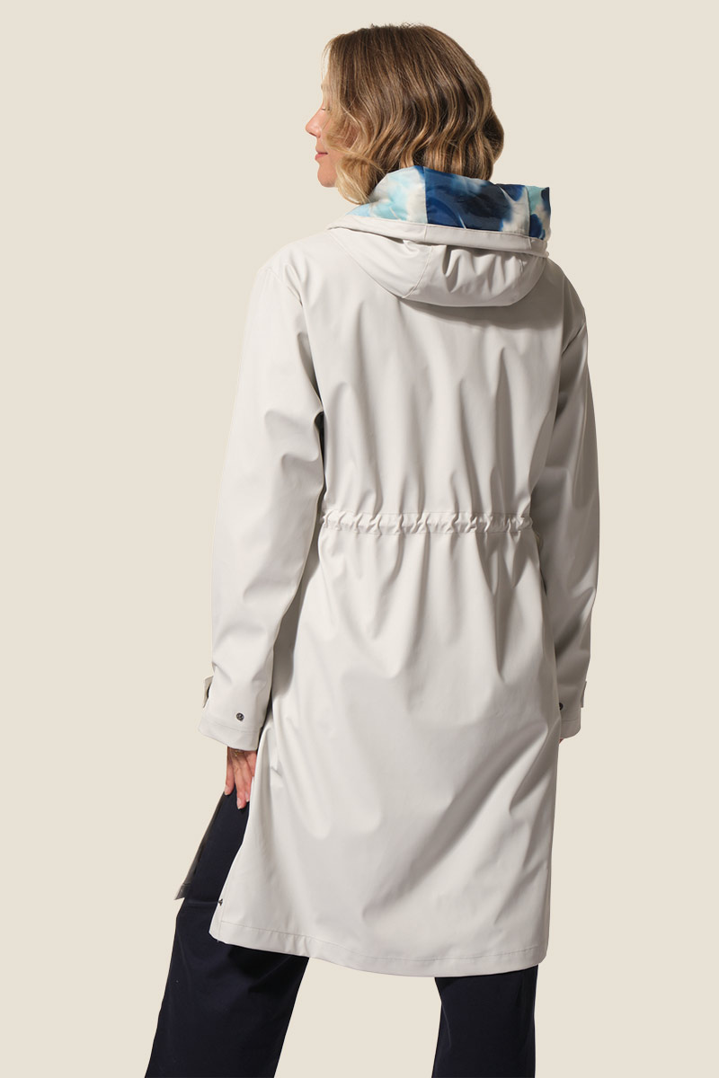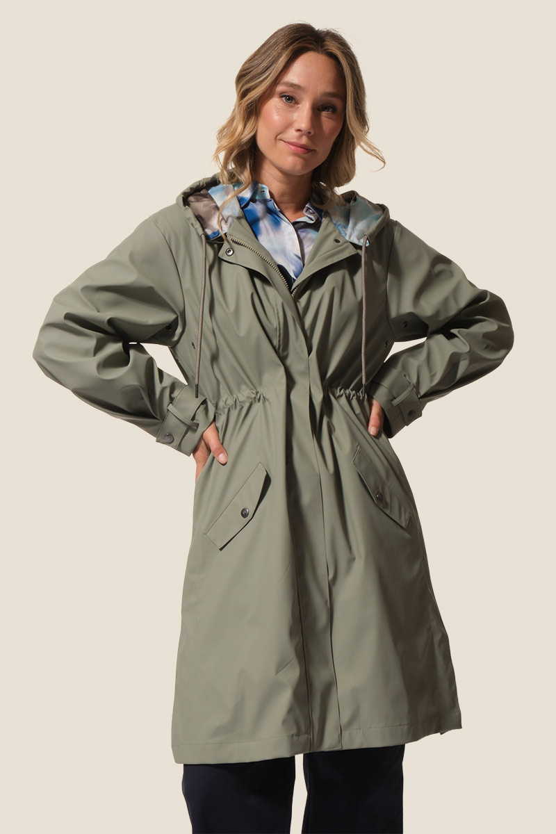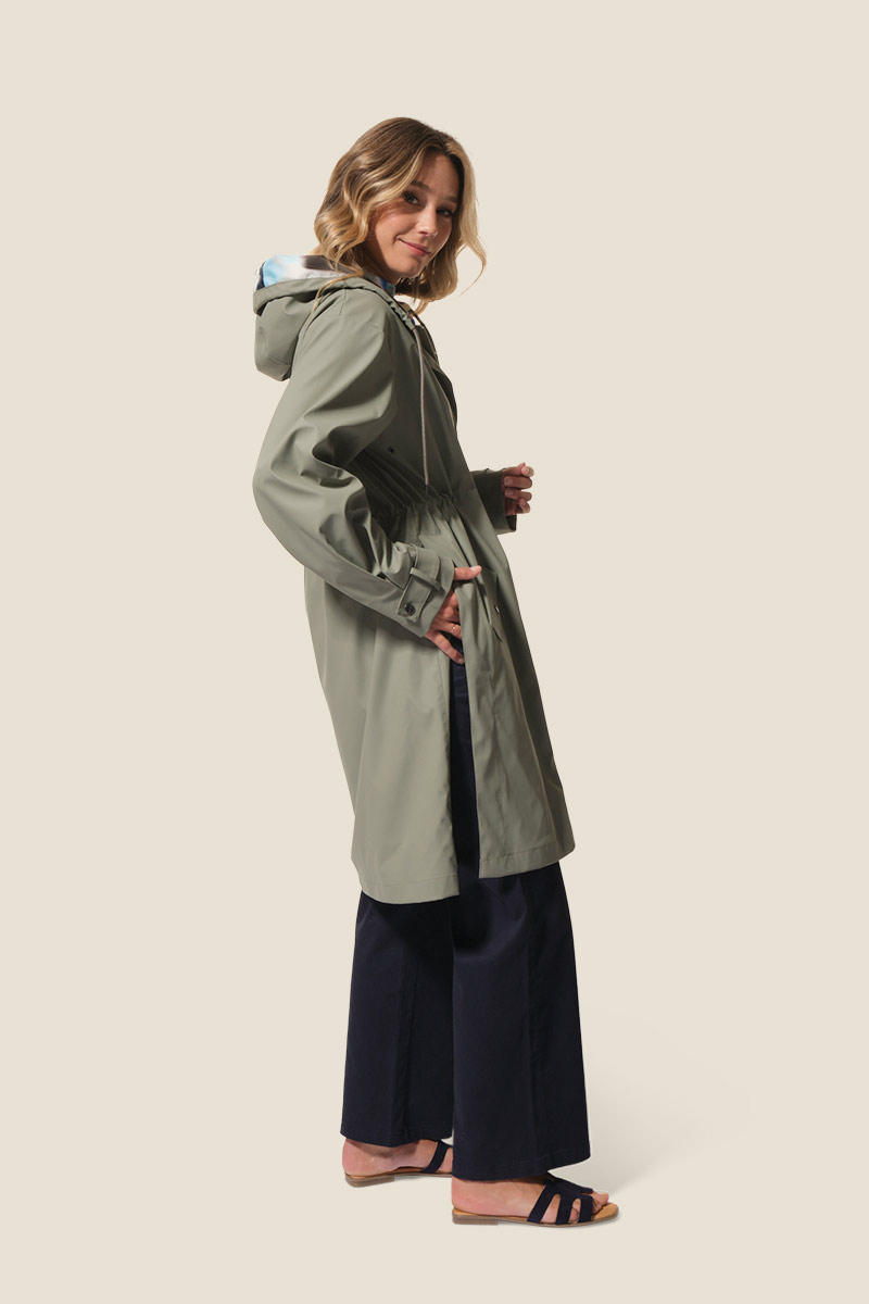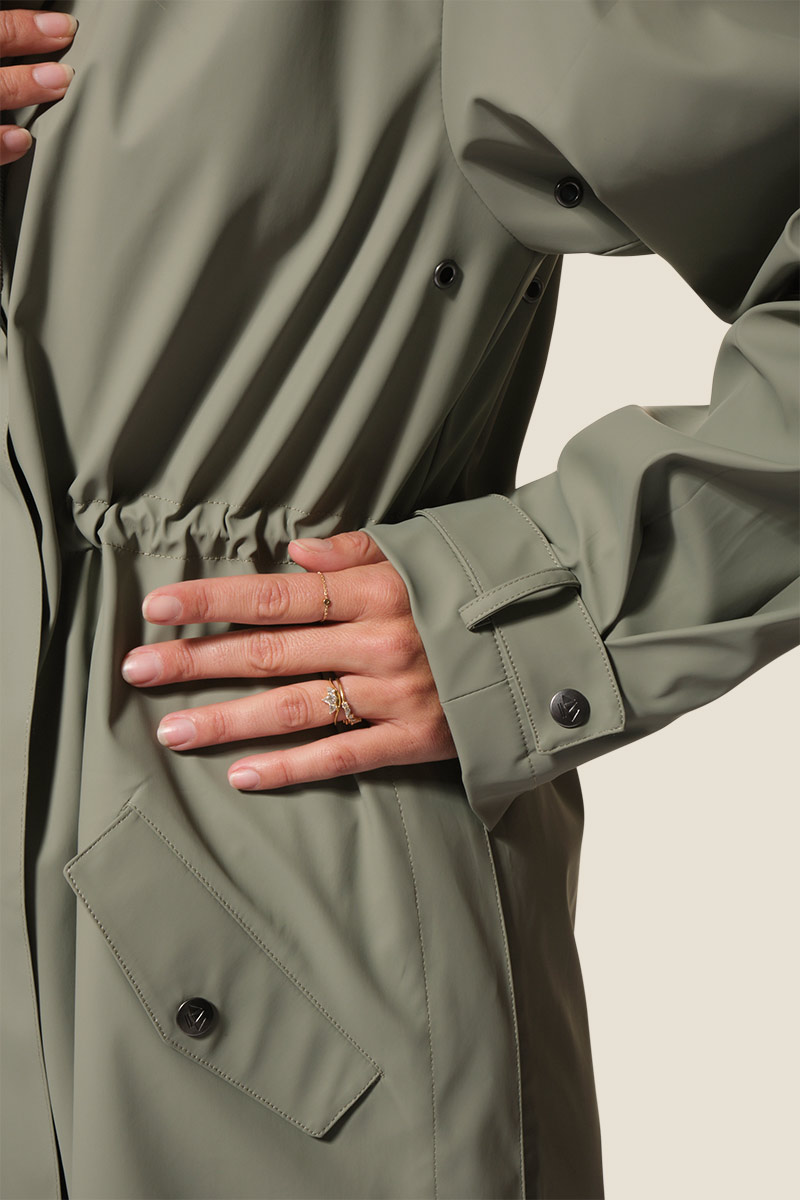- Ciré femme long, coupe ajustée à la taille avec un lien de serrage