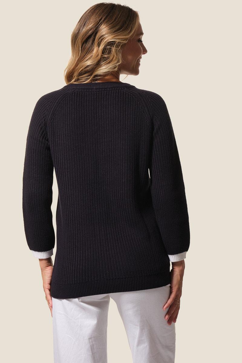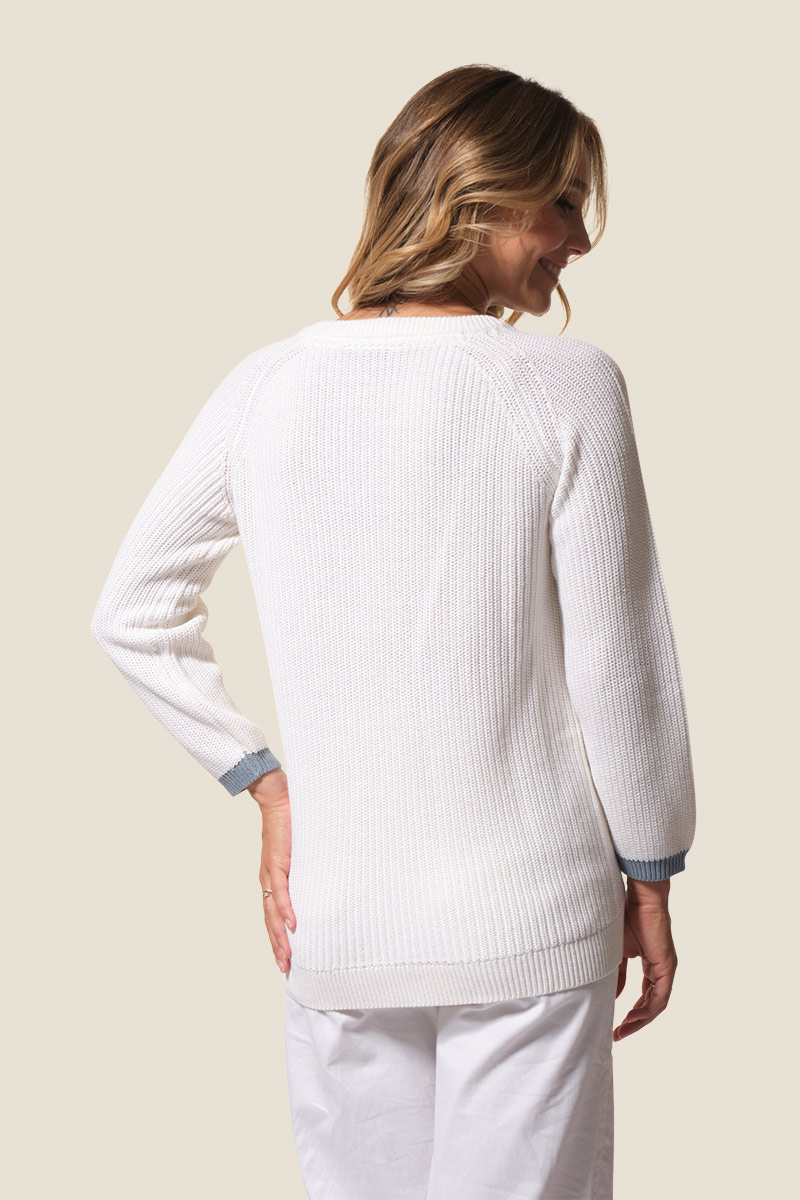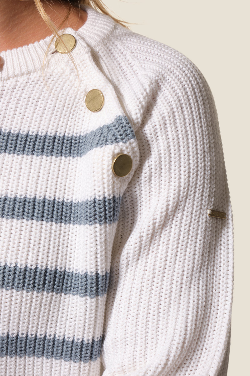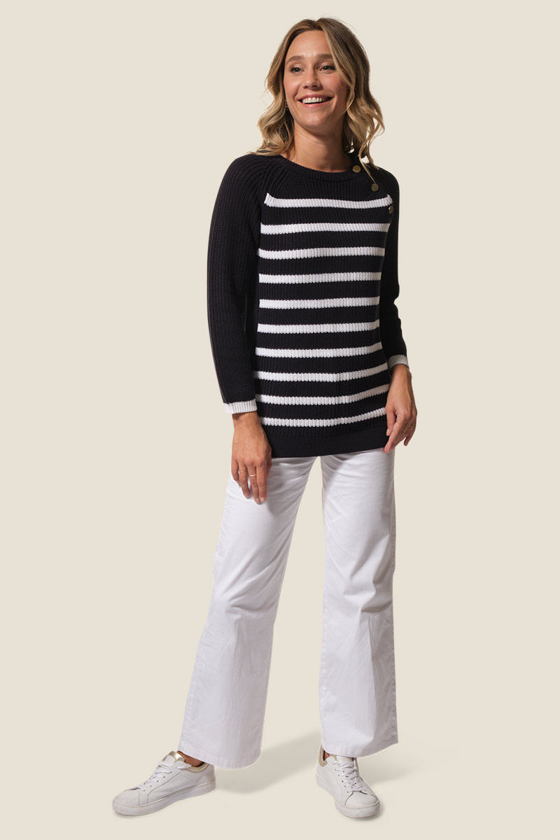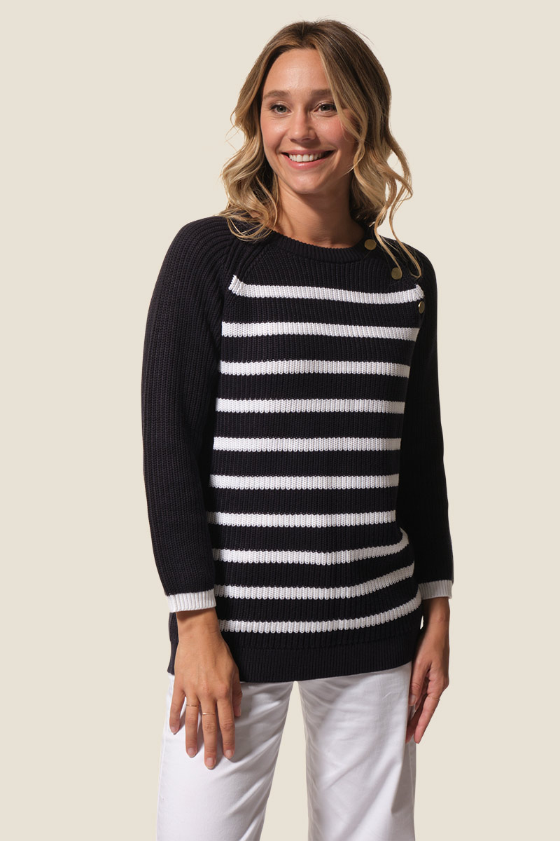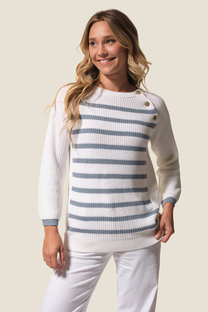 Le pull Françoise est un pull femme à la coupe droite, orné de rayures sur le devant pour un style marin élégant. Confectionné en maille côte perlée, il présente un col rond et des manches raglan 7/8ᵉ avec patte et boutons fantaisie sur le côté gauche. Une plaque logo dorée cousue sur la manche gauche signe ce modèle féminin et raffiné.