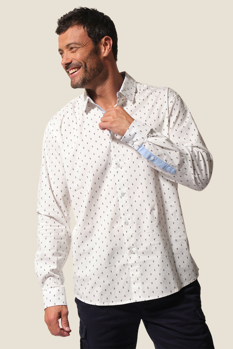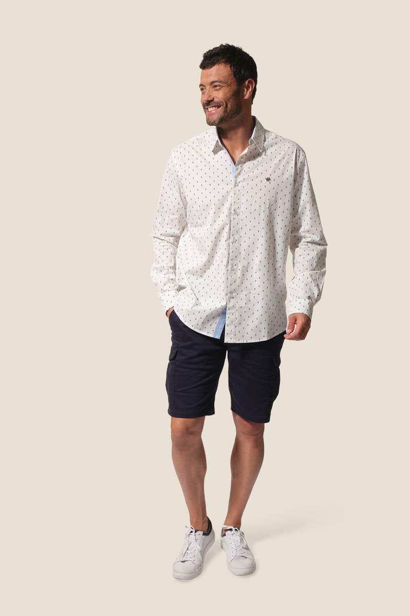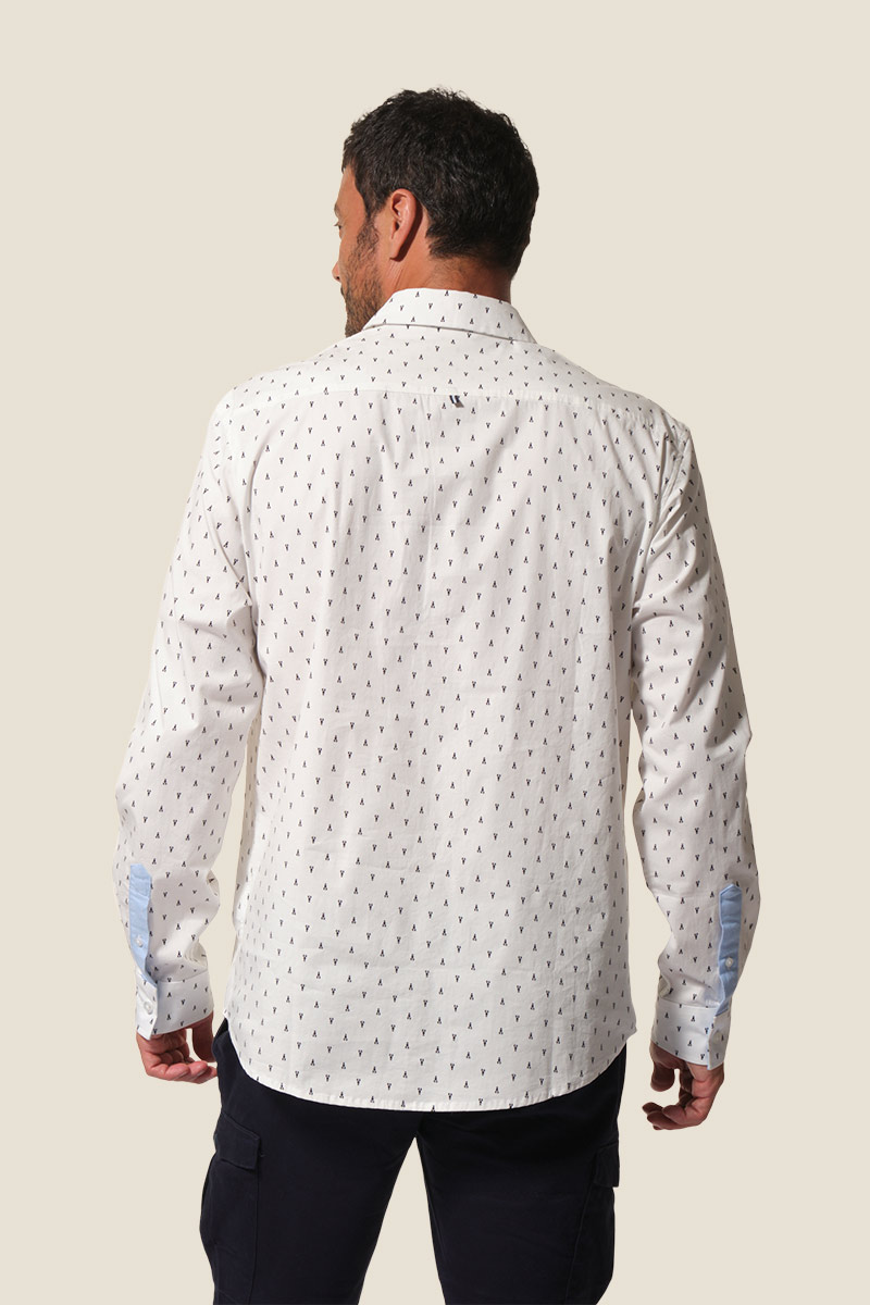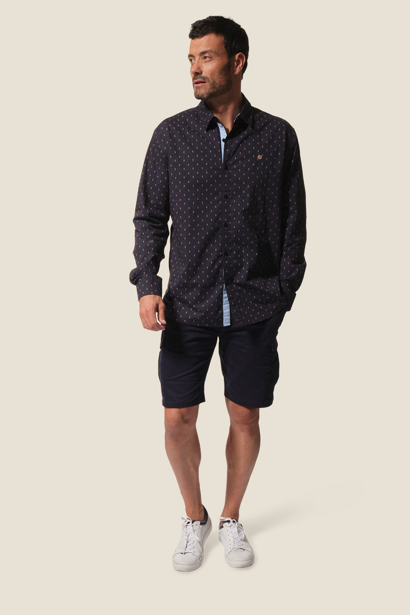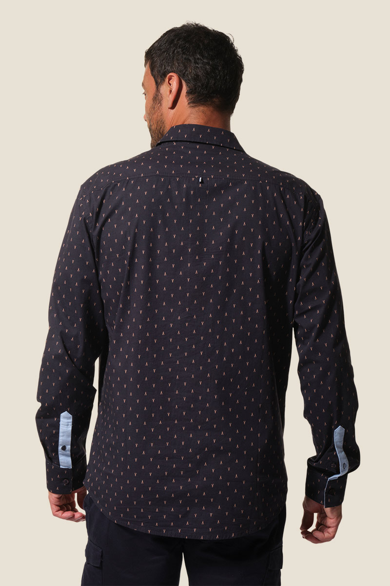 - Détail dans le tissu en chambray pour la finition du pied de col intérieur, la patte capucin manche, l’intérieur de la patte de boutonnage et l’intérieur du poignet