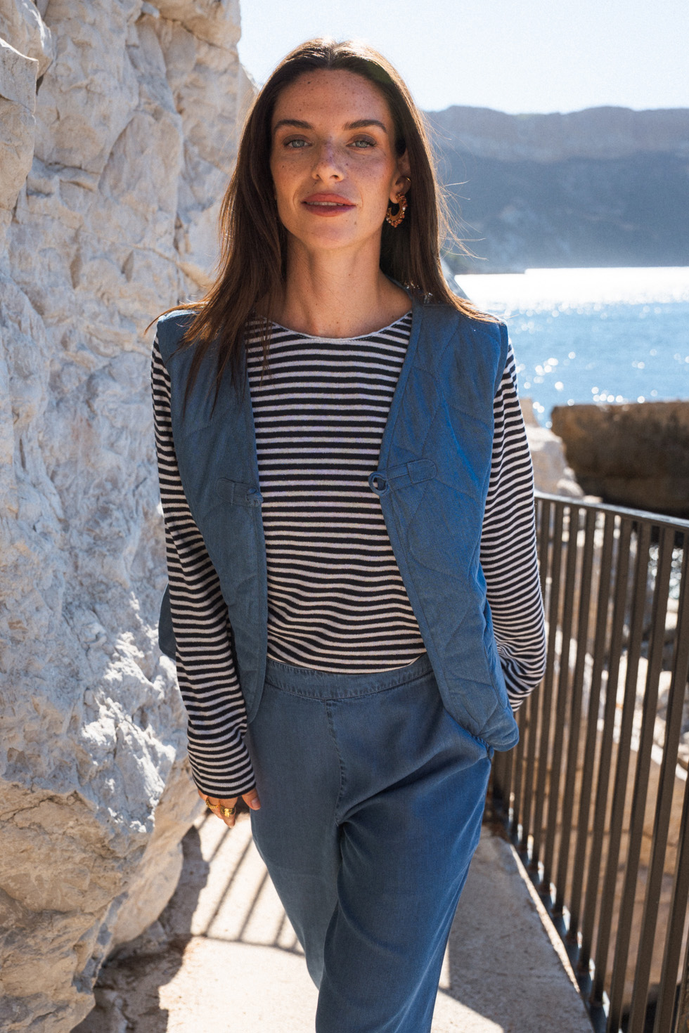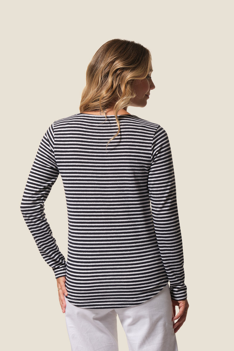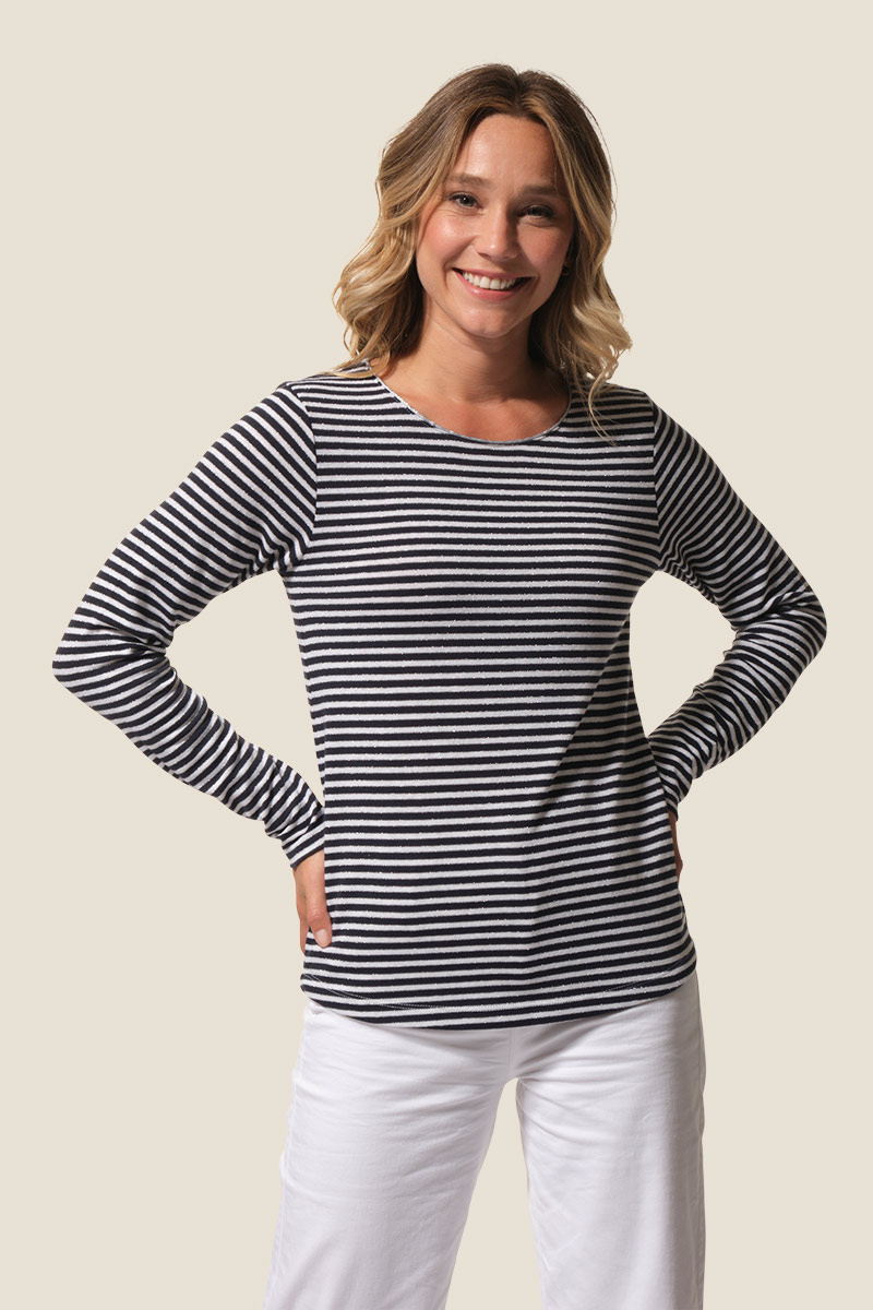 La marinière Beretta est un tee-shirt femme à manches longues au style marin revisité. Ses rayures en fil métallisé apportent une touche lumineuse et élégante, tandis que son col rond et son logo brodé sur l’épaule signent un look moderne et raffiné.