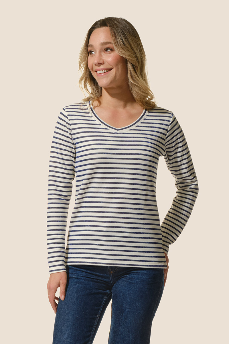 Le tee-shirt Alice est un tee-shirt femme à manches longues à la coupe ajustée, qui met élégamment la silhouette en valeur. Son encolure en V et ses rayures en fil métallisé apportent une touche féminine et lumineuse. Les fentes sur les côtés et le logo brodé sur la manche gauche complètent ce modèle au style marin raffiné.
