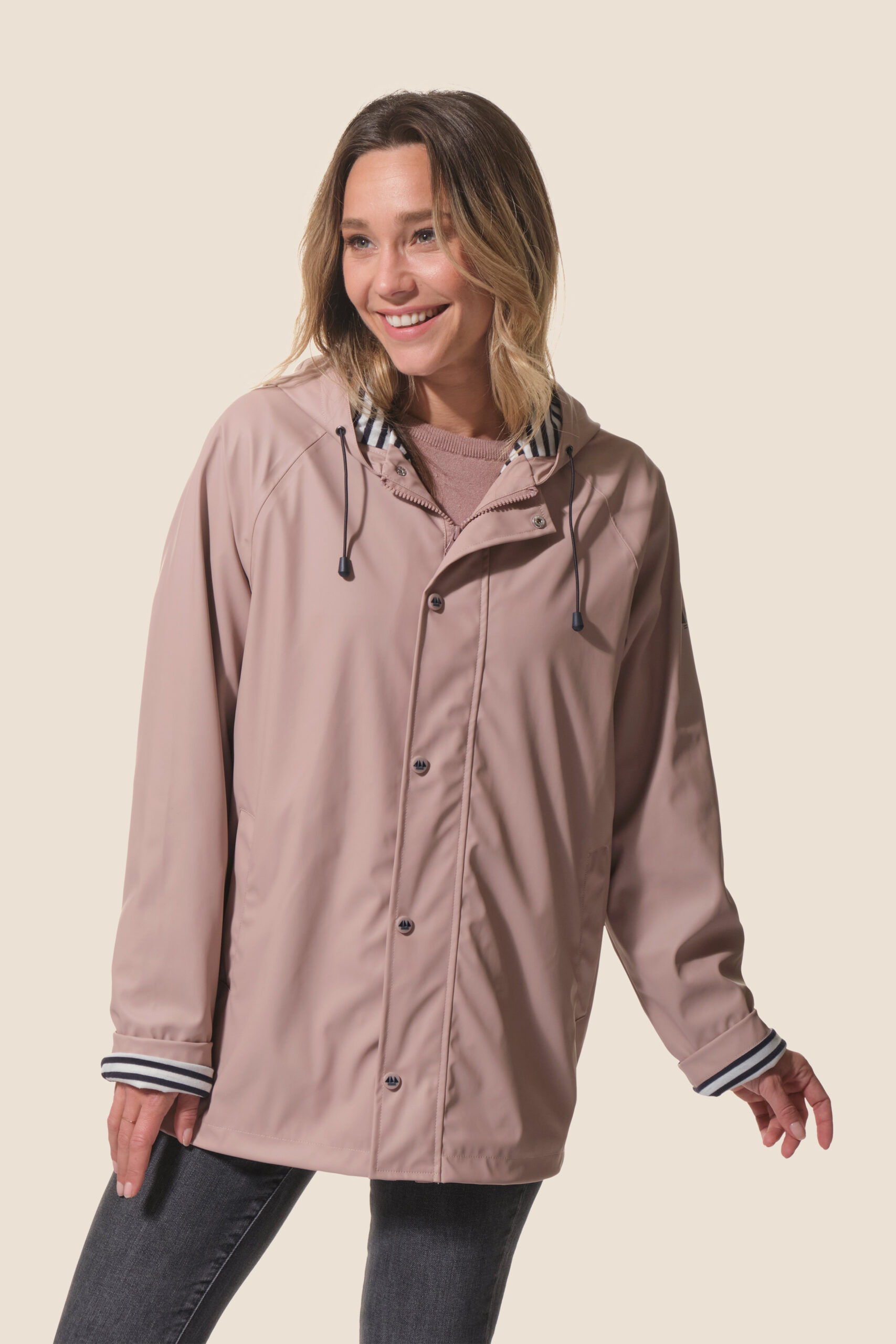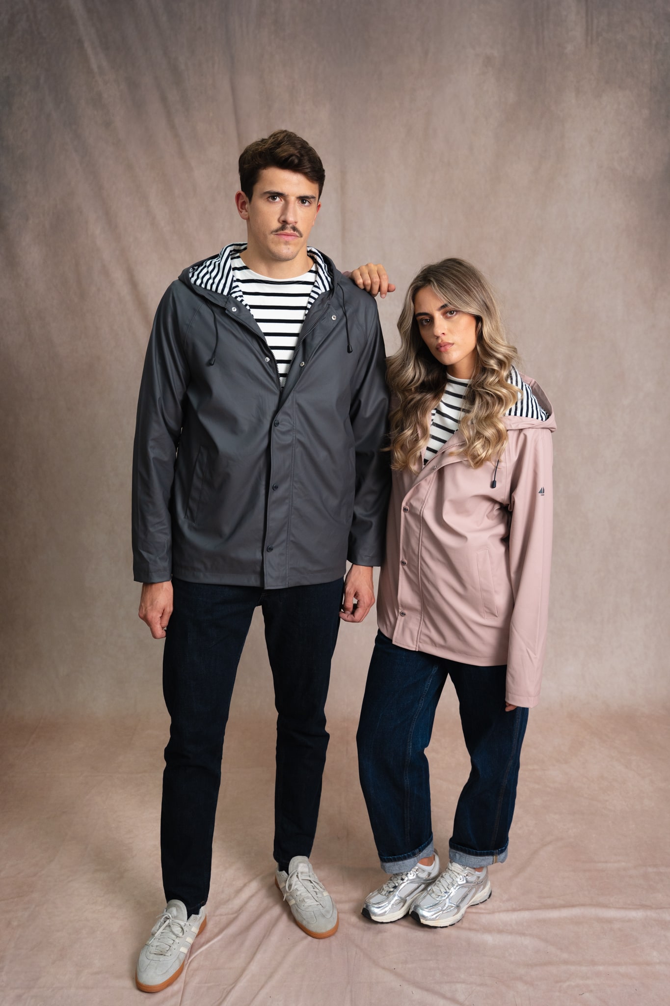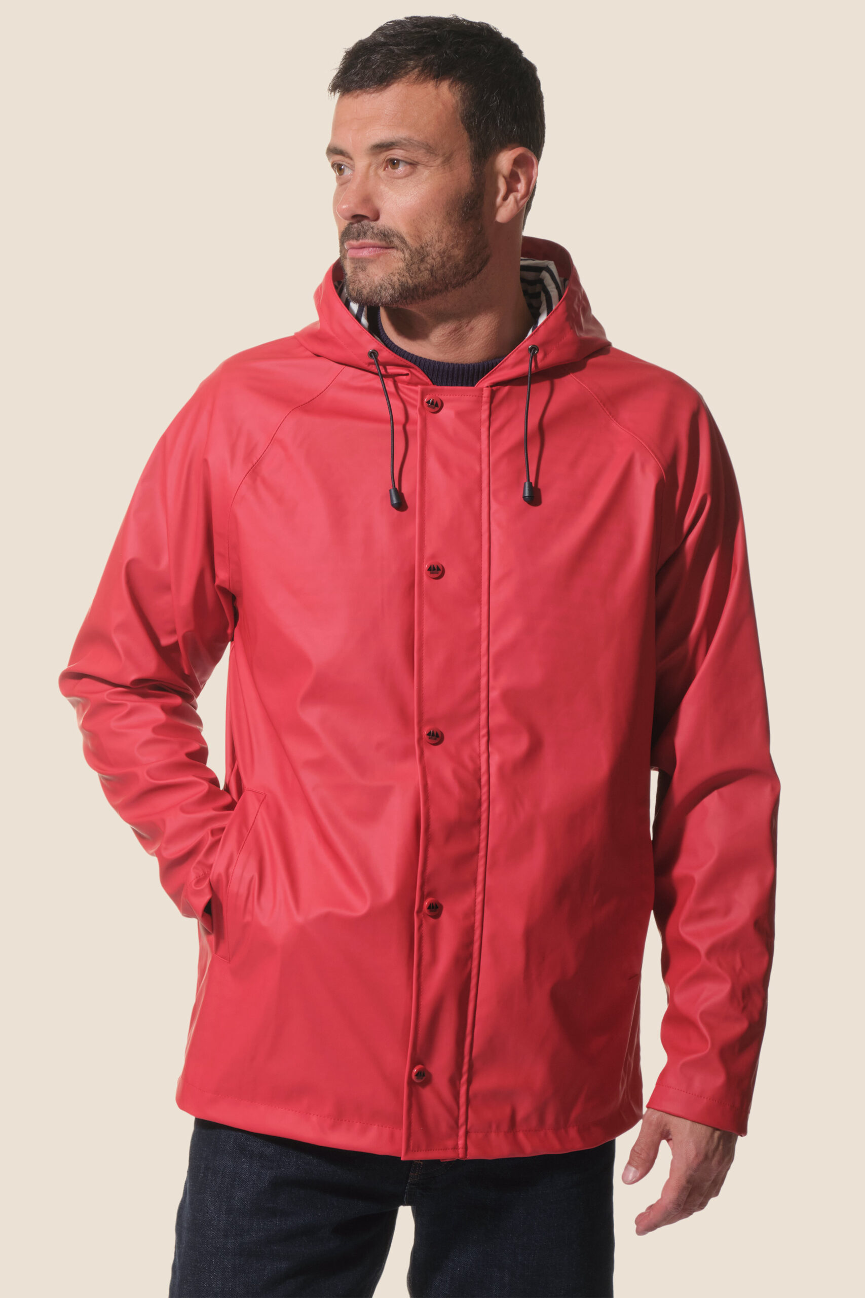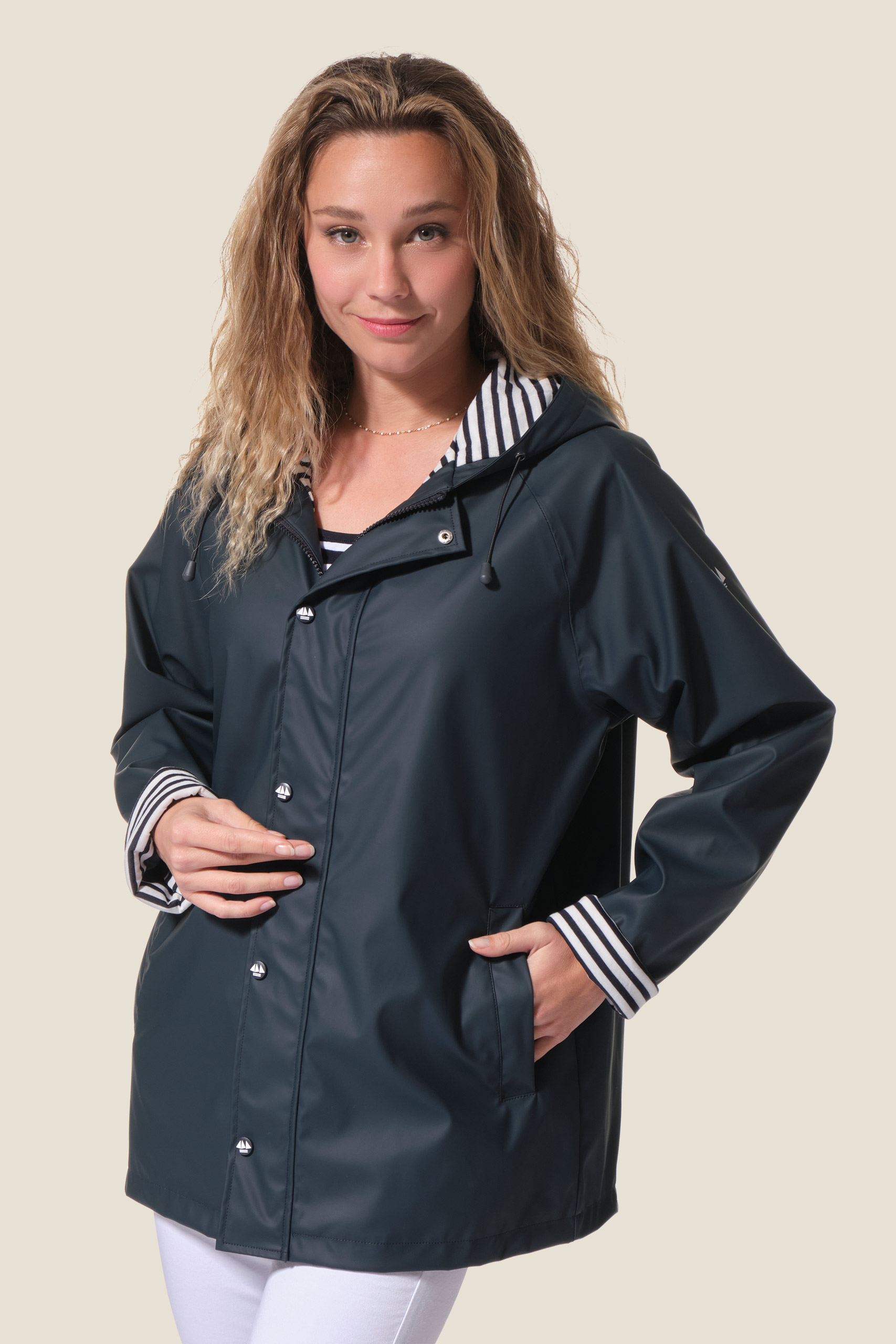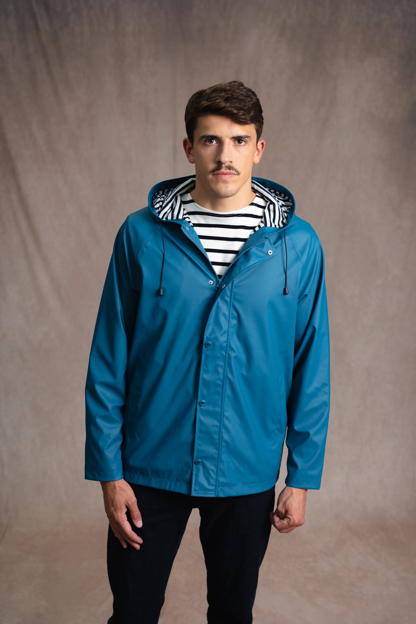 Restez au sec avec notre ciré authentique marin Proue. Sa doublure en jersey rayé apporte douceur et confort, tandis que sa coupe droite et sa capuche ajustable vous protègent efficacement sous la pluie.