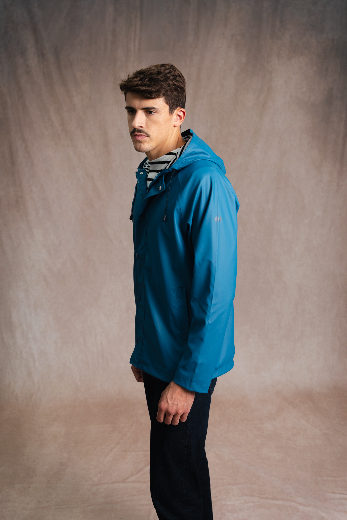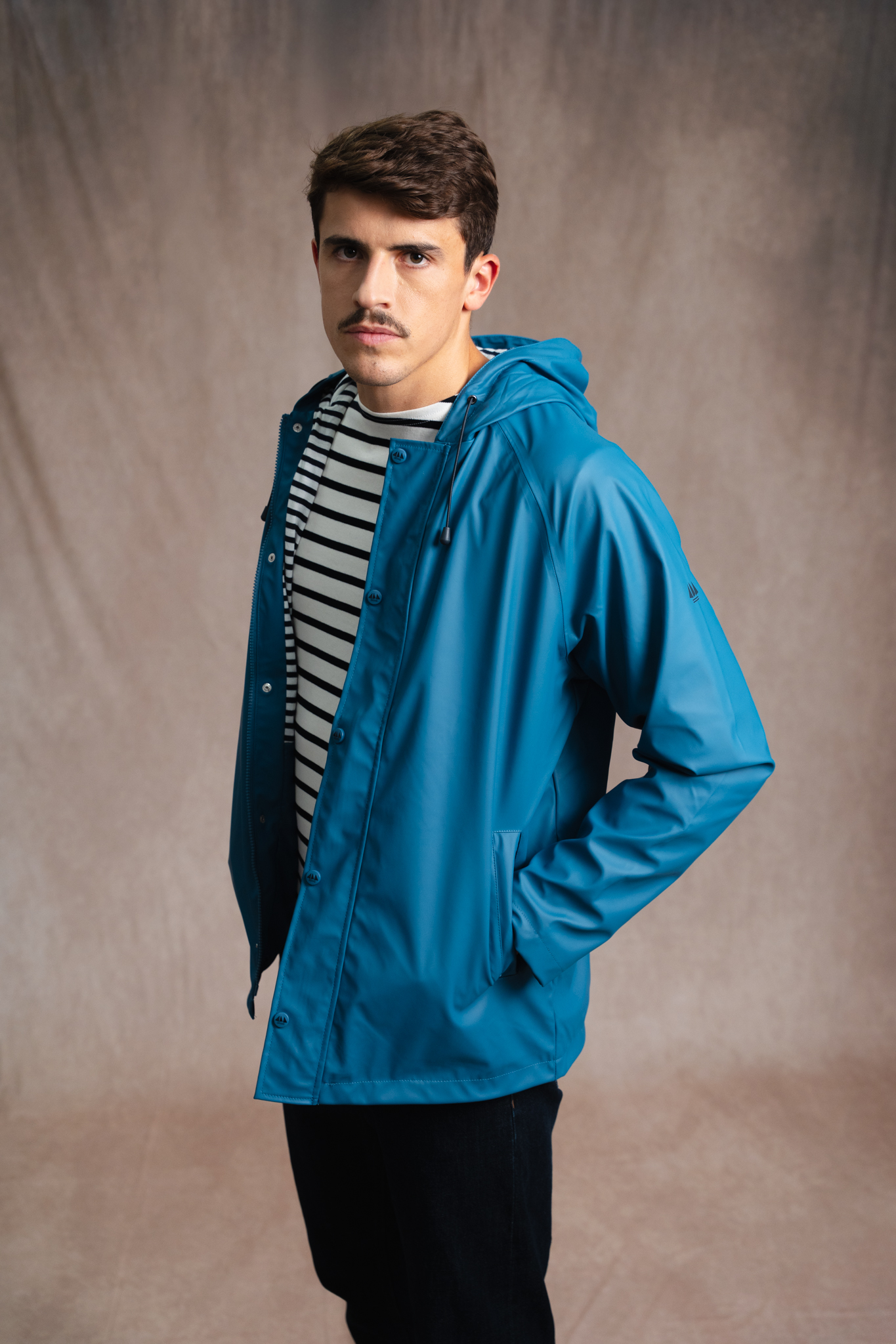 Restez au sec avec notre ciré authentique marin Proue. Sa doublure en jersey rayé apporte douceur et confort, tandis que sa coupe droite et sa capuche ajustable vous protègent efficacement sous la pluie.
