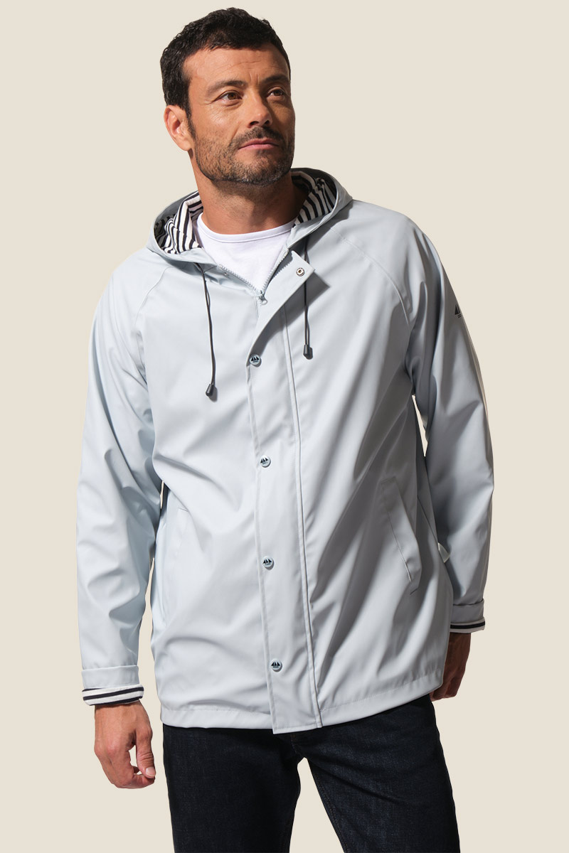 Restez au sec avec notre ciré authentique marin Proue. Sa doublure en jersey rayé apporte douceur et confort, tandis que sa coupe droite et sa capuche ajustable vous protègent efficacement sous la pluie.