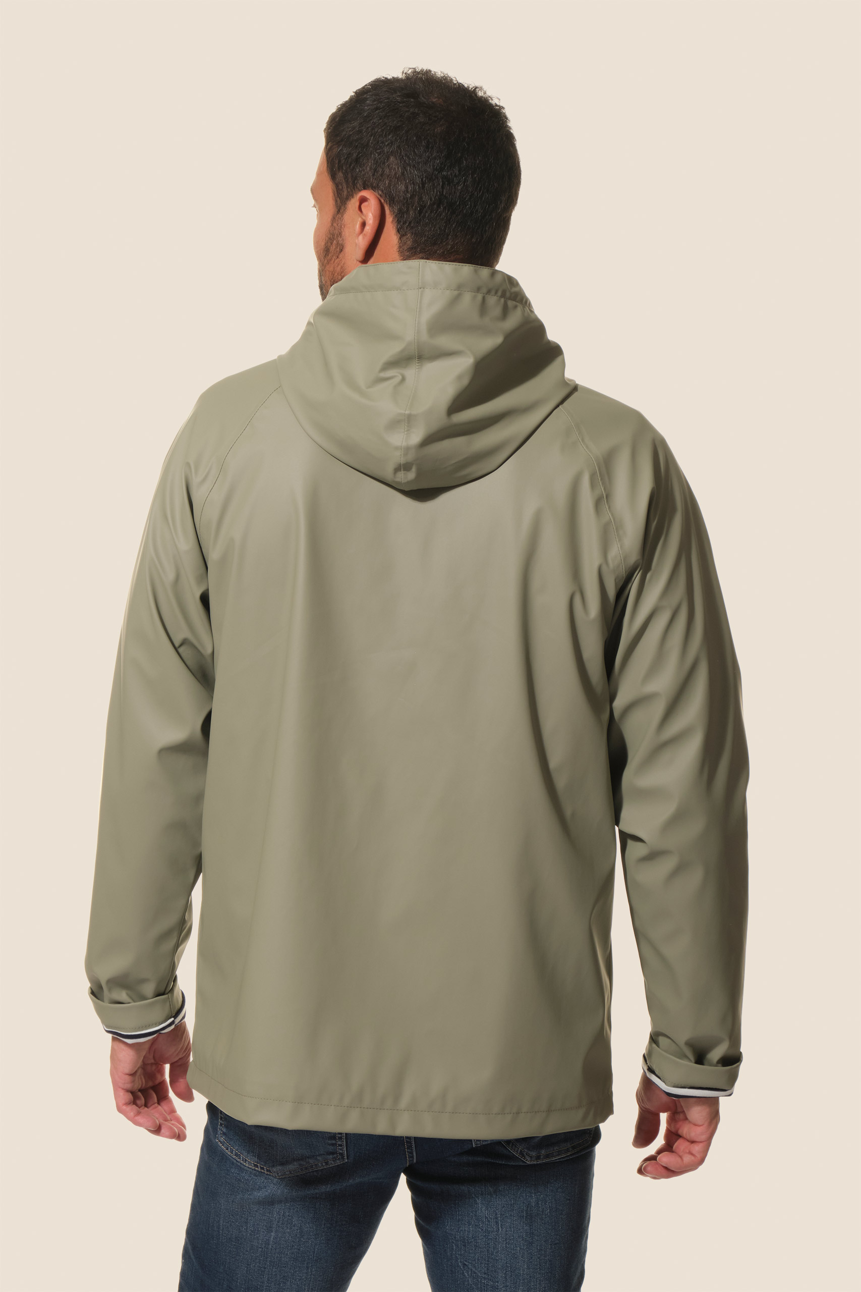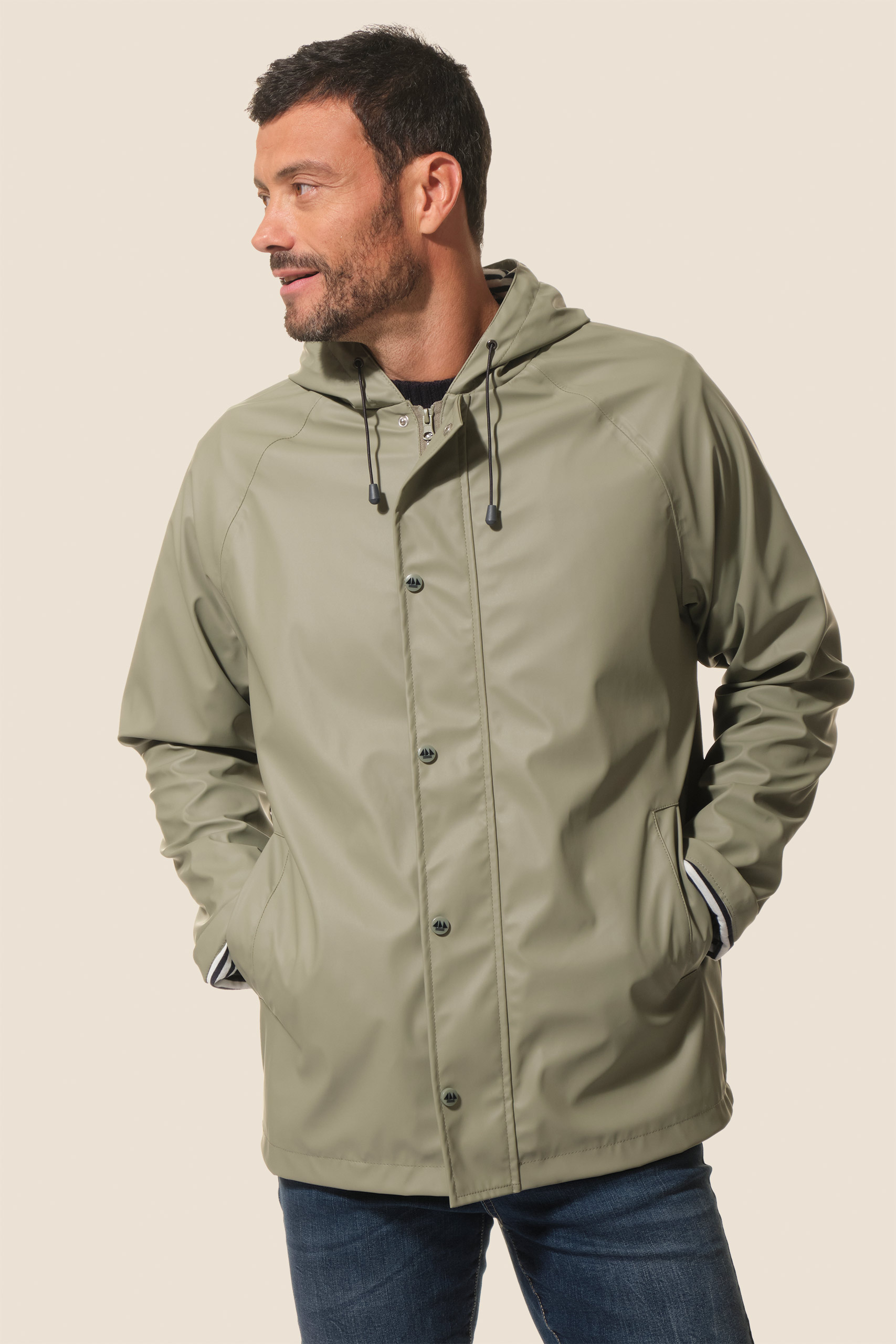 Restez au sec avec notre ciré authentique marin Proue. Sa doublure en jersey rayé apporte douceur et confort, tandis que sa coupe droite et sa capuche ajustable vous protègent efficacement sous la pluie.
