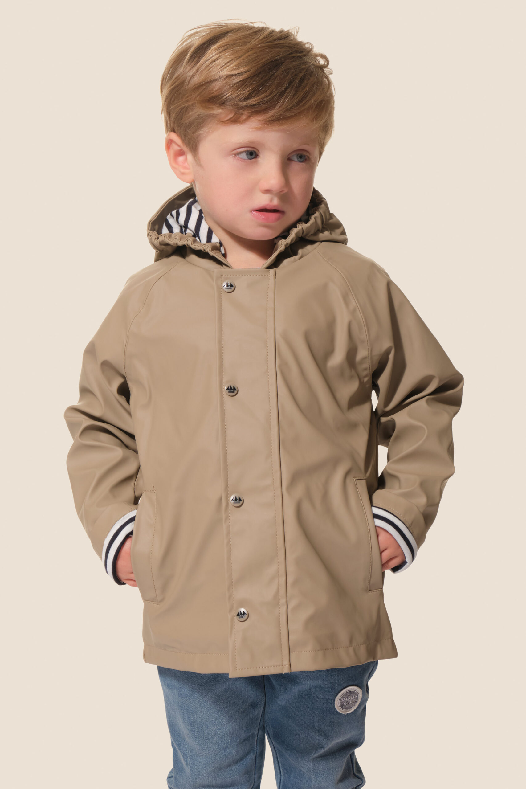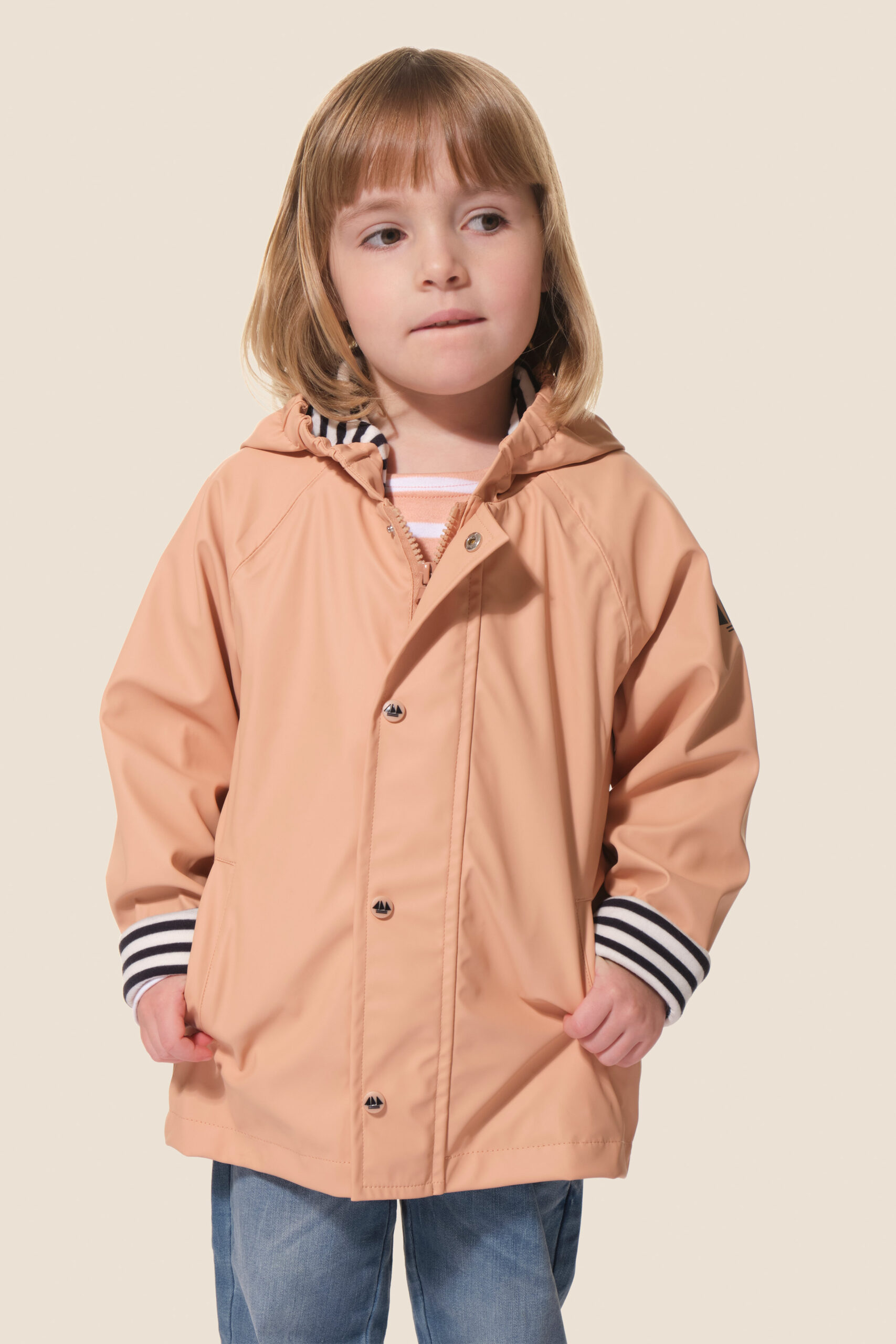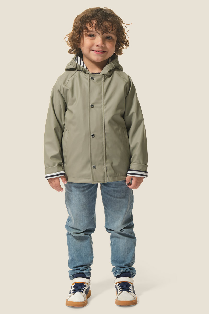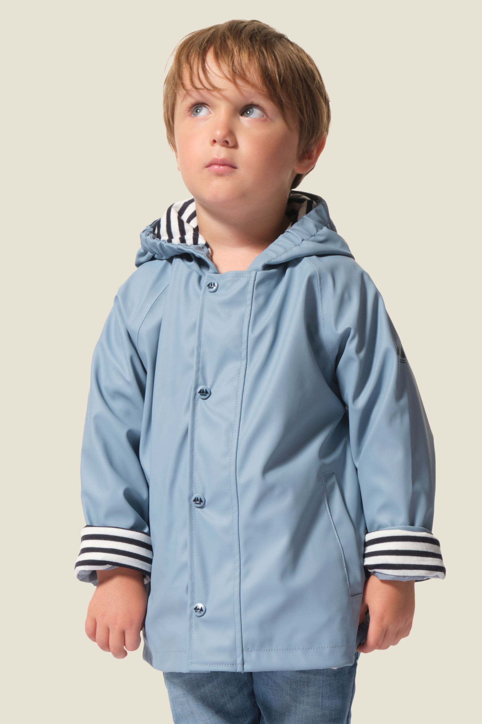 • Capuche doublée en jersey rayé avec cordon élastique