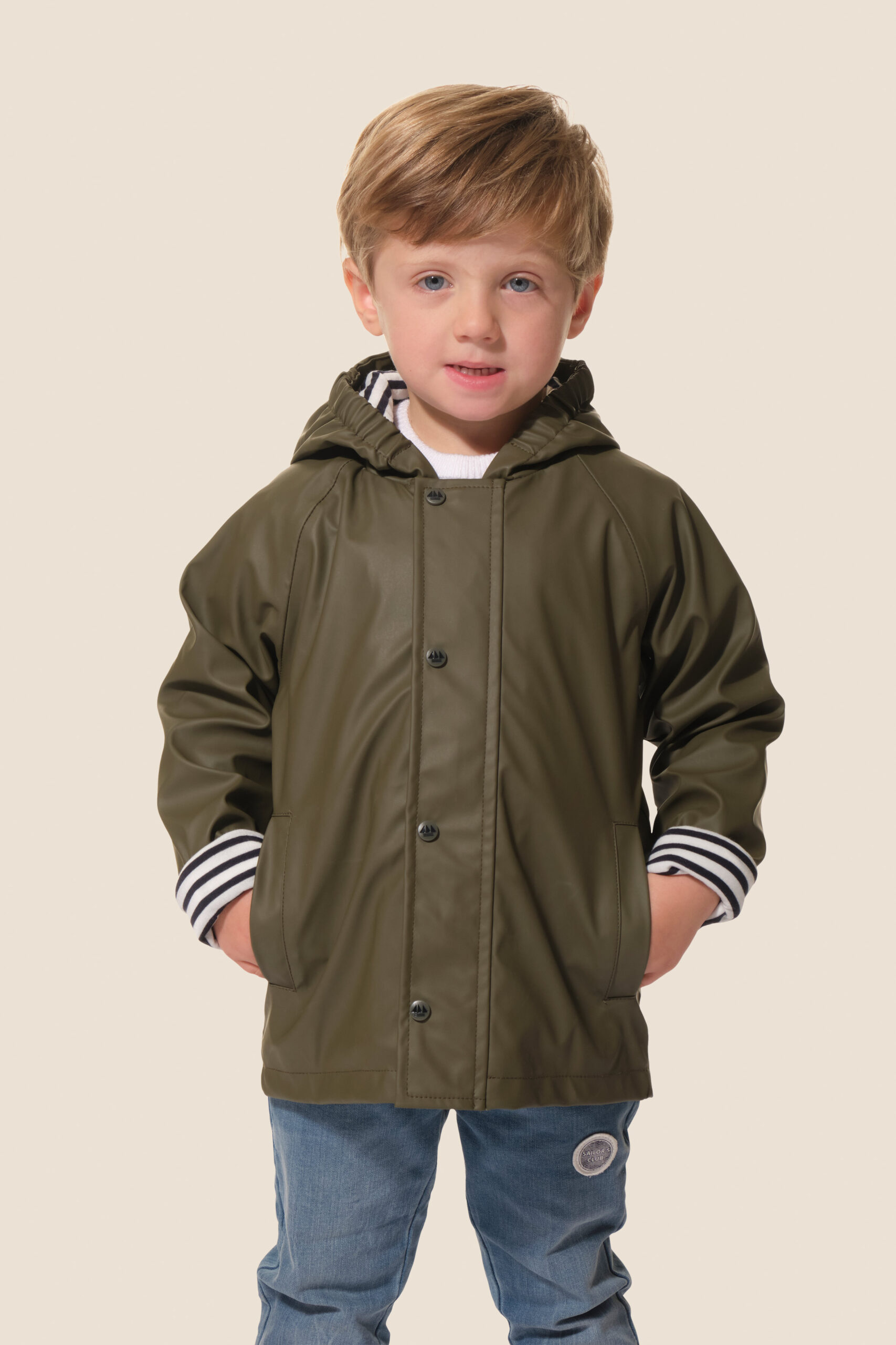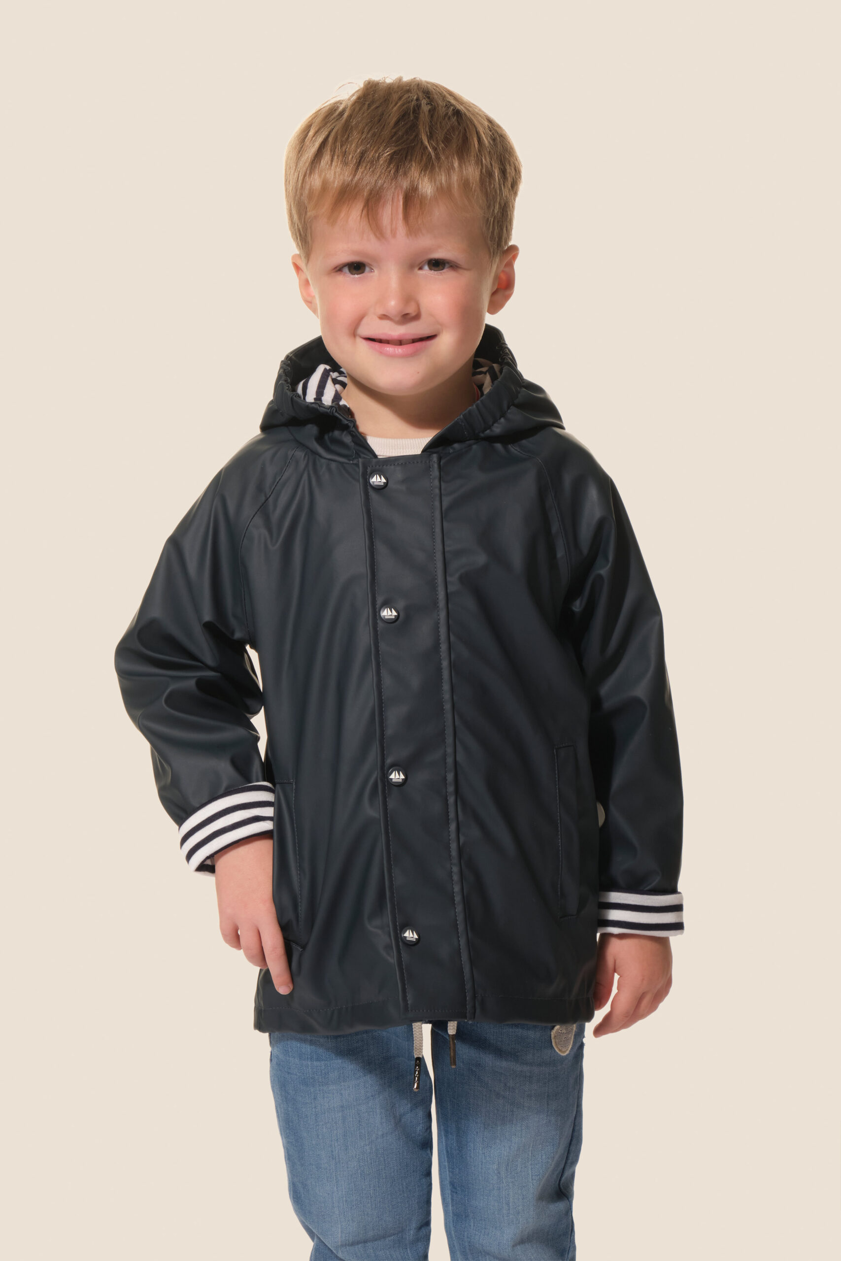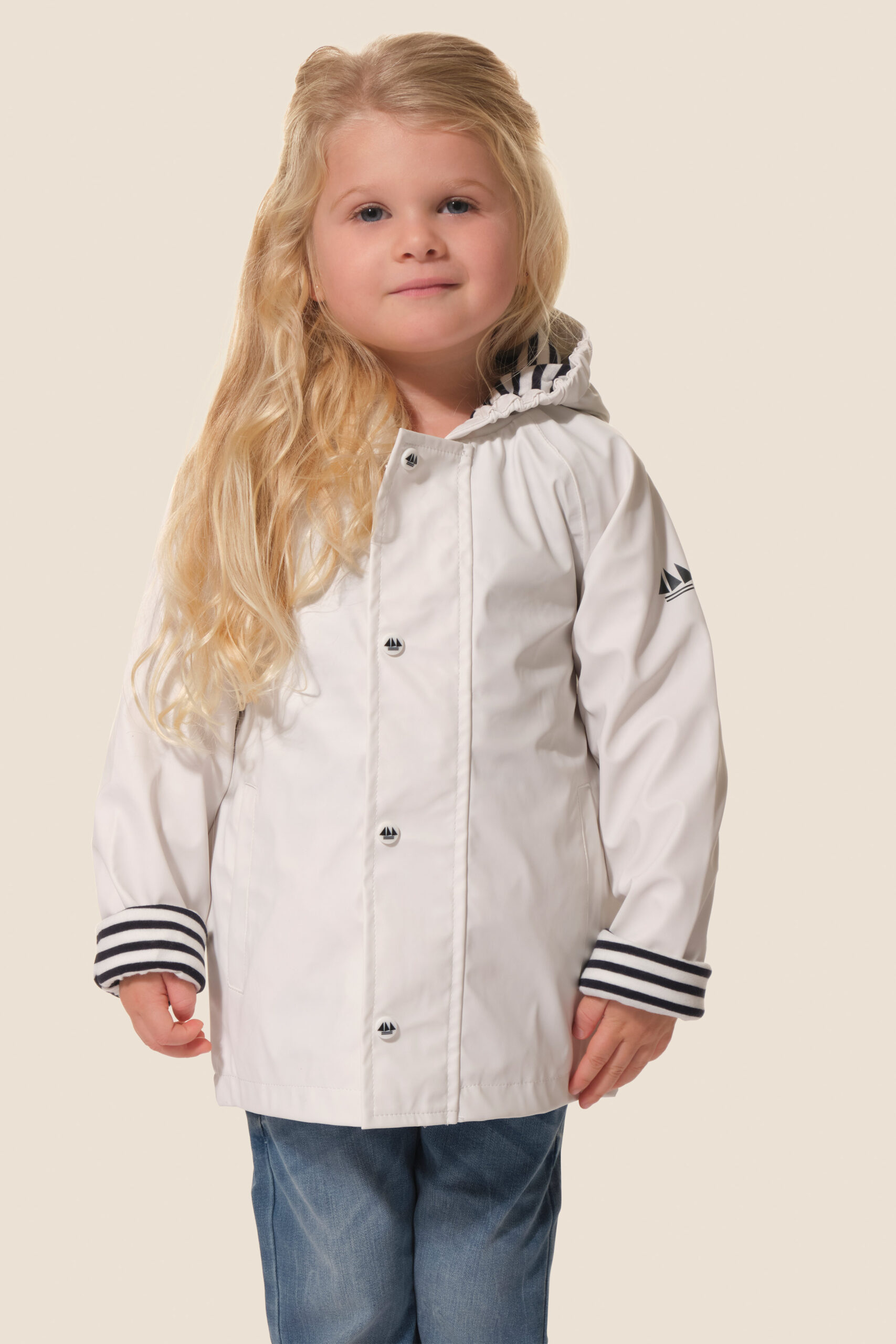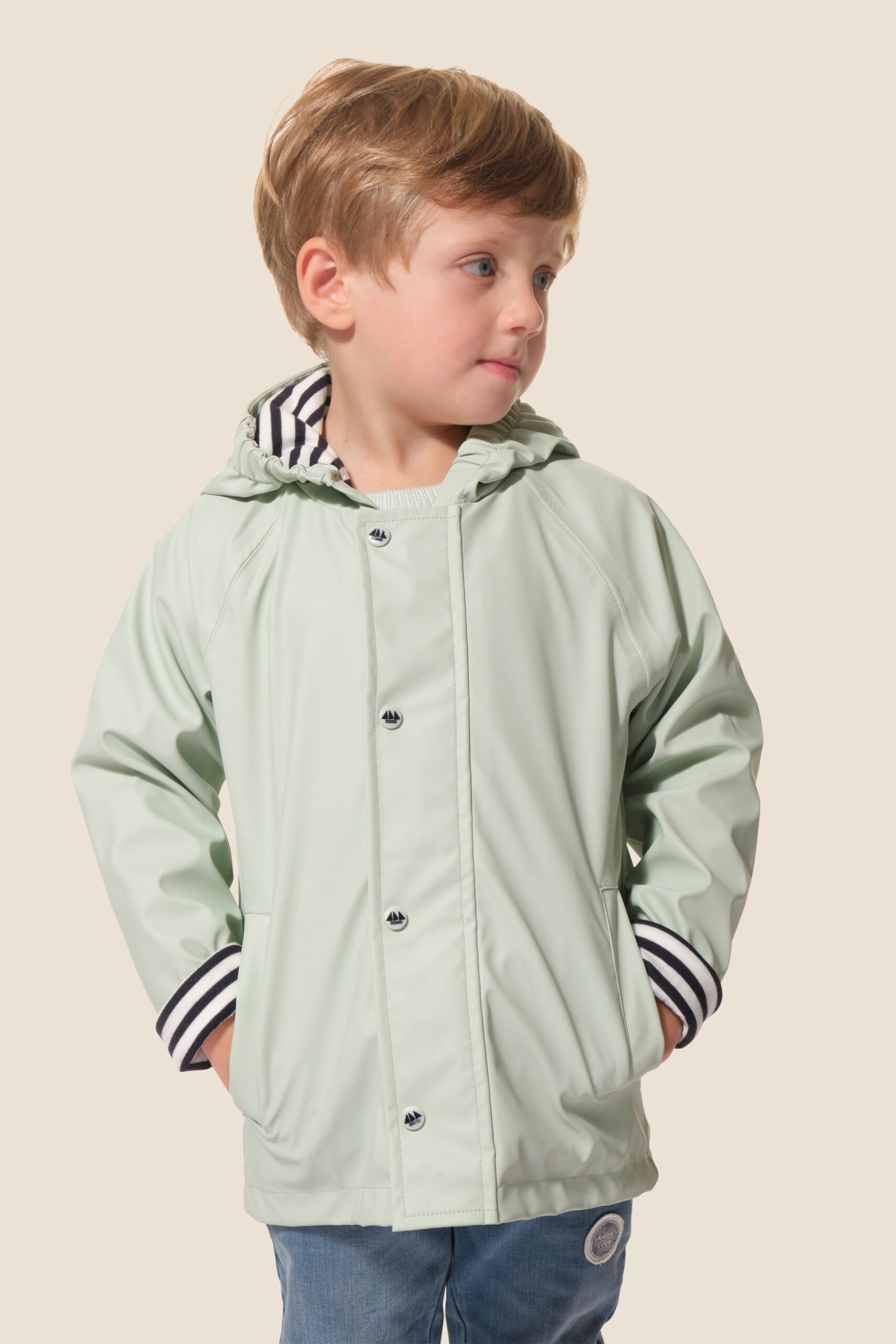 • Capuche doublée en jersey rayé avec cordon élastique