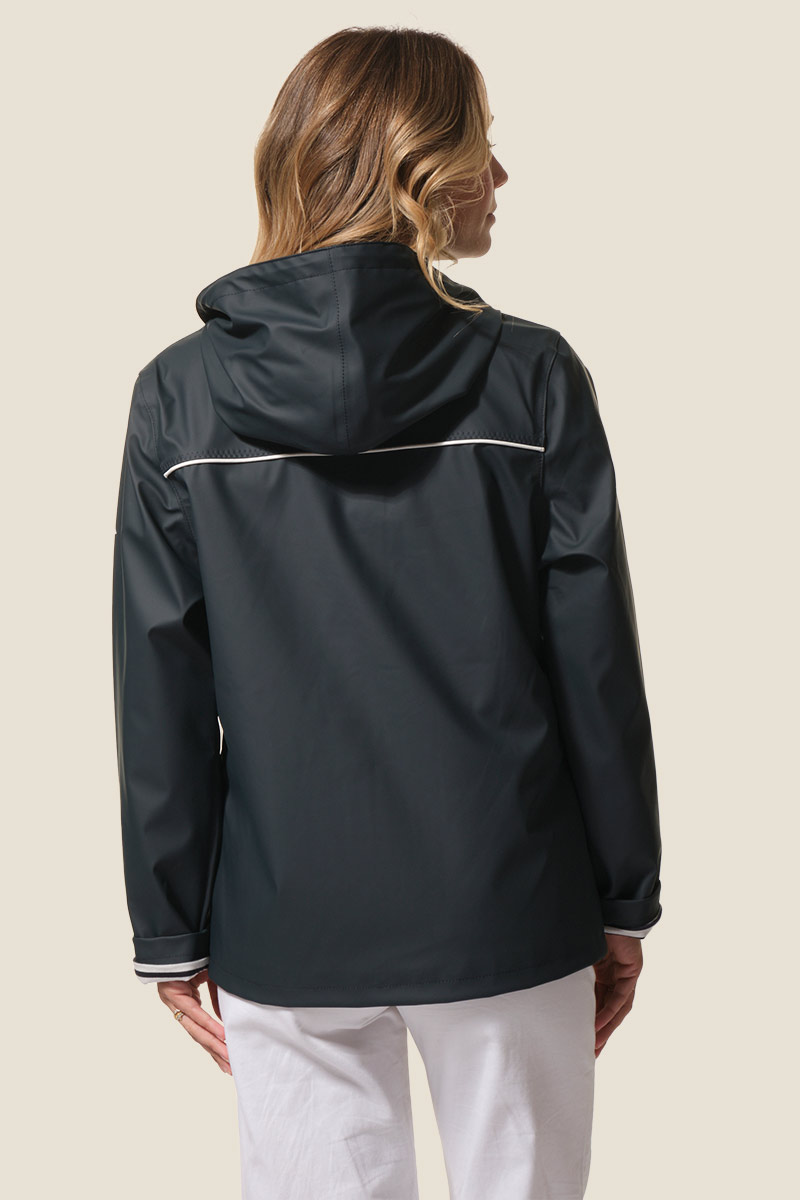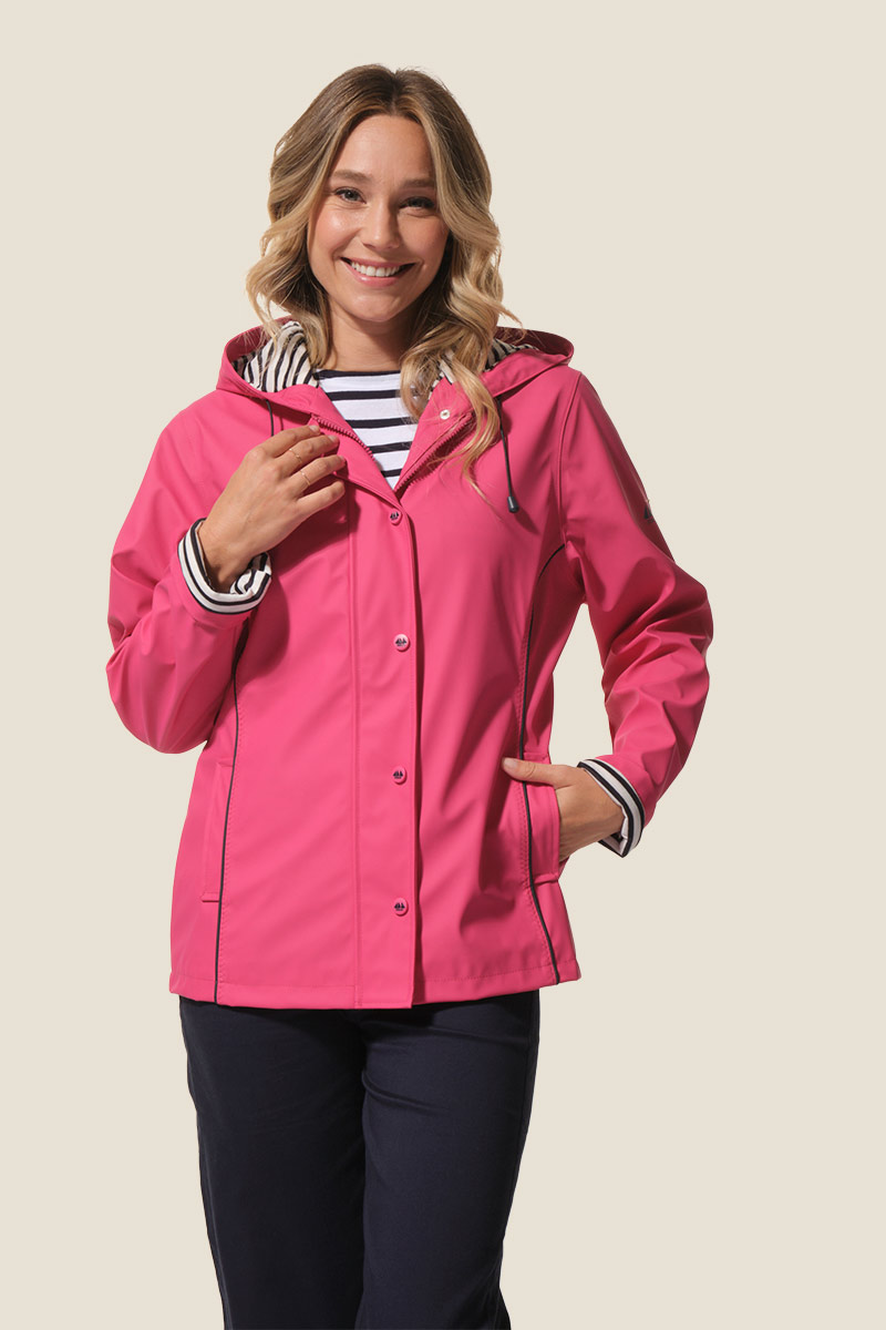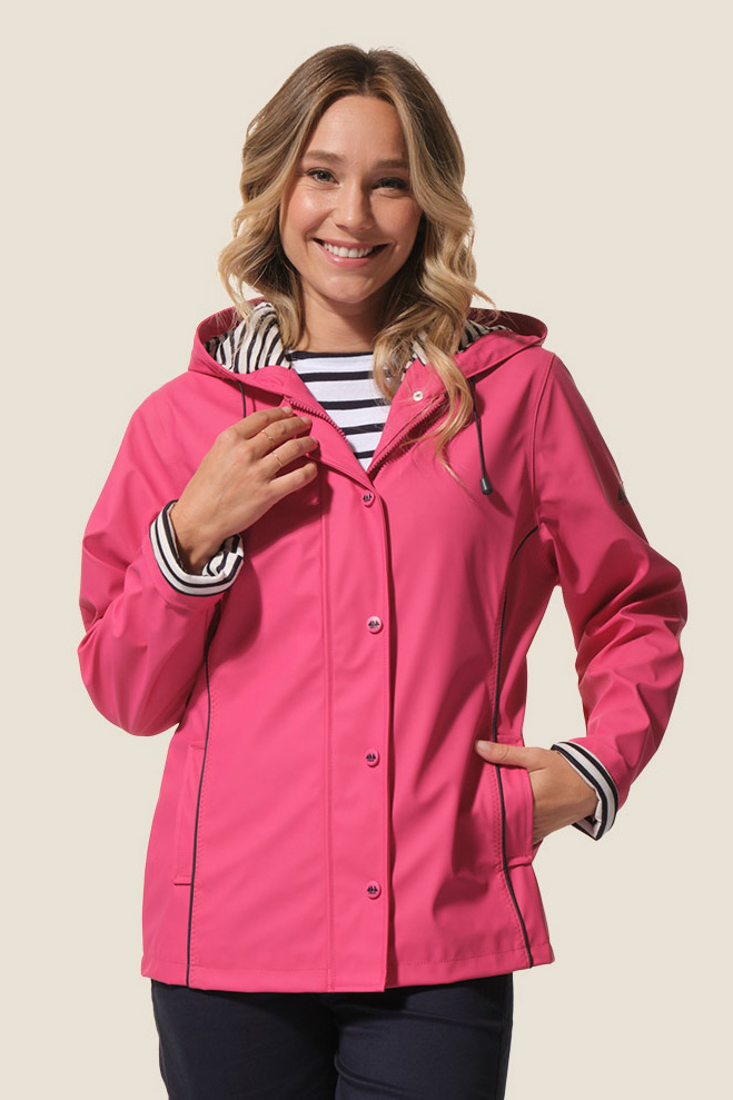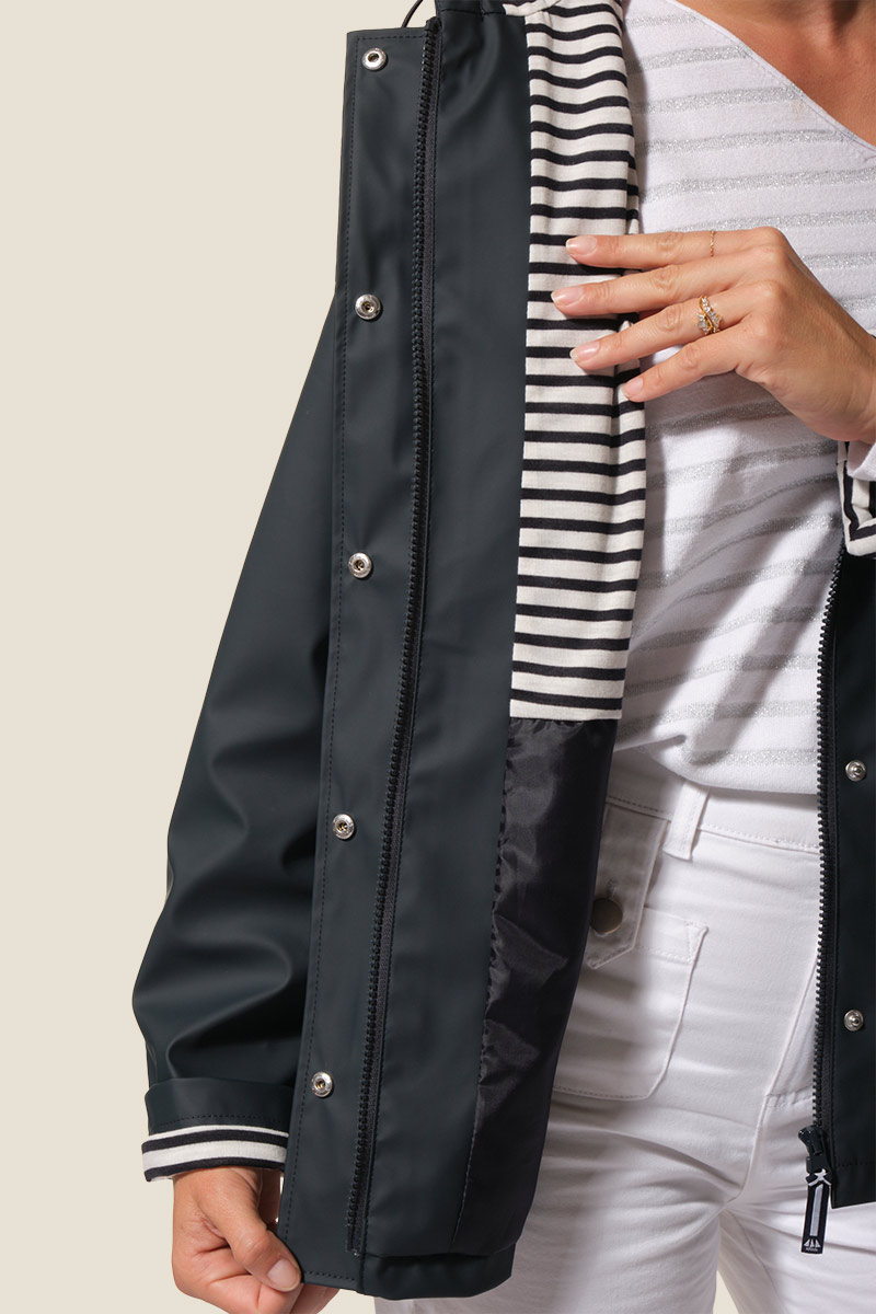 Le ciré Nadège est un ciré court pour femme à la coupe légèrement ajustée, soulignée par des découpes et des passepoils contrastants. Doté d’une capuche doublée jersey rayé, de poches passepoilées et d’une fermeture zippée sous patte à boutons-pression, il allie style et confort. Ses coutures étanches et son imperméabilité 5000 mm assurent une protection efficace contre la pluie. ☔
