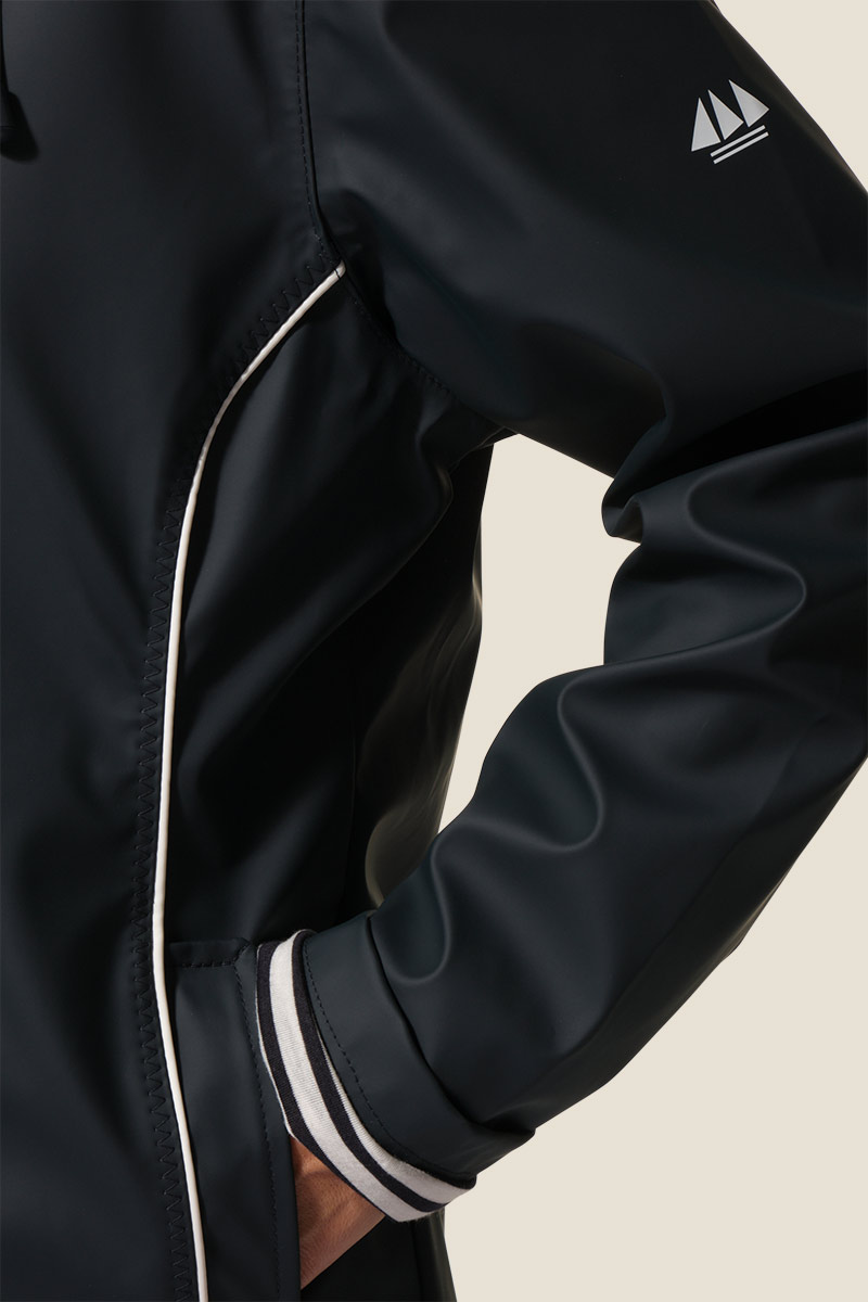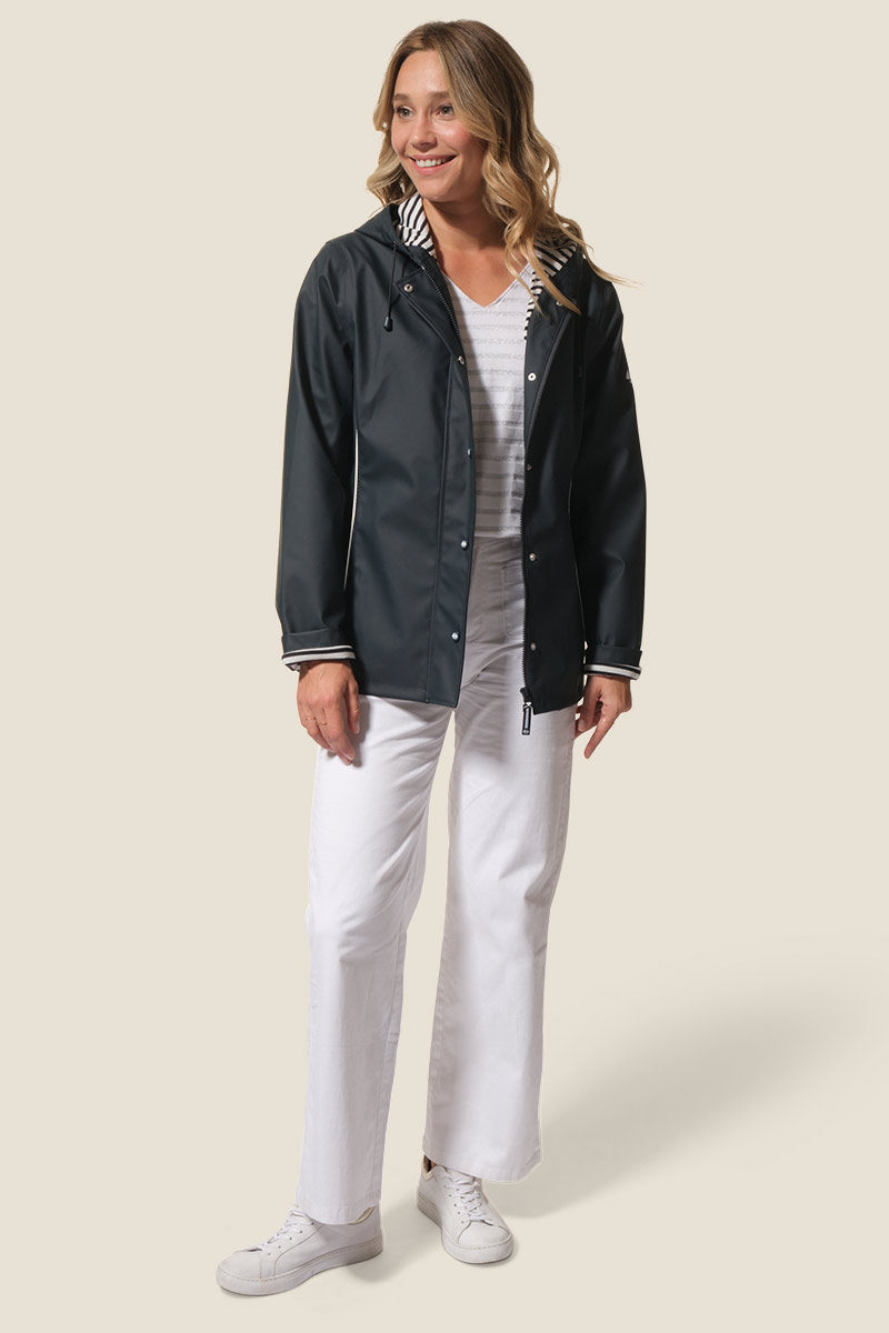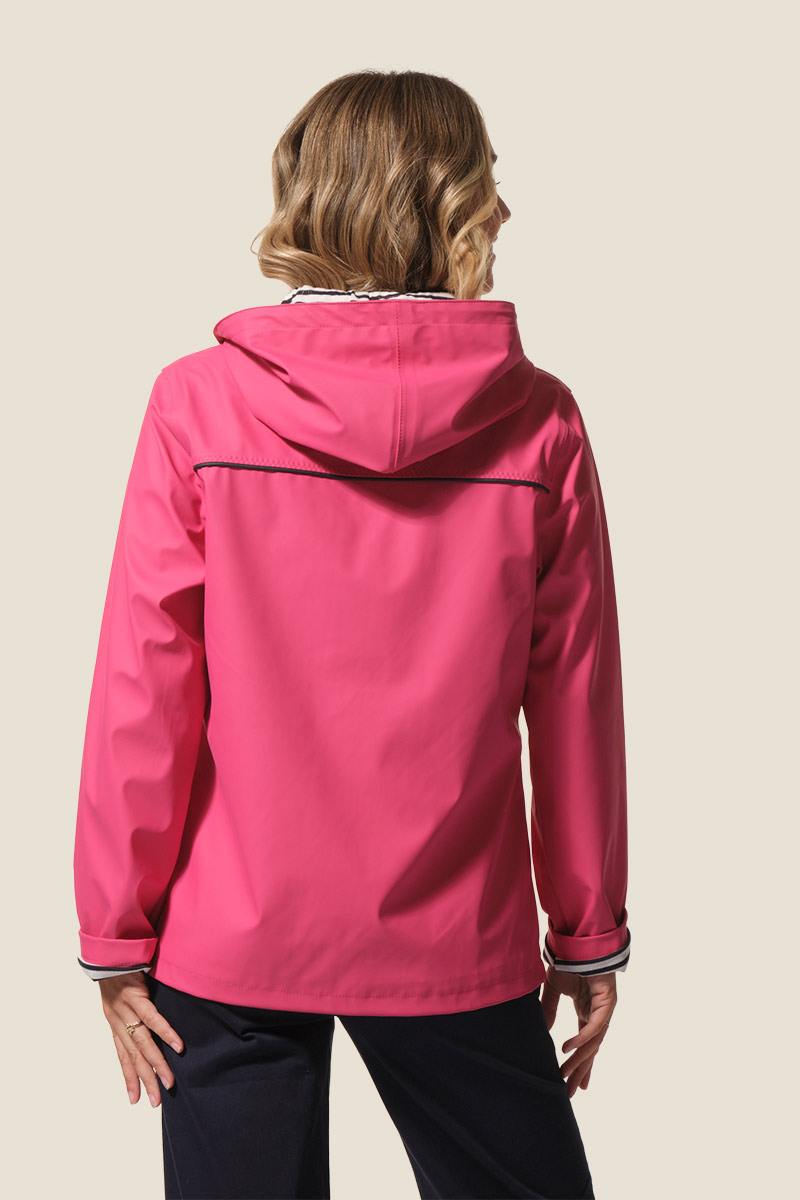 Le ciré Nadège est un ciré court pour femme à la coupe légèrement ajustée, soulignée par des découpes et des passepoils contrastants. Doté d’une capuche doublée jersey rayé, de poches passepoilées et d’une fermeture zippée sous patte à boutons-pression, il allie style et confort. Ses coutures étanches et son imperméabilité 5000 mm assurent une protection efficace contre la pluie. ☔