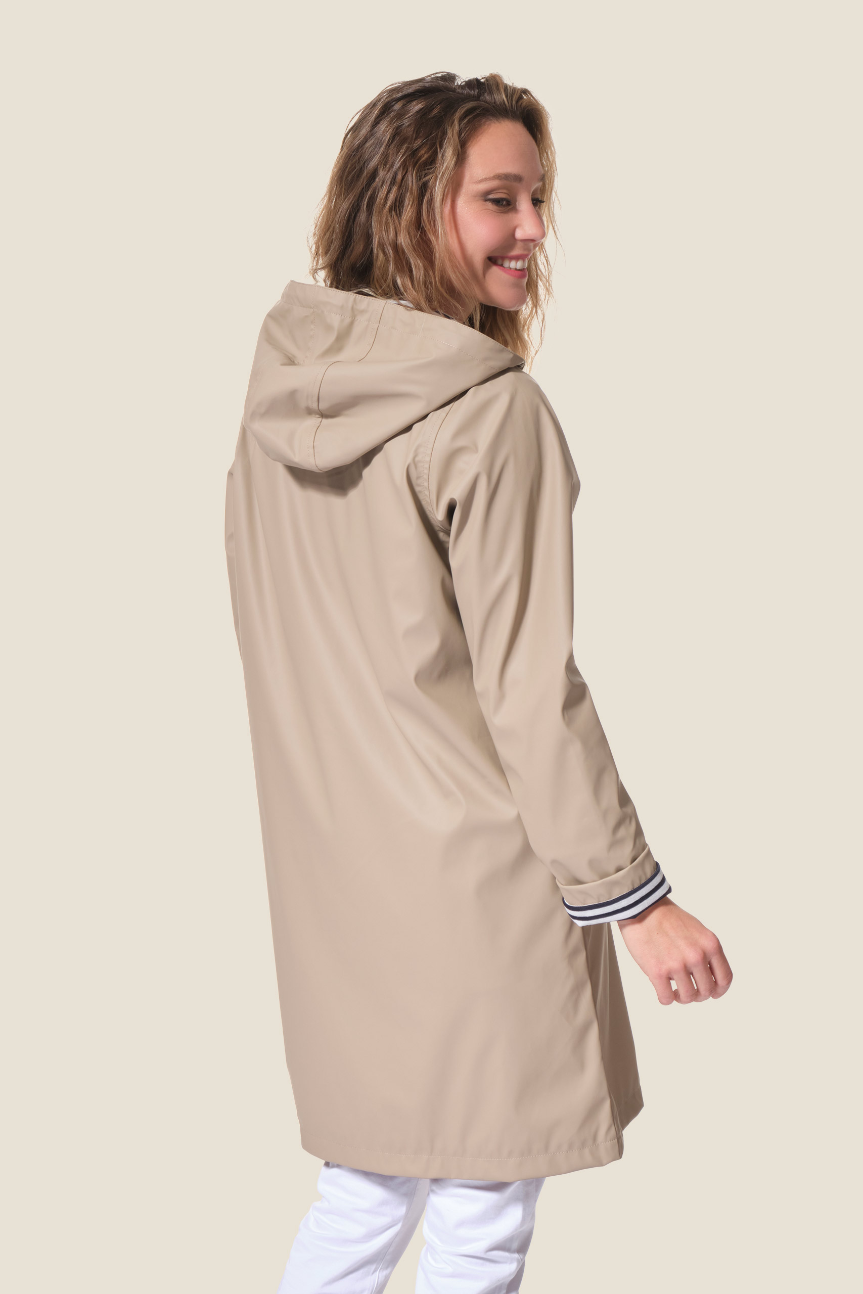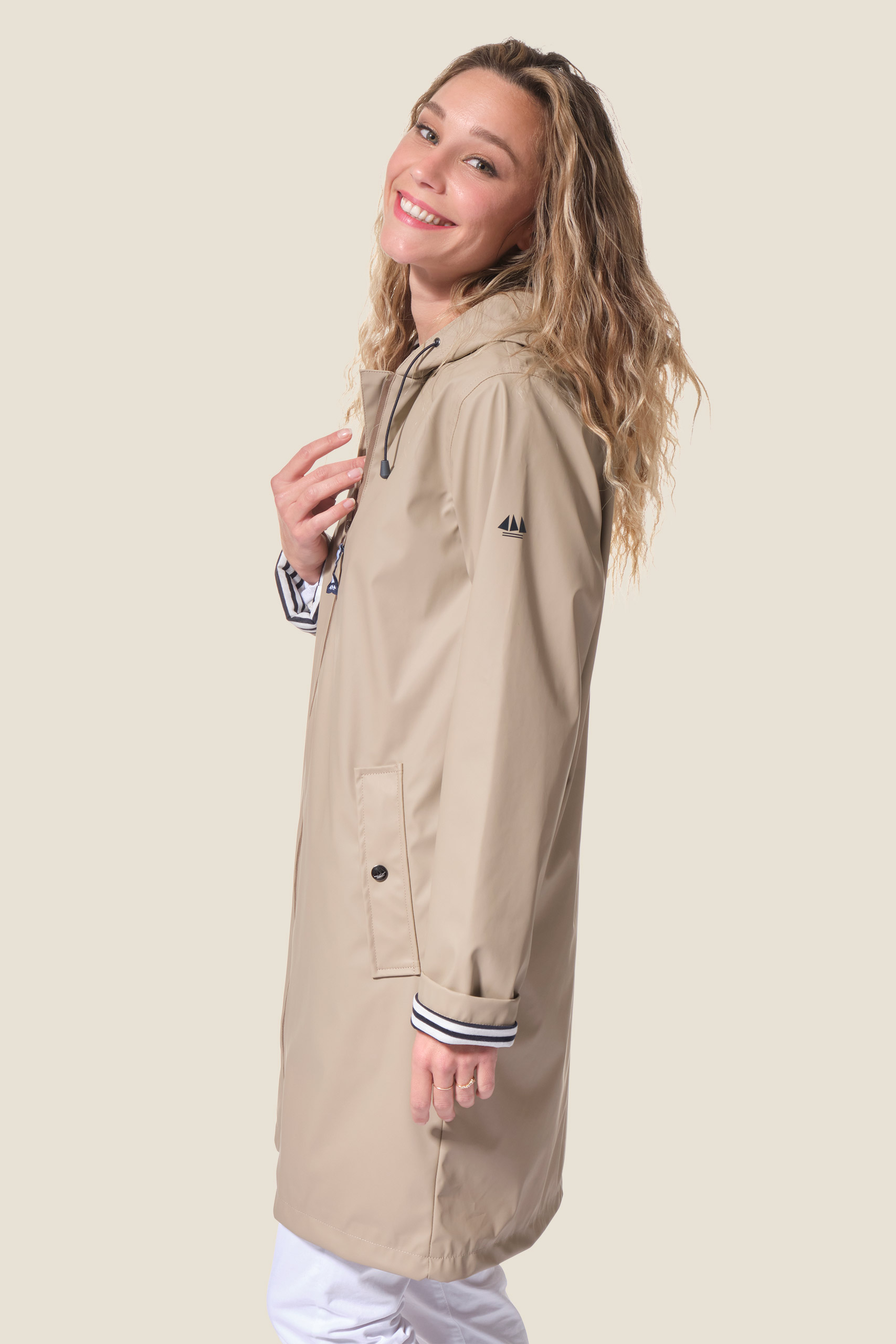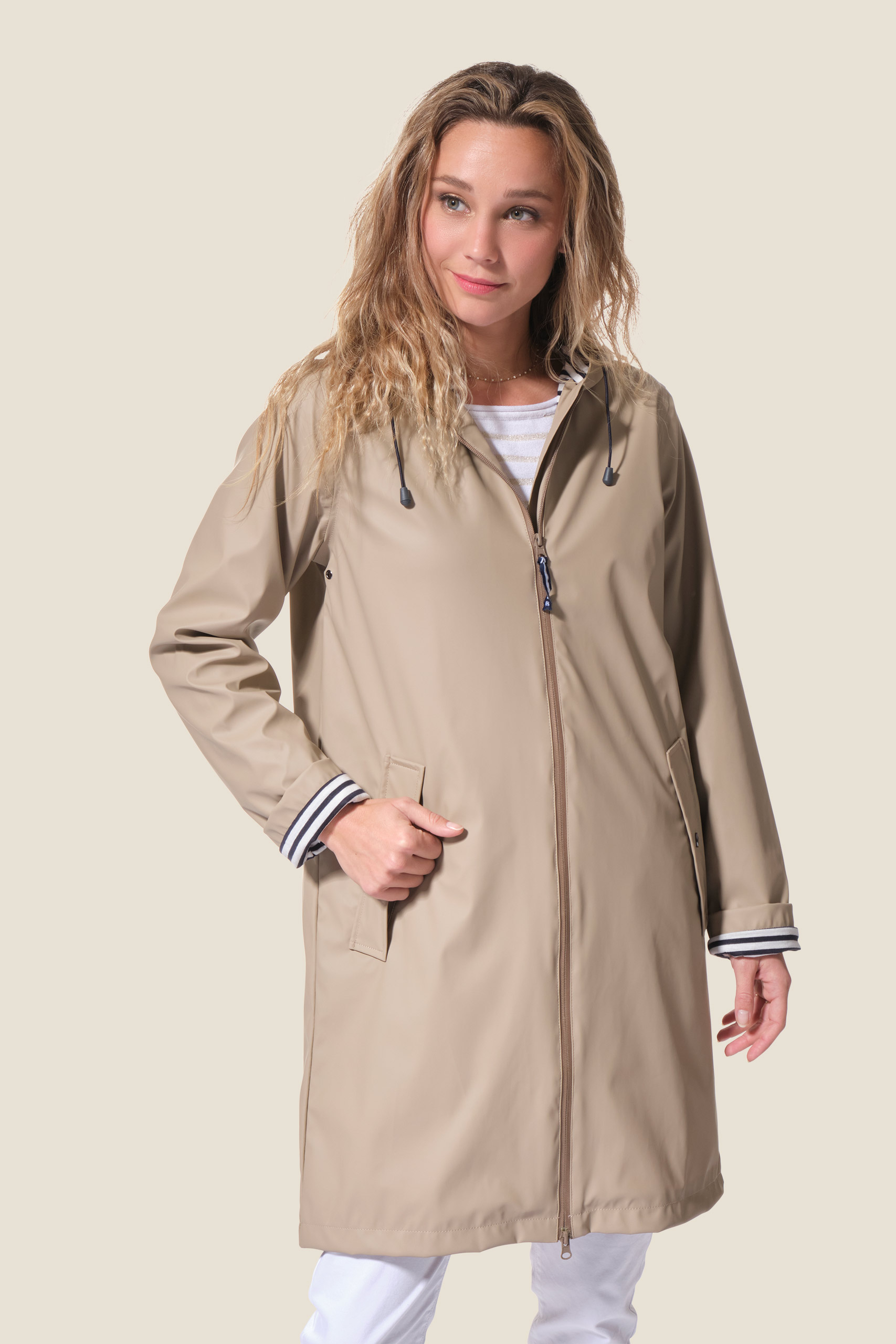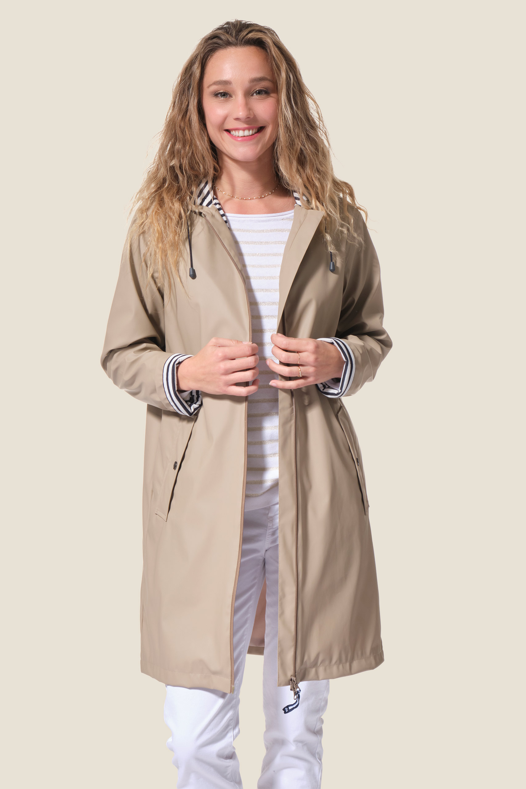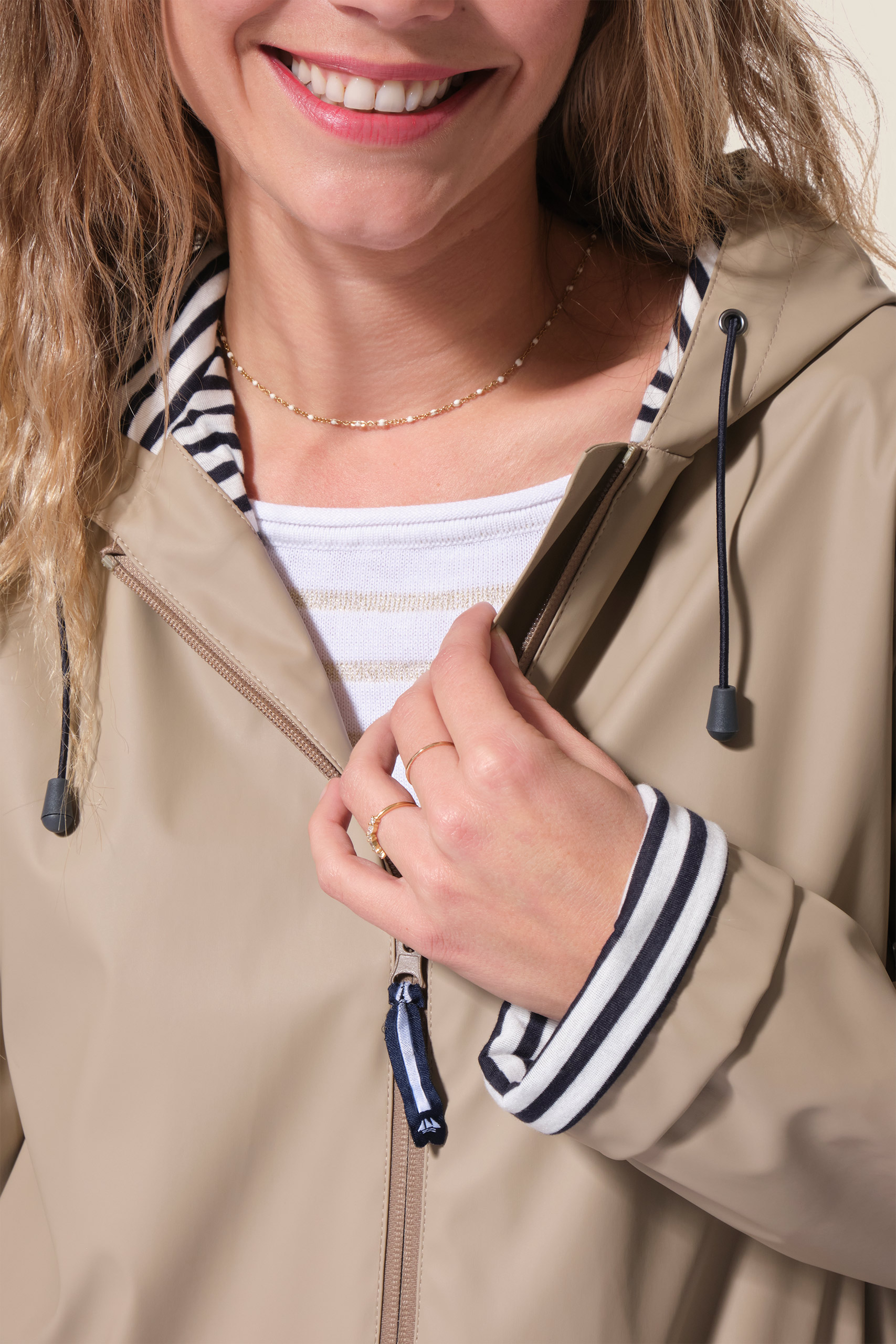 Chic et pratique, ce ciré long pour femme séduit par sa coupe droite, sa doublure jersey rayée et sa capuche ajustable.