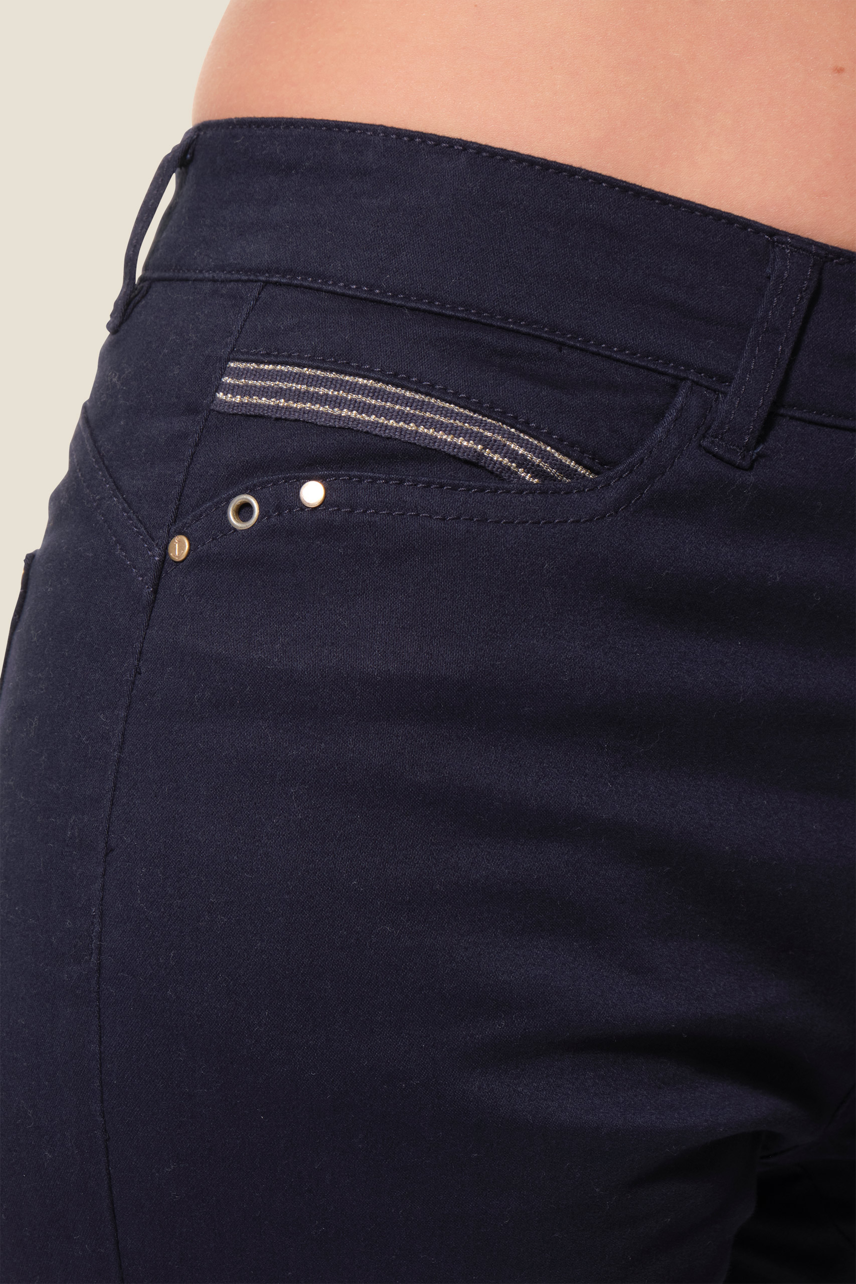 • Détails fantaisie (ruban et rivets) sur les poches devant et dos