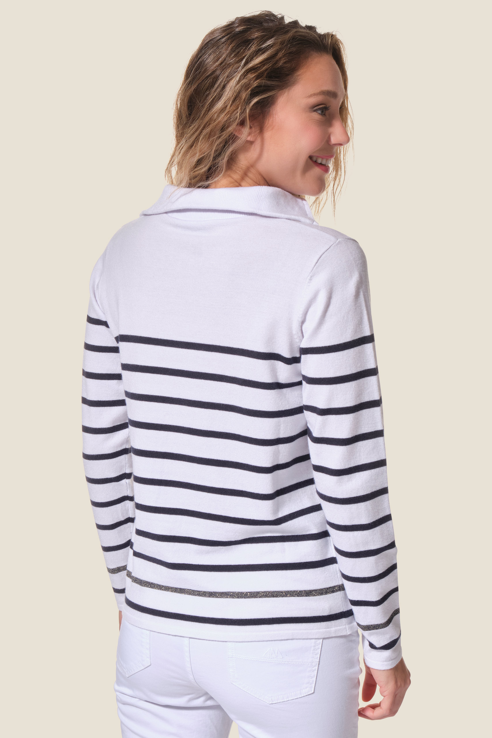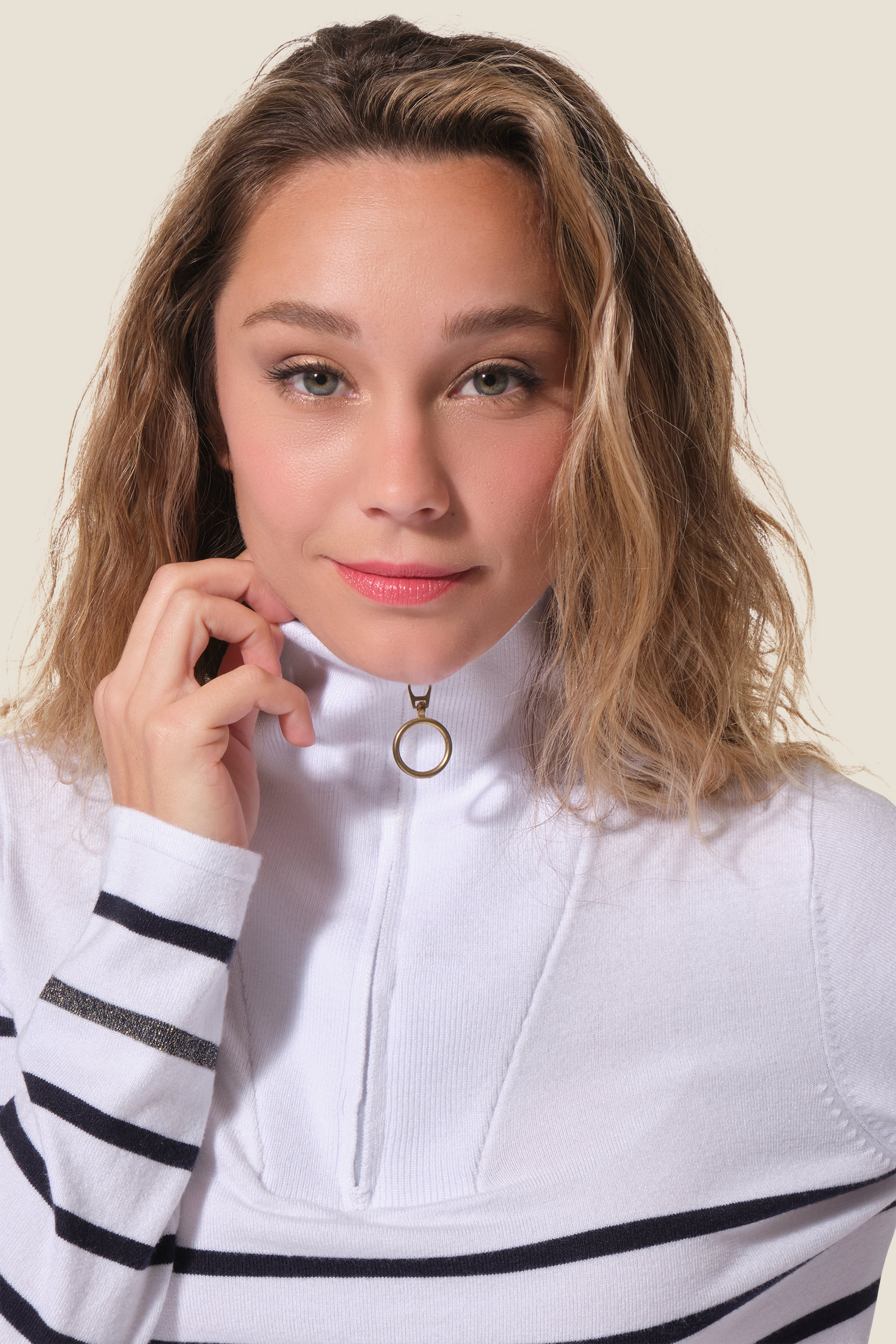 Le pull Tamala allie confort et style avec sa maille rayée ultra douce et sa coupe droite. Son col camionneur zippé, ses détails en fil métallisé et la plaque logo dorée sur la manche apportent une touche moderne et féminine. Attention, le modèle taille petit.