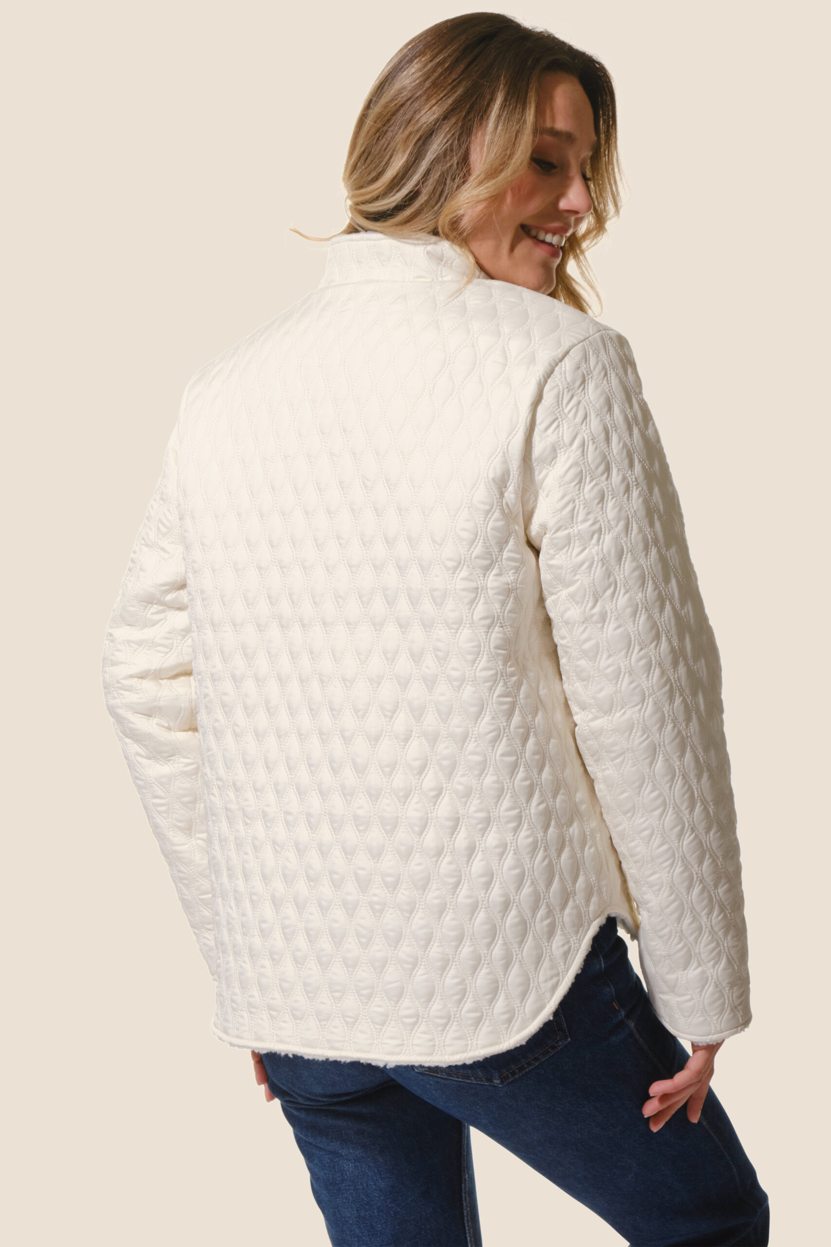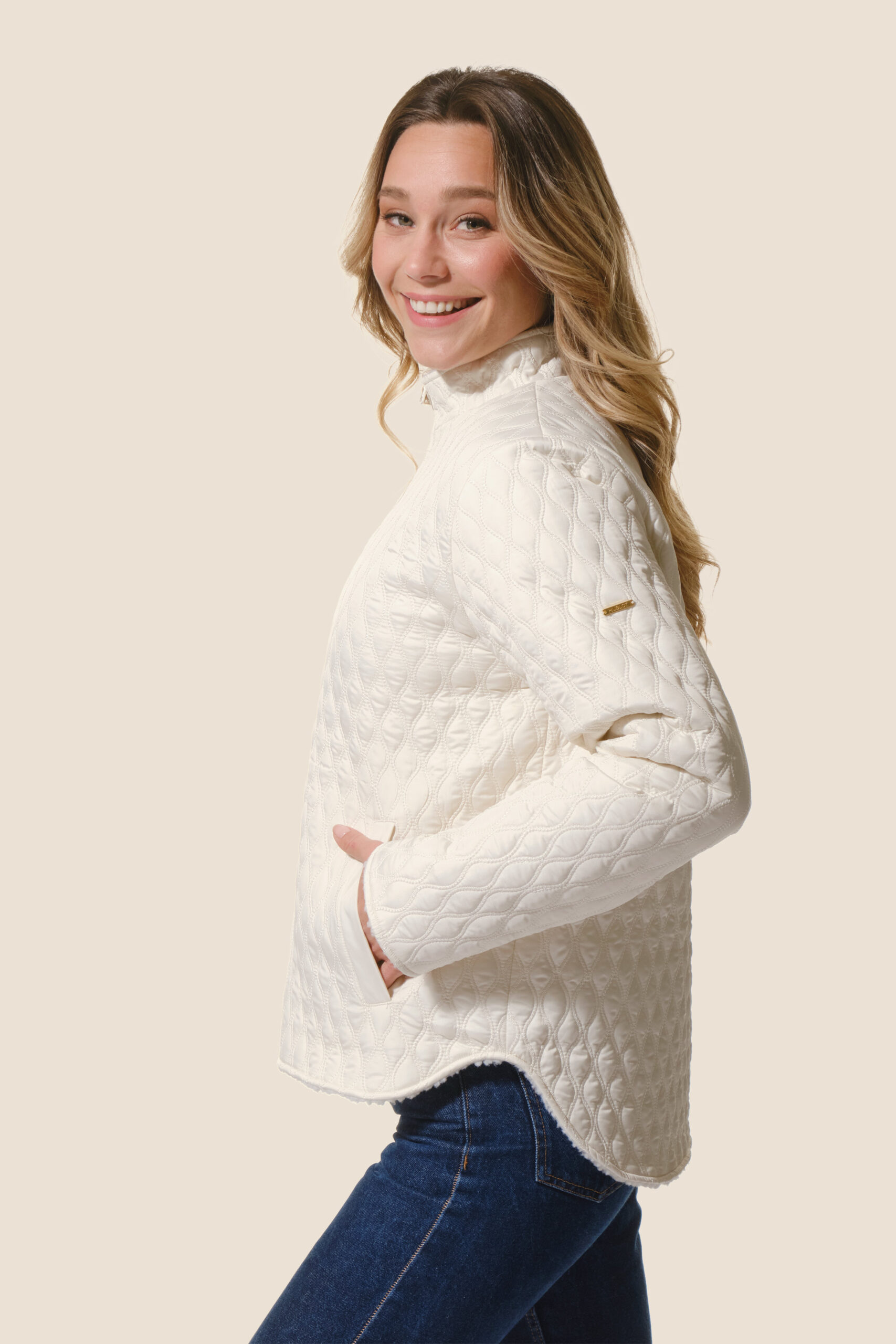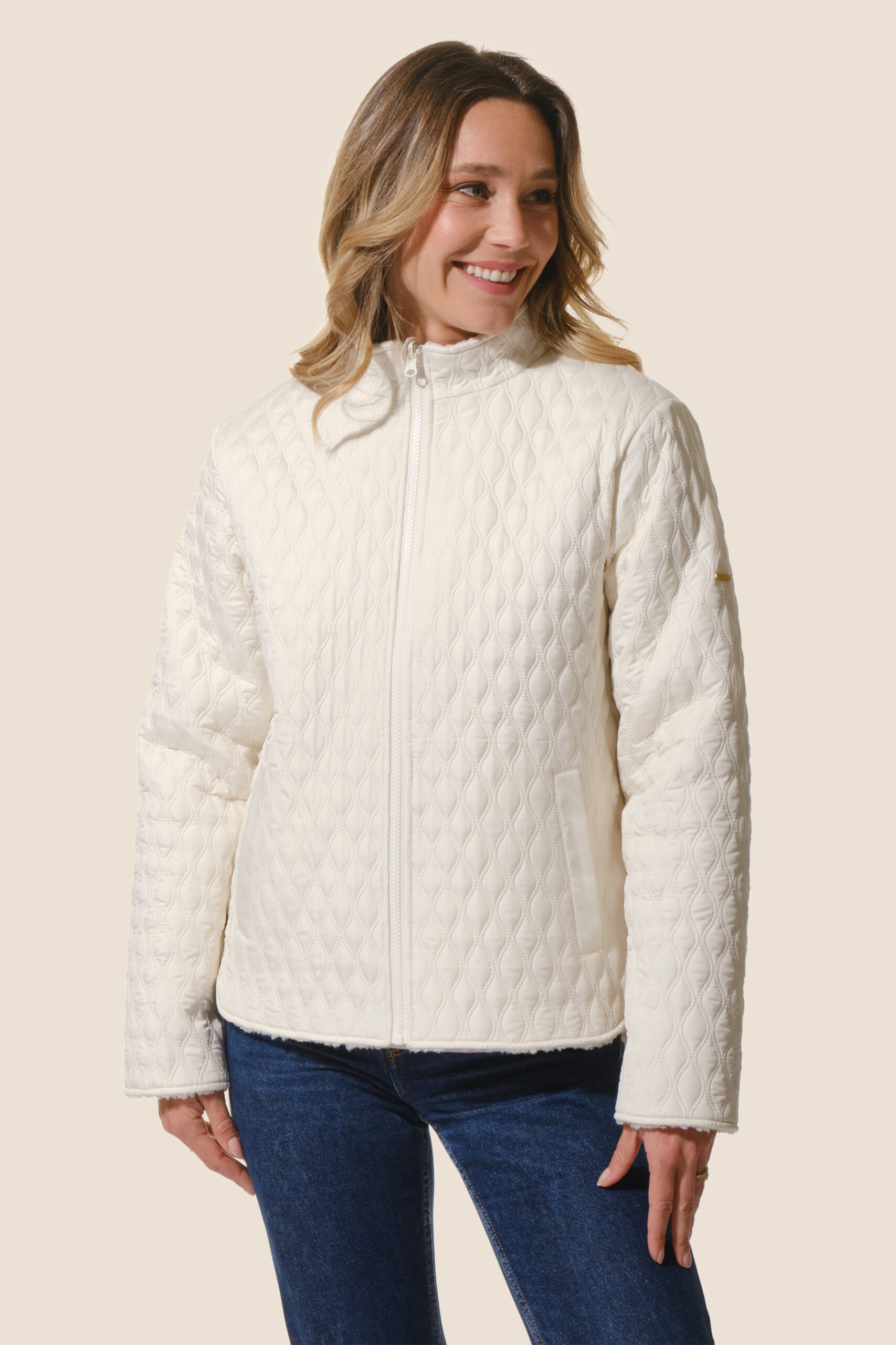 - Veste femme réversible, avec un côté en tissu matelassé et l’autre en tissu sherpa doux