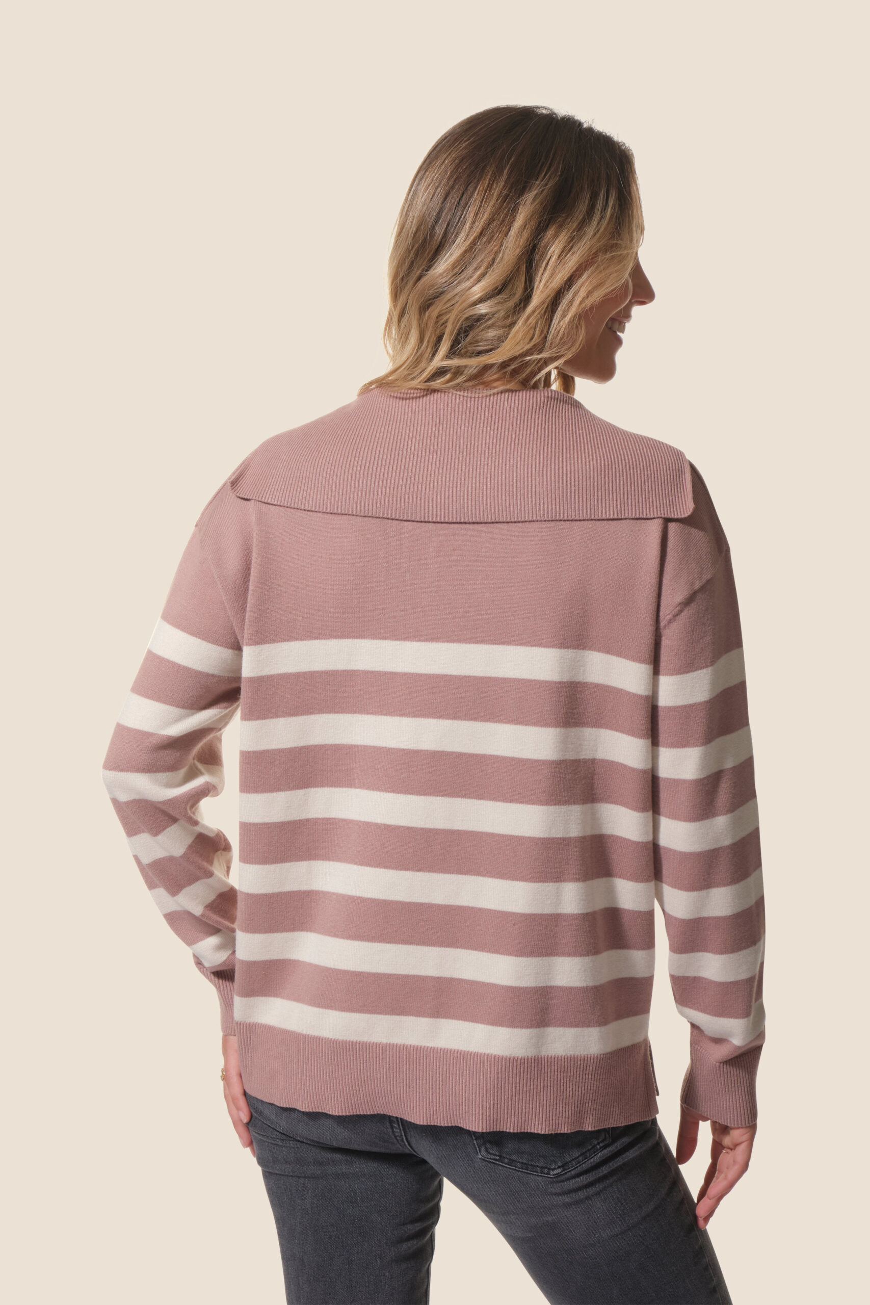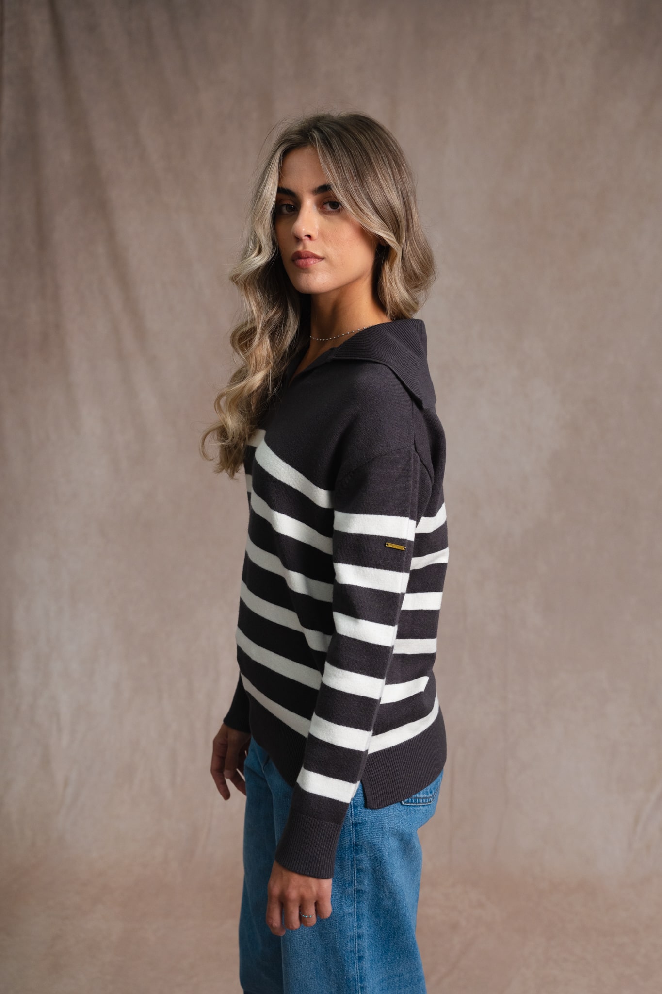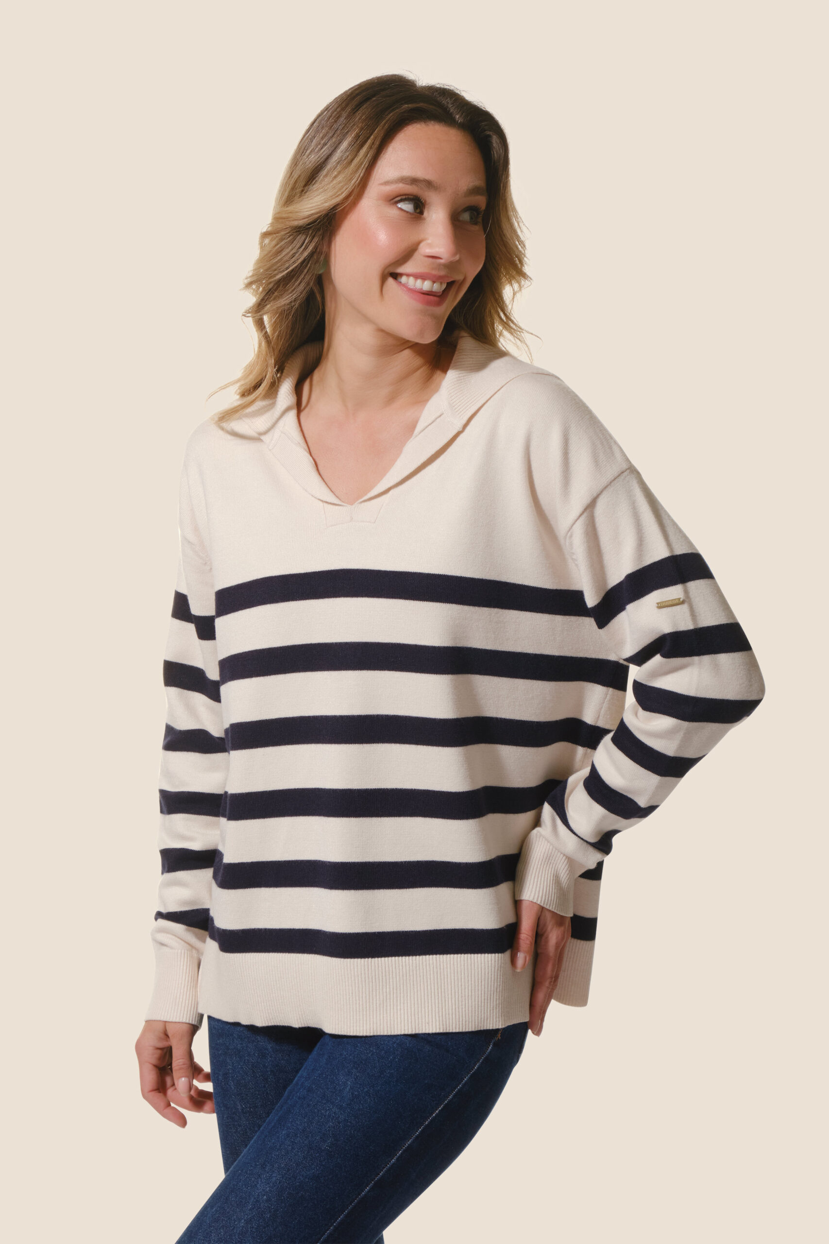 Style marin et élégance : le pull Laurene rayé, maille jersey, col vareuse et finitions bord-côte, avec une touche dorée raffinée.