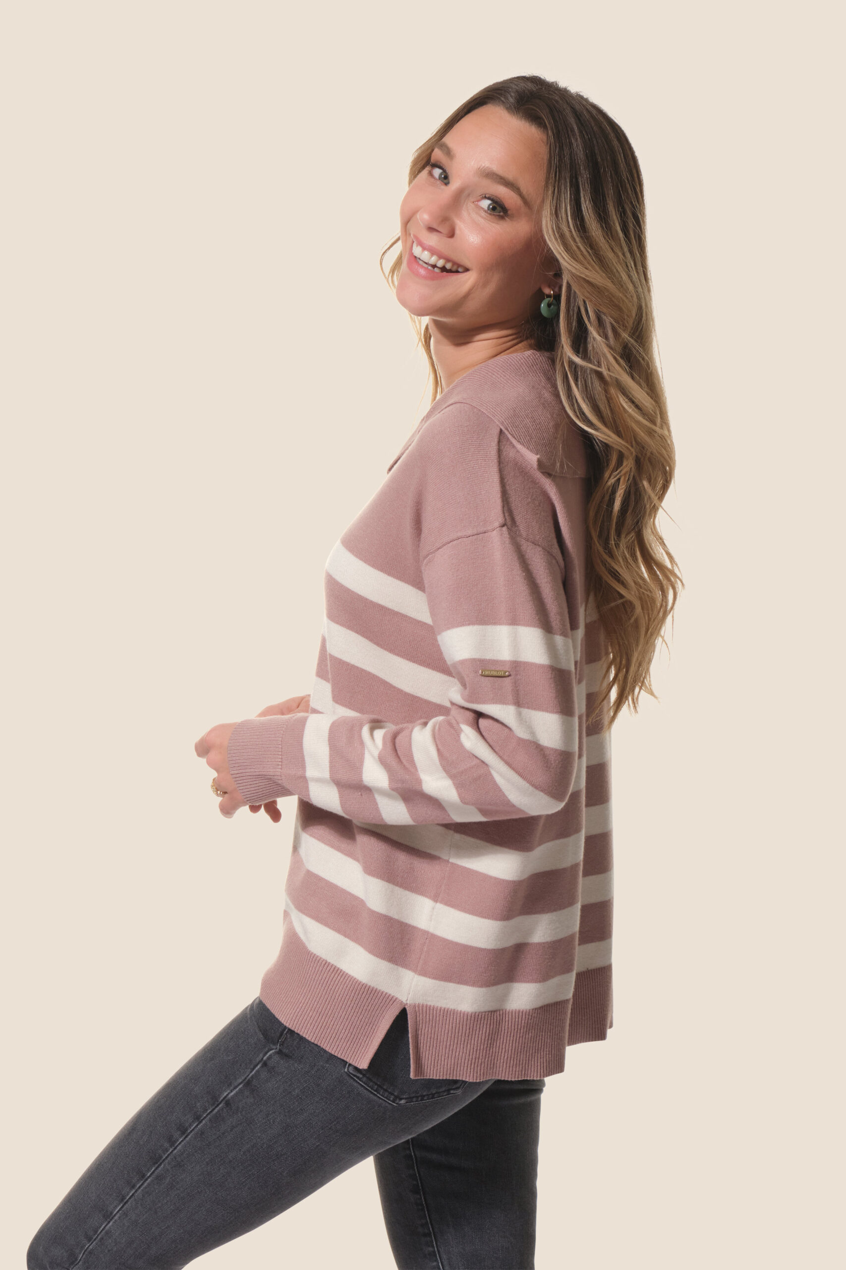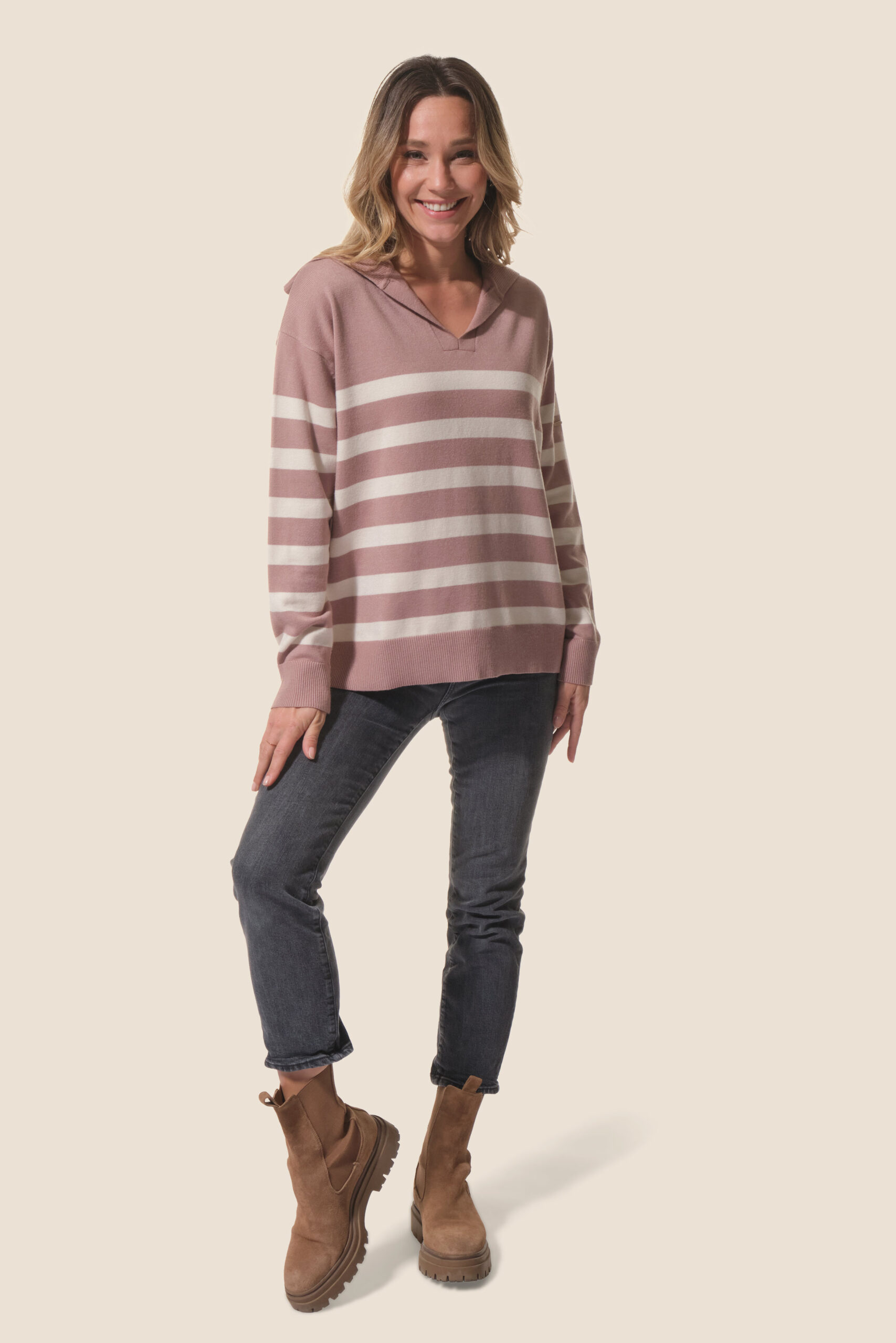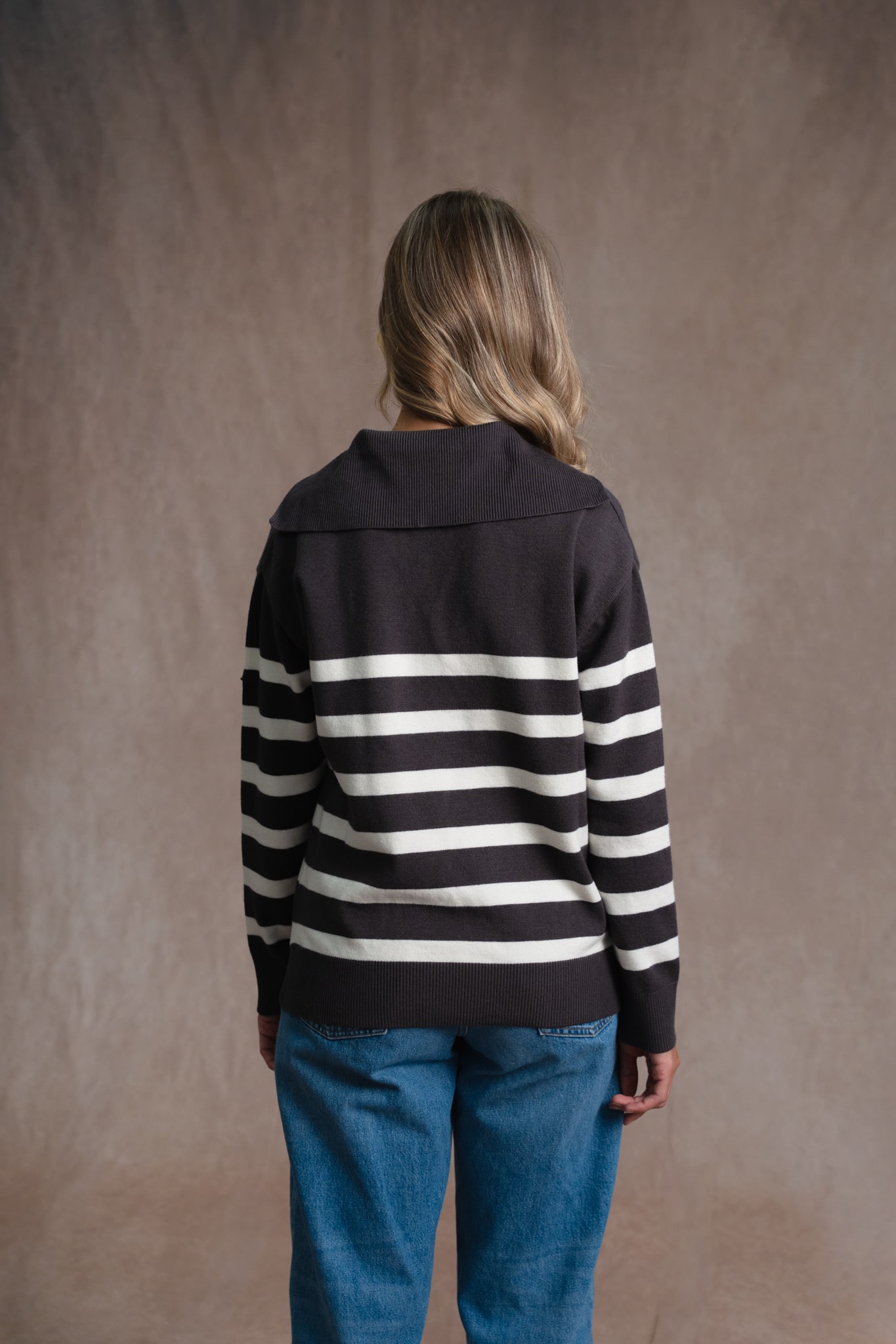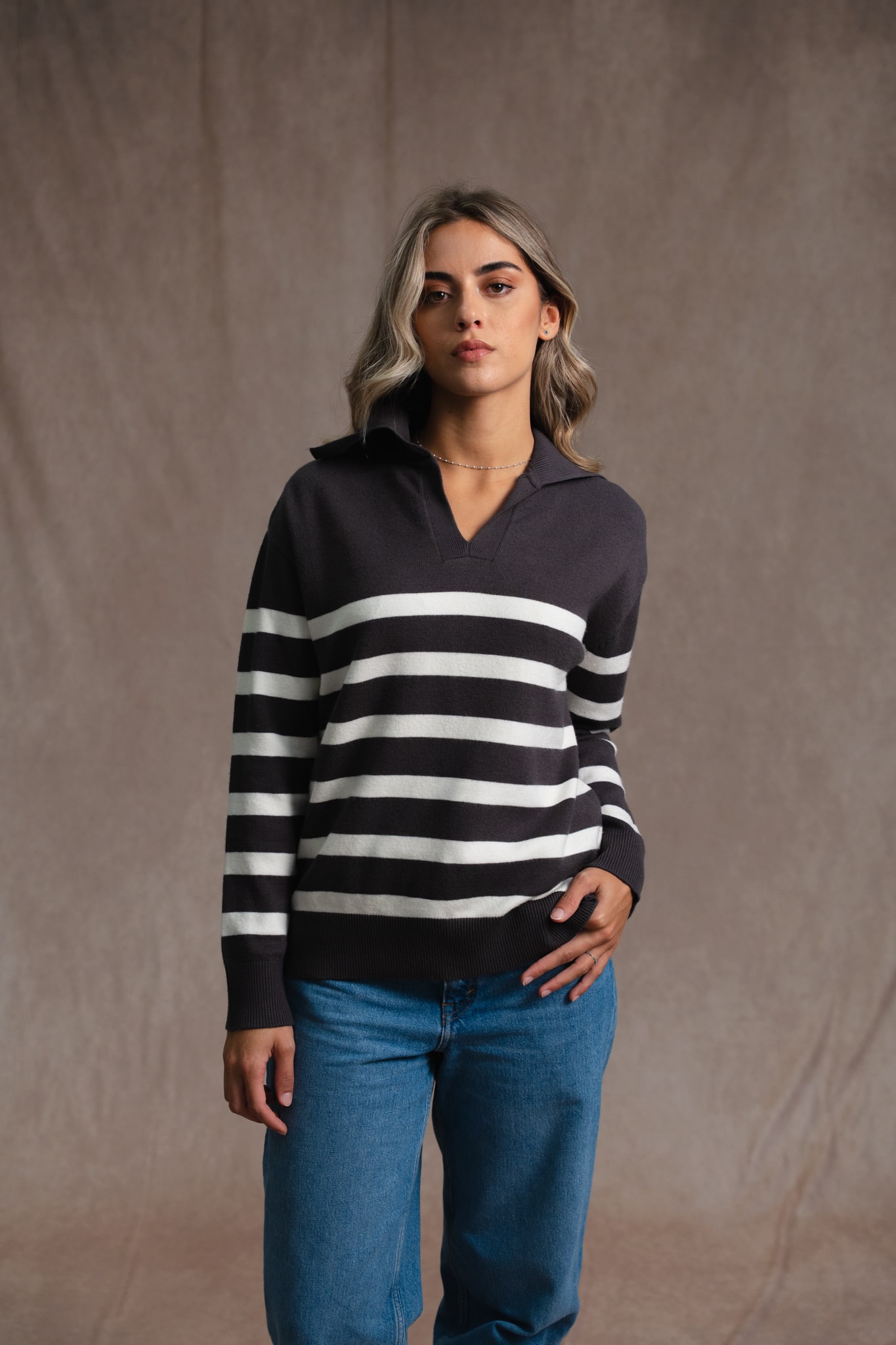 Style marin et élégance : le pull Laurene rayé, maille jersey, col vareuse et finitions bord-côte, avec une touche dorée raffinée.