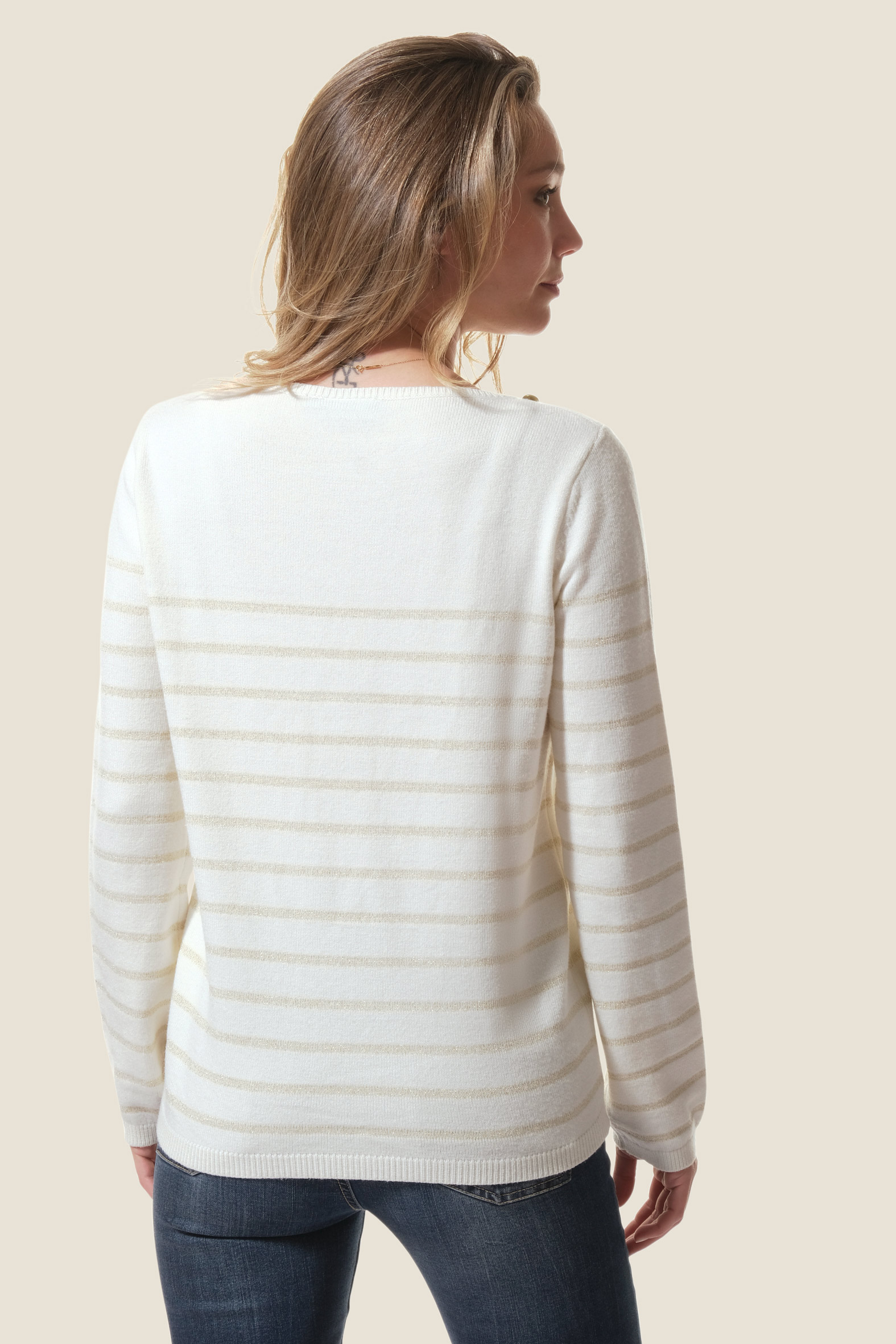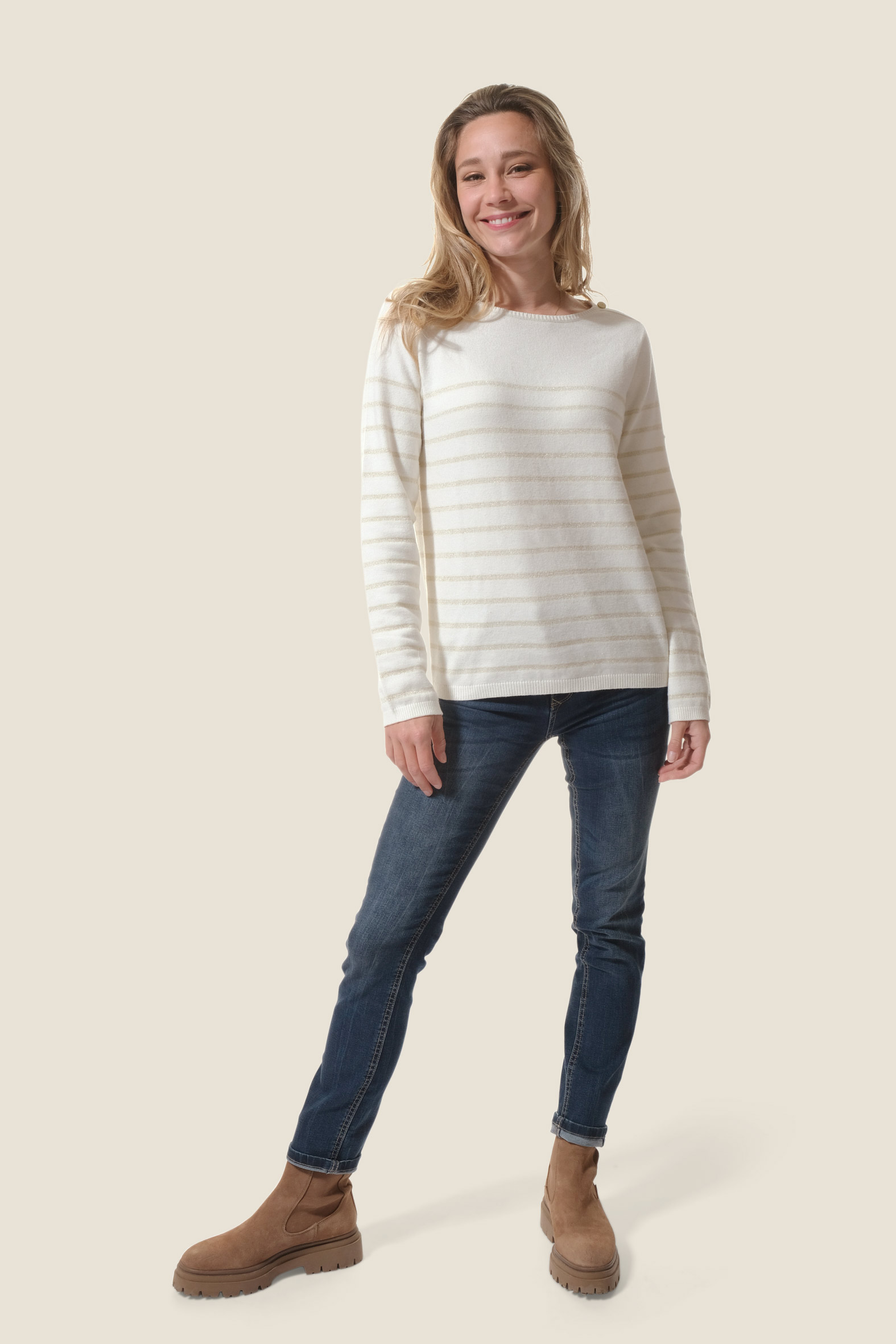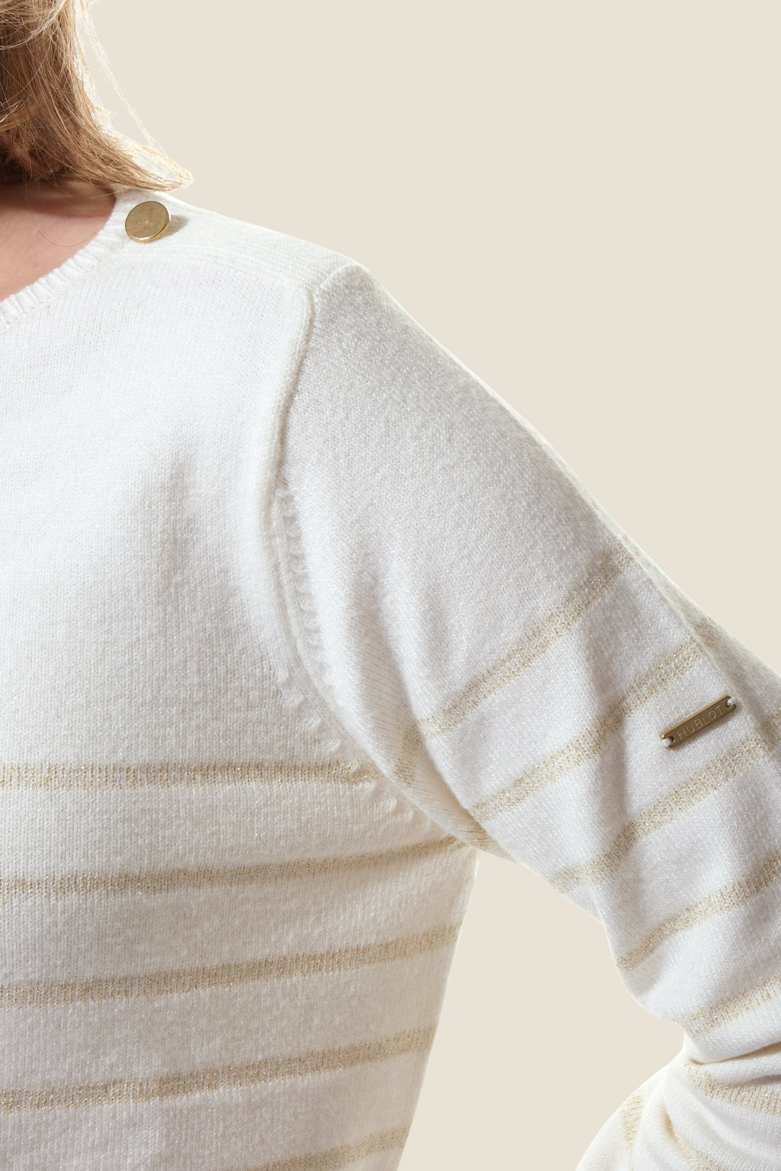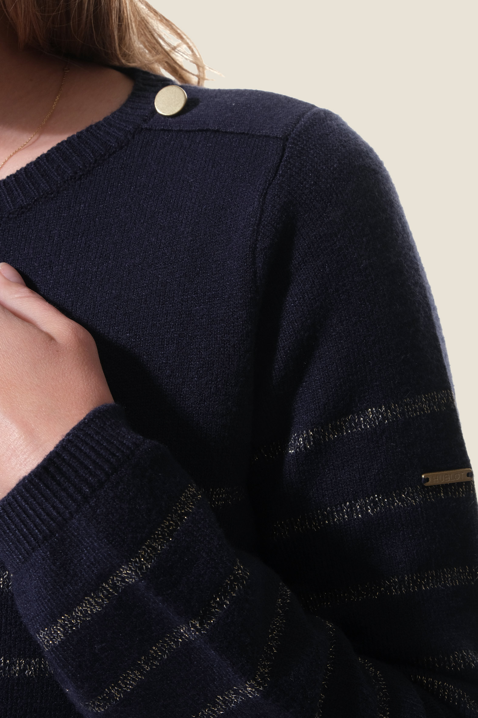 Le pull Mosaline allie élégance et confort avec sa maille douce et ses manches longues. Ses rayures en fil métallisé, son encolure ronde et la patte à boutons sur les épaules apportent une touche raffinée, tandis que la plaque logo dorée sur la manche signe son style féminin et lumineux.
