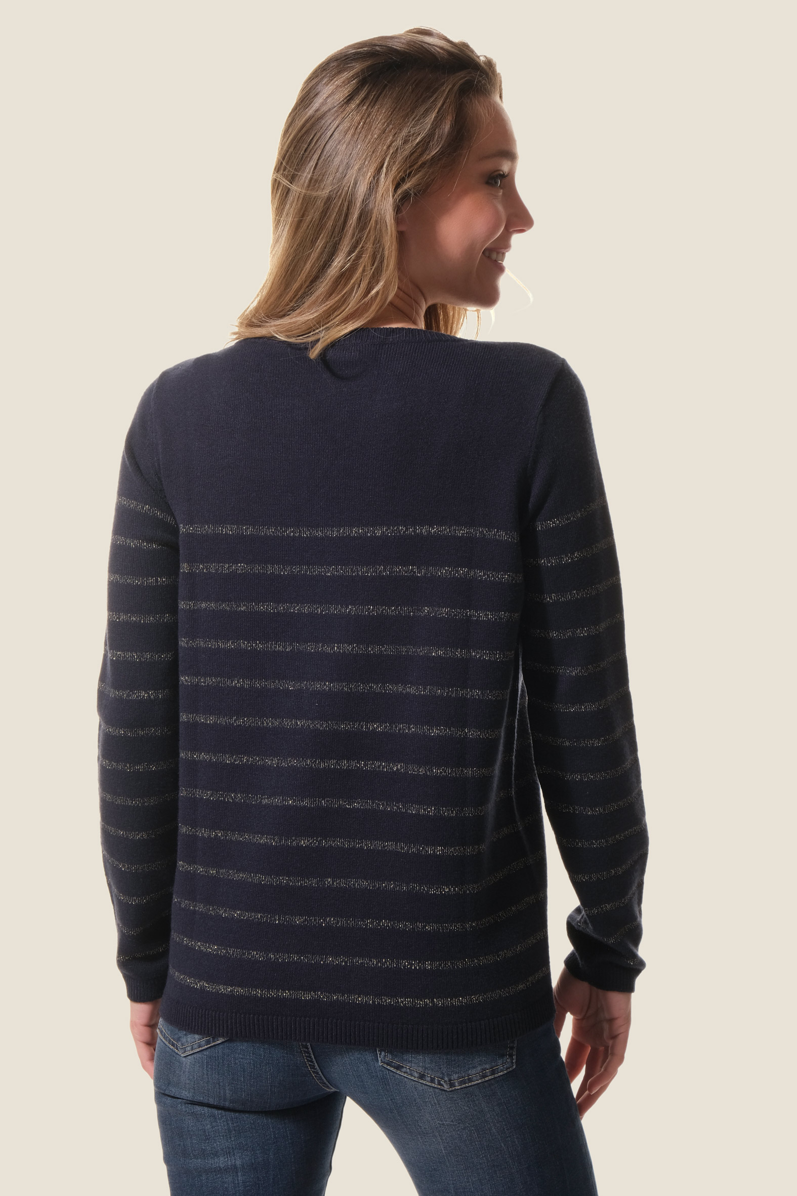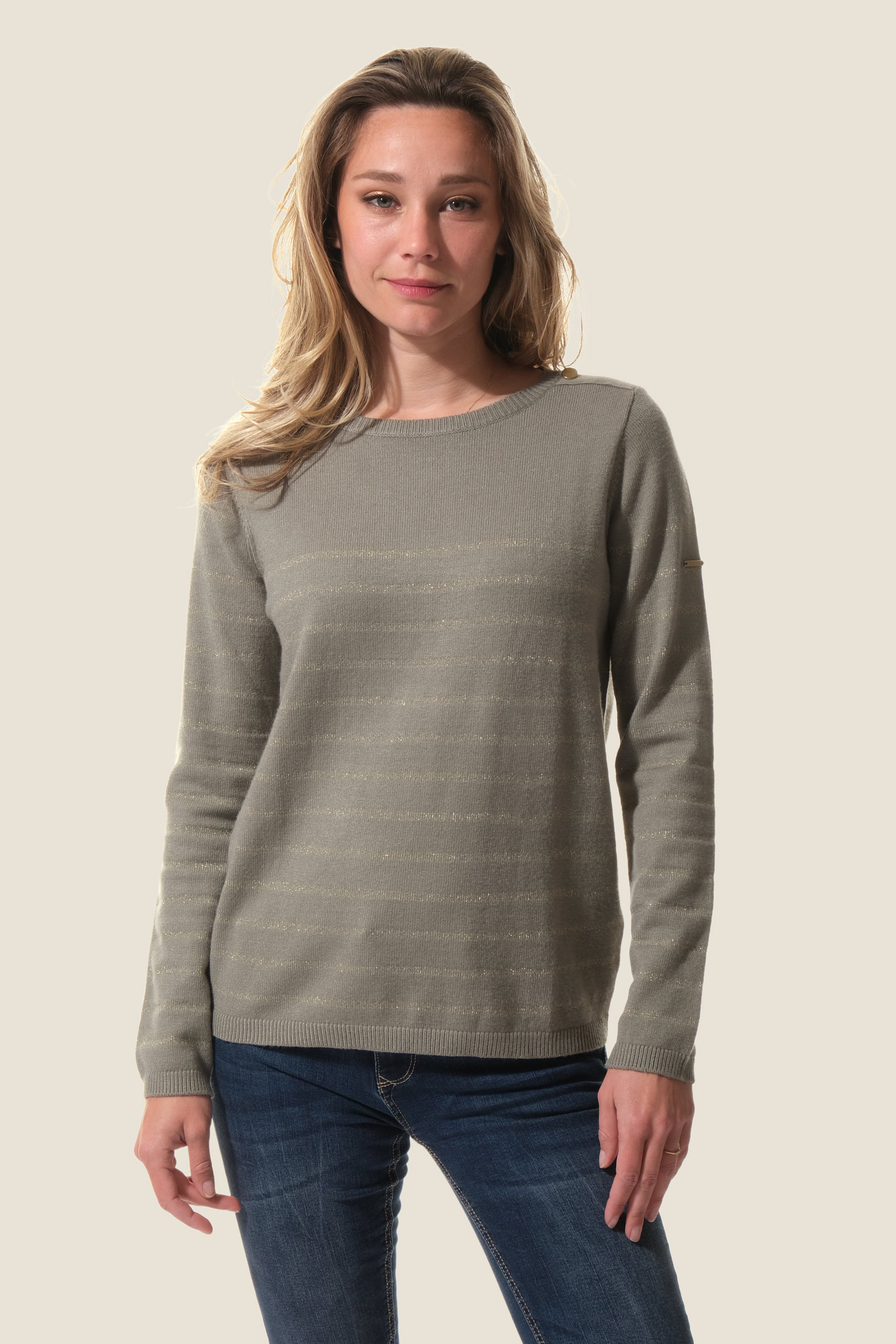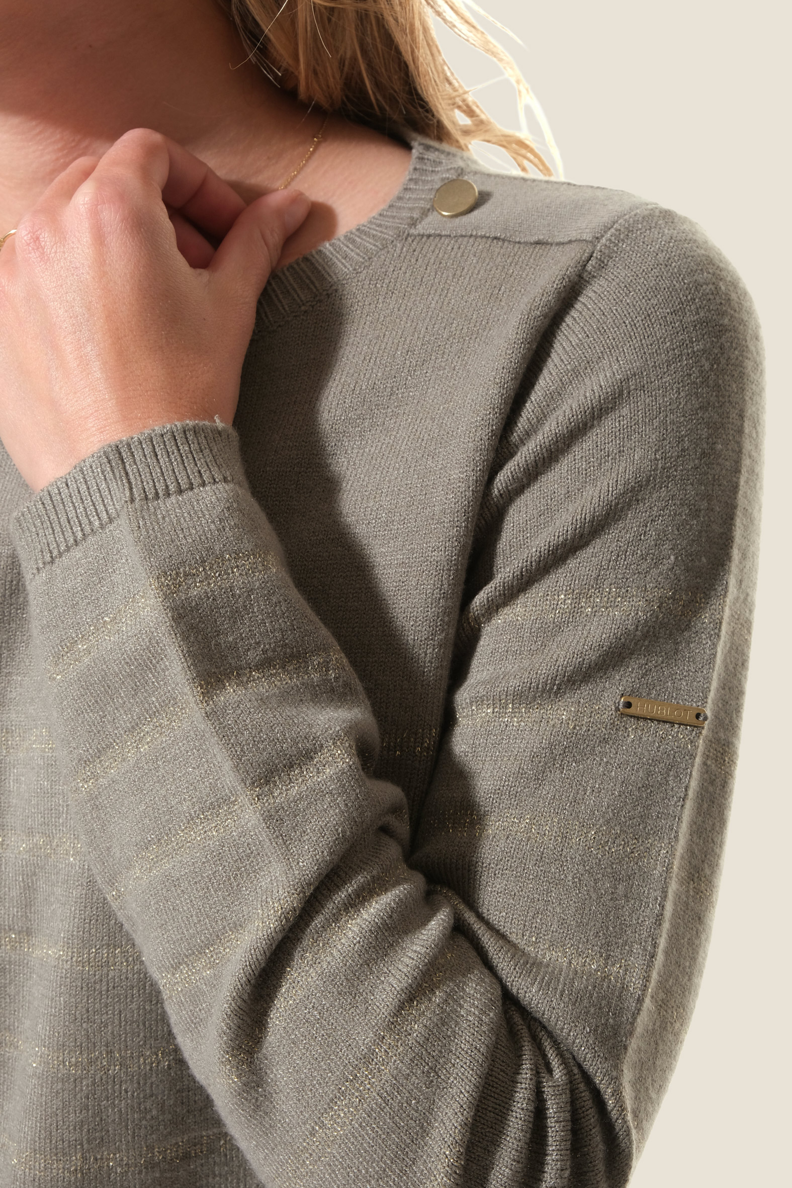 Le pull Mosaline allie élégance et confort avec sa maille douce et ses manches longues. Ses rayures en fil métallisé, son encolure ronde et la patte à boutons sur les épaules apportent une touche raffinée, tandis que la plaque logo dorée sur la manche signe son style féminin et lumineux.