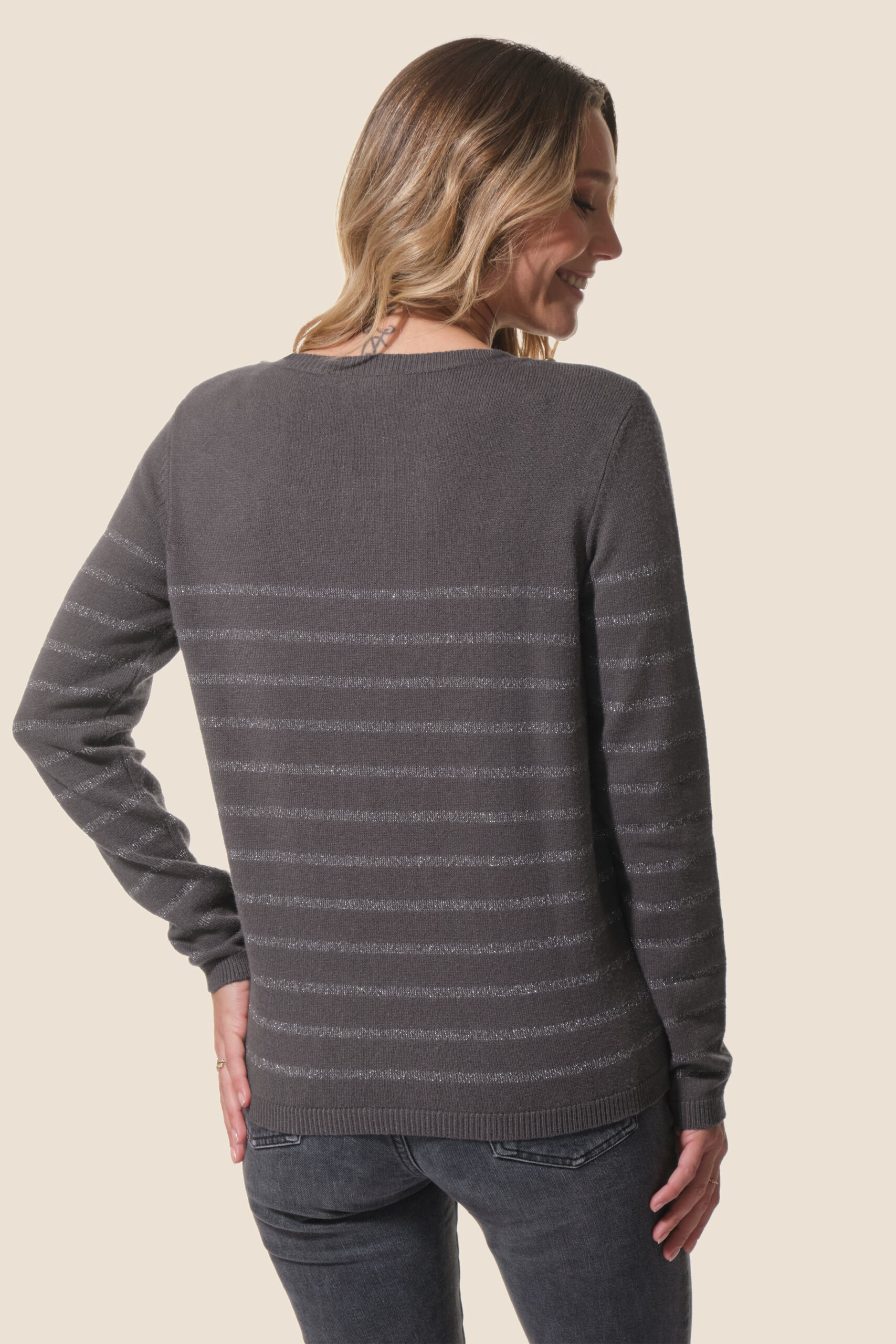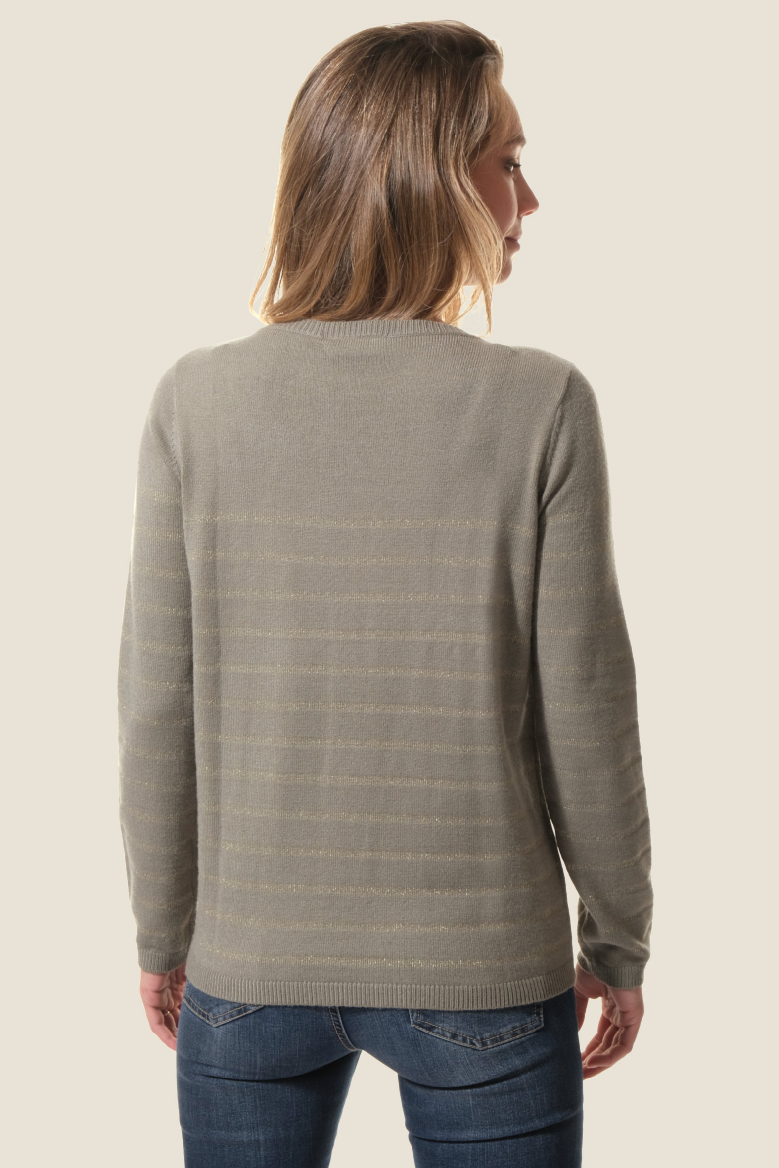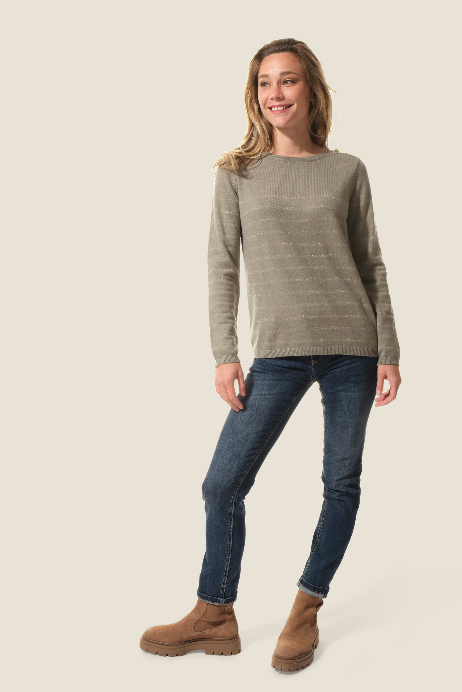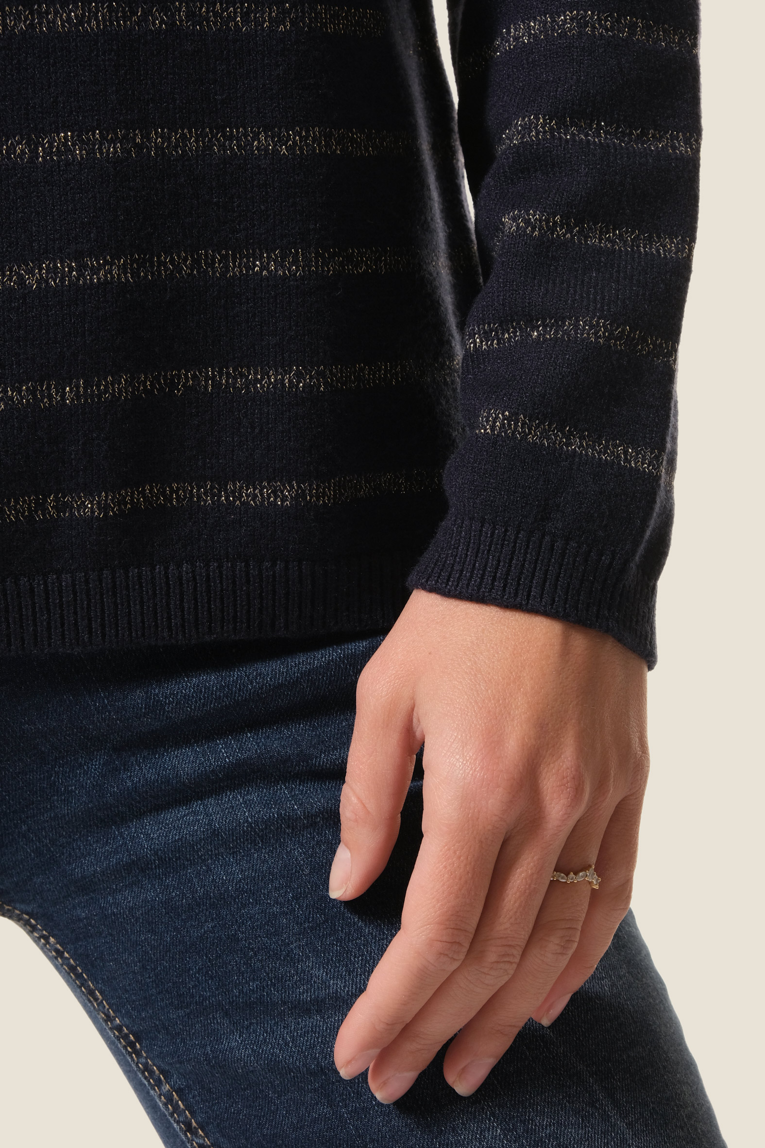 Le pull Mosaline allie élégance et confort avec sa maille douce et ses manches longues. Ses rayures en fil métallisé, son encolure ronde et la patte à boutons sur les épaules apportent une touche raffinée, tandis que la plaque logo dorée sur la manche signe son style féminin et lumineux.