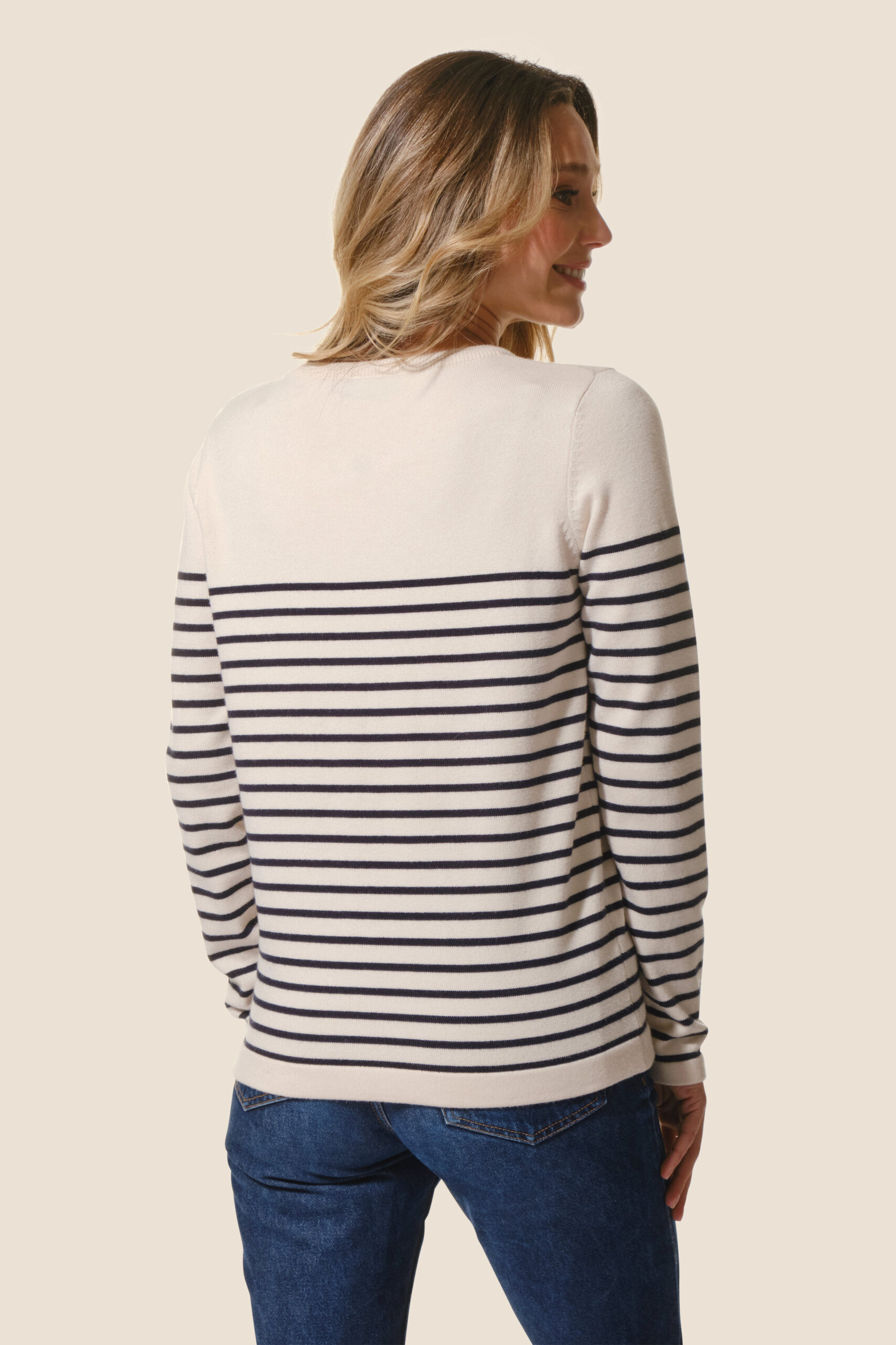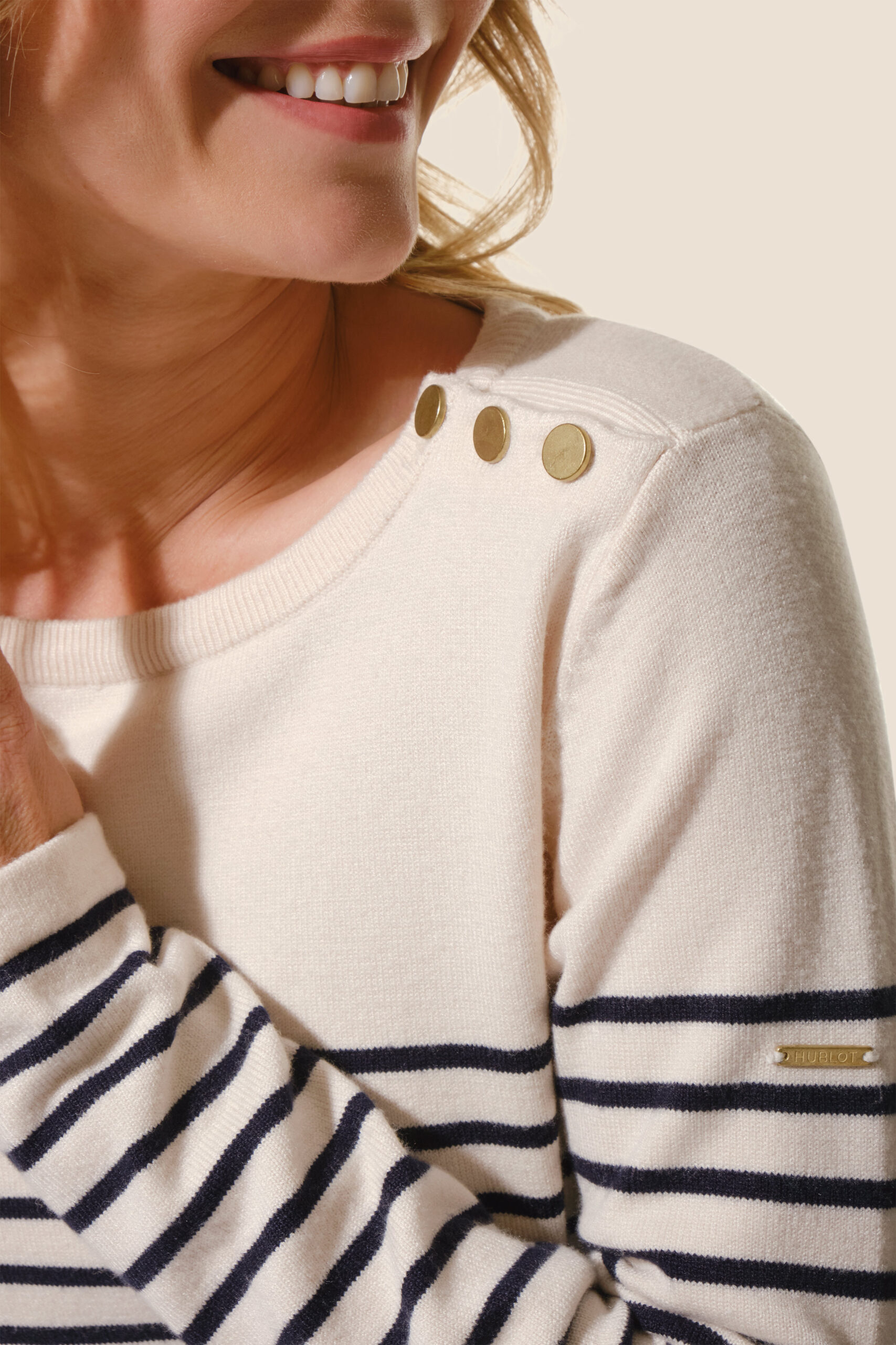 Classique et moderne, le pull Gabrielle revisite le style marin avec ses rayures iconiques, son encolure ronde boutonnée et sa coupe droite, pour un confort agréable et un look intemporel au quotidien.