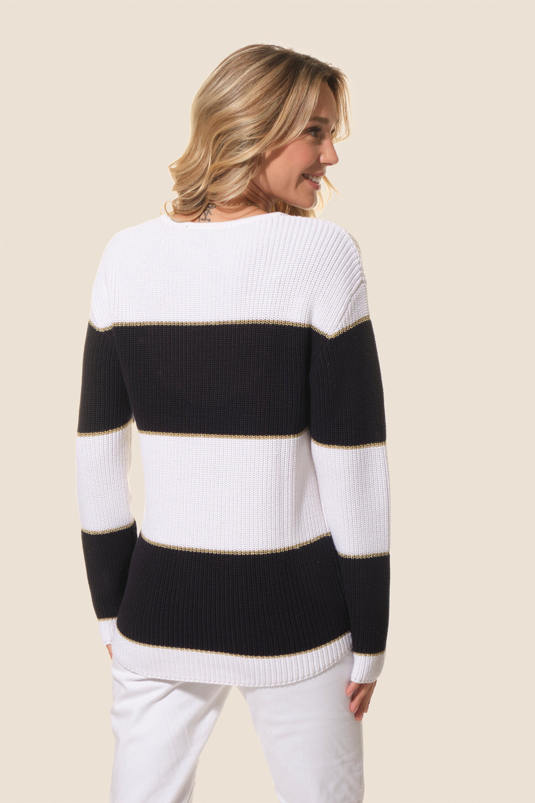 Le pull Sylvie séduit par sa maille douce et ses rayures lurex scintillantes. Son col rond en côte perlée apporte une touche raffinée, faisant de cette pièce un essentiel féminin, confortable et élégant à porter au quotidien.