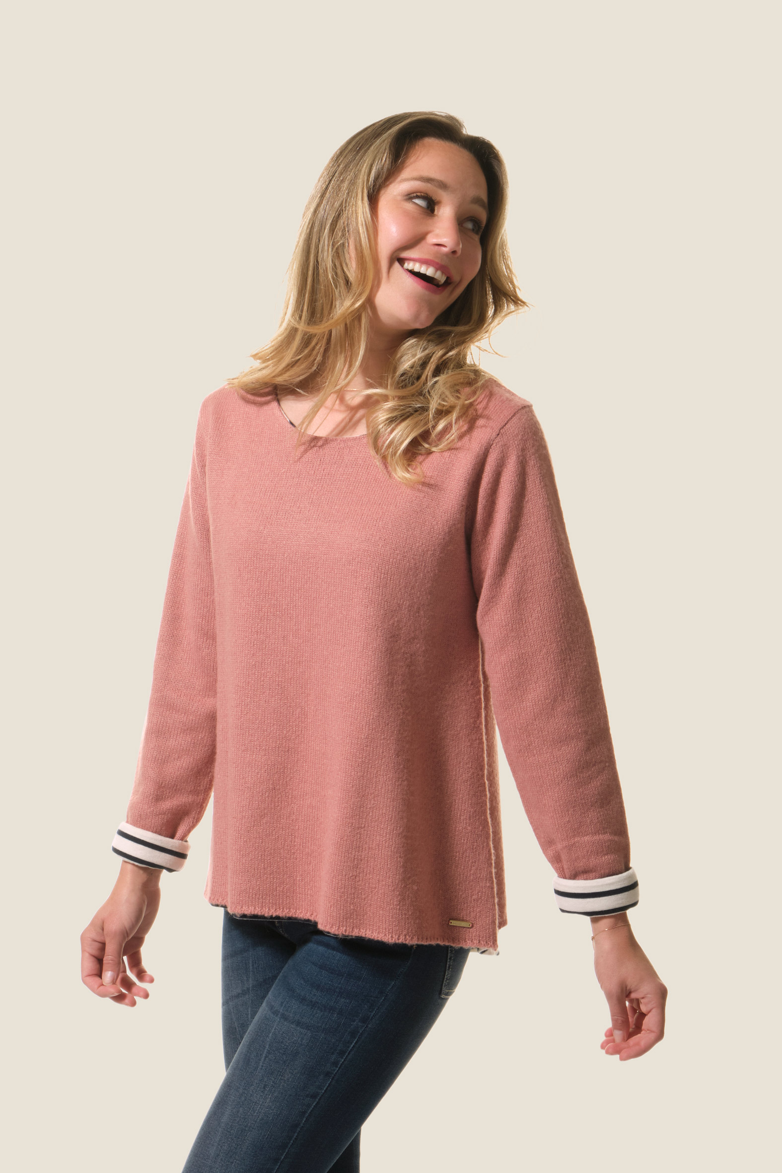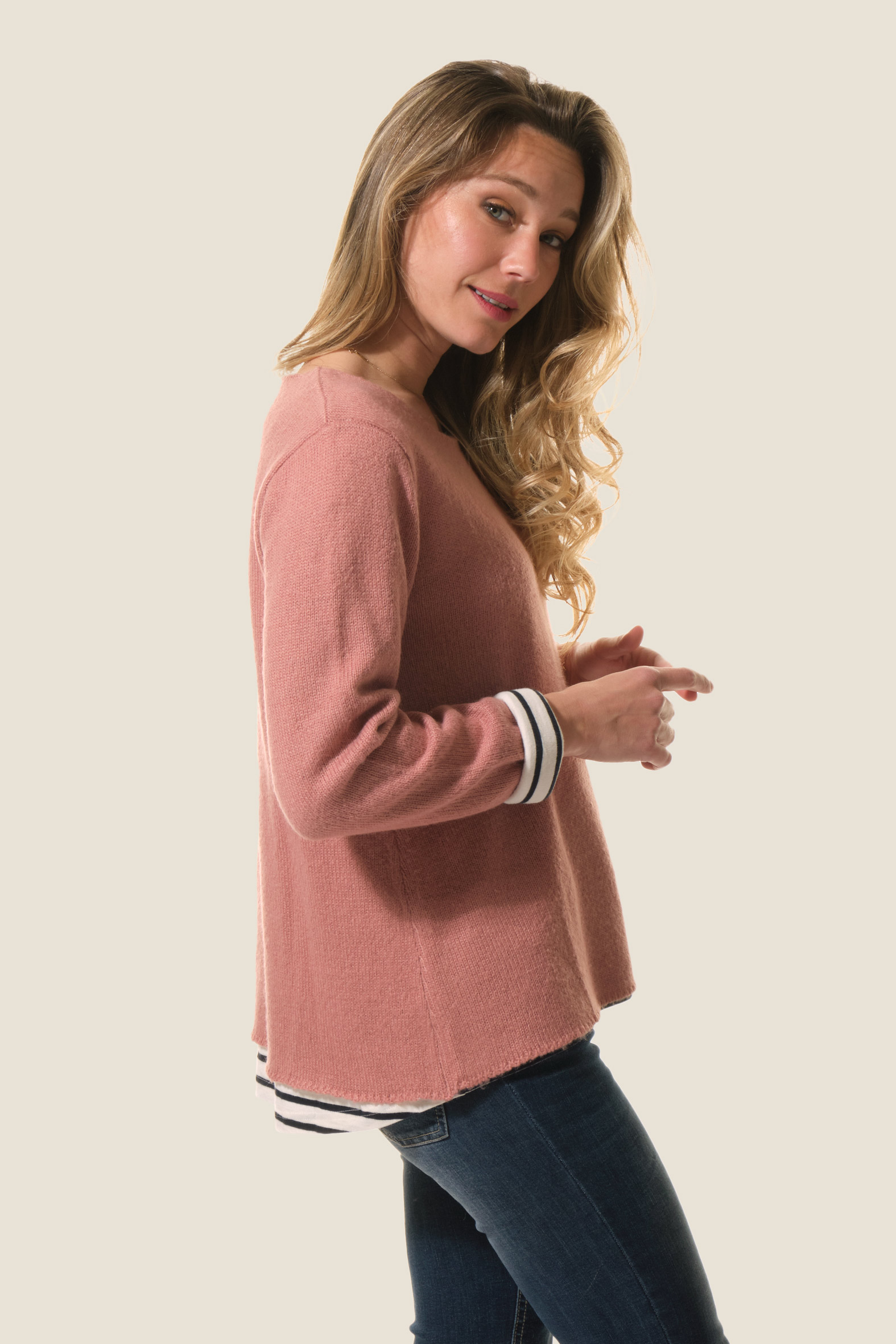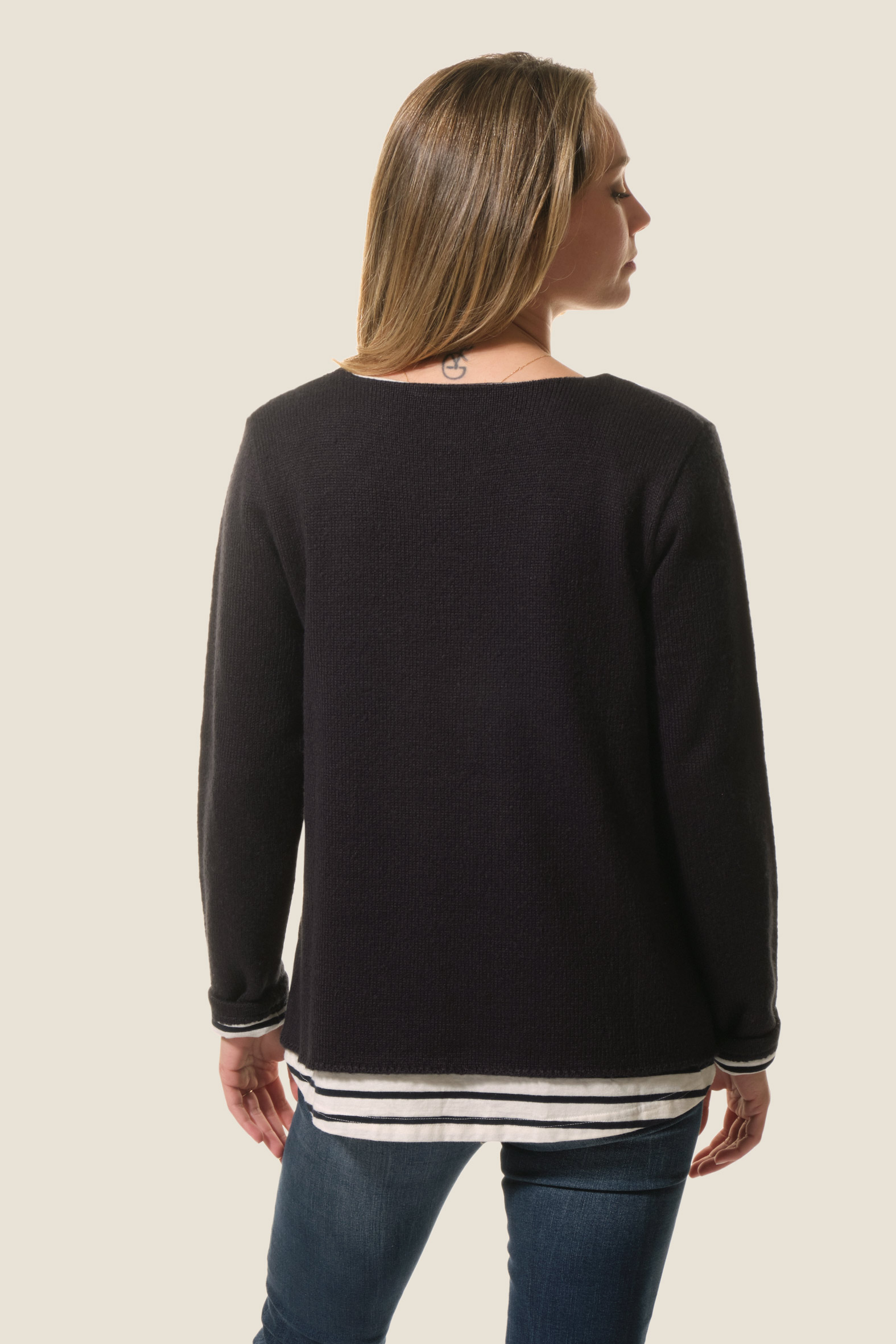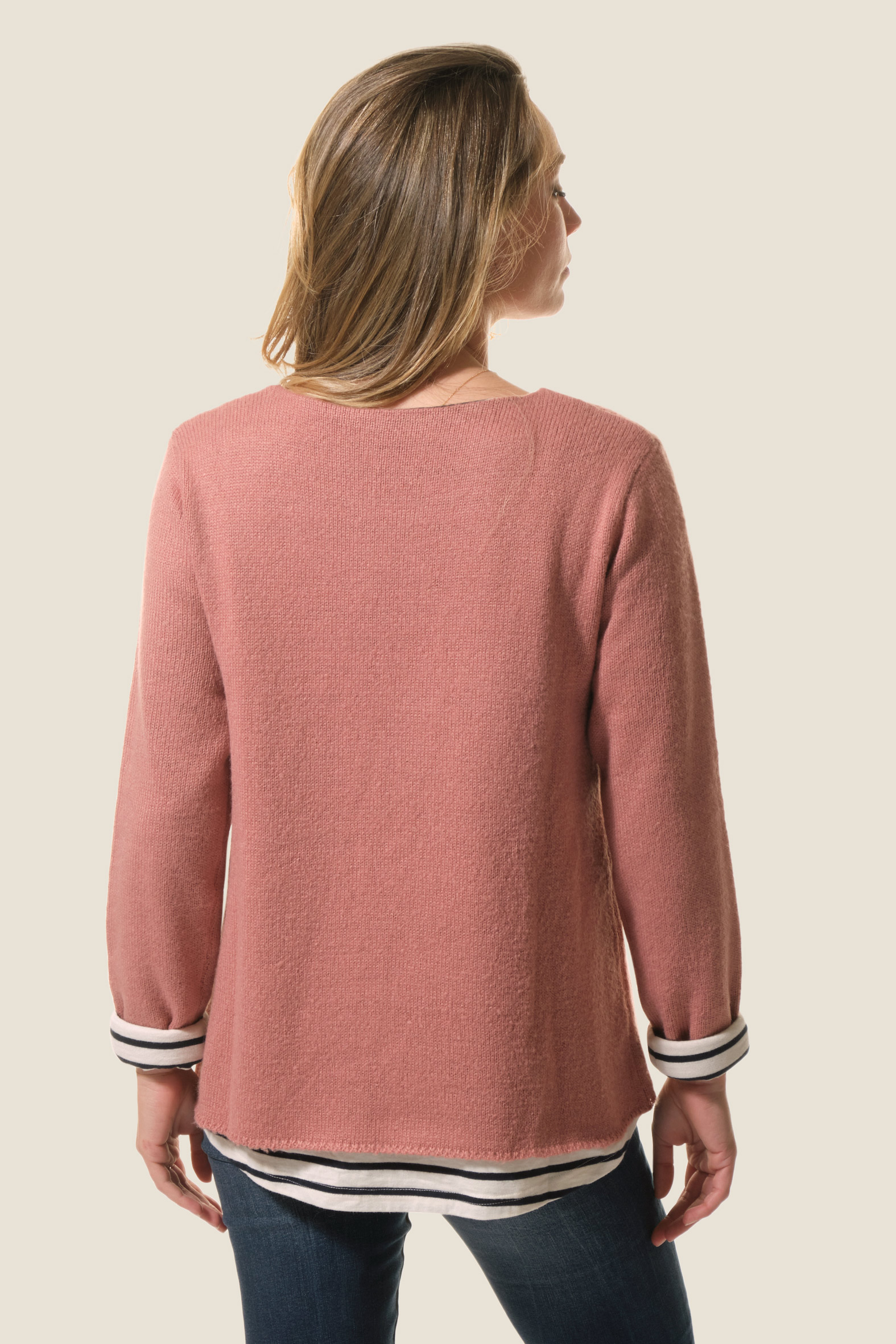 Le pull Fria allie élégance et originalité avec sa maille fine et son effet 2 en 1 grâce à sa doublure jersey rayée. Son col rond apporte une touche classique, pour un essentiel féminin chic et moderne.