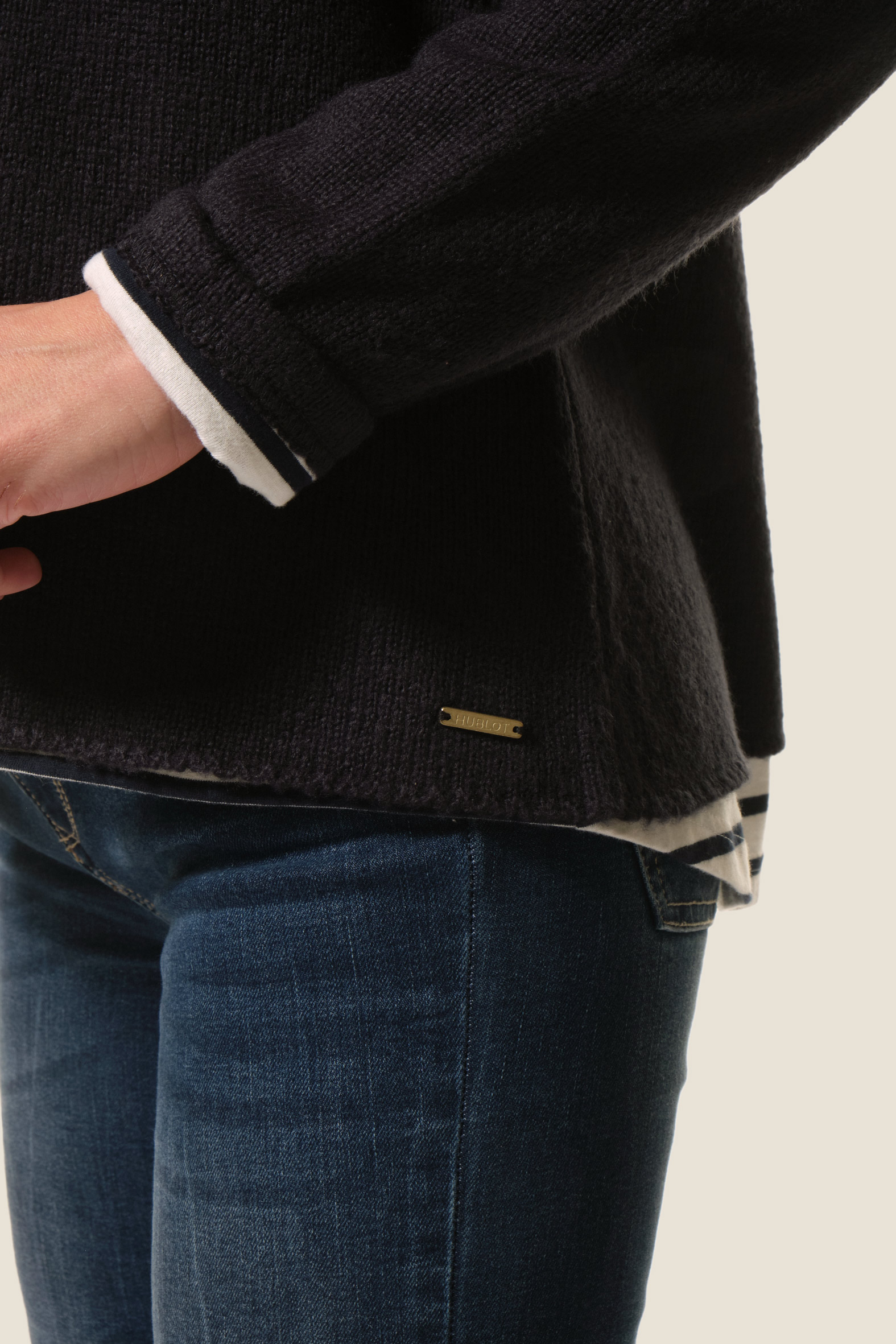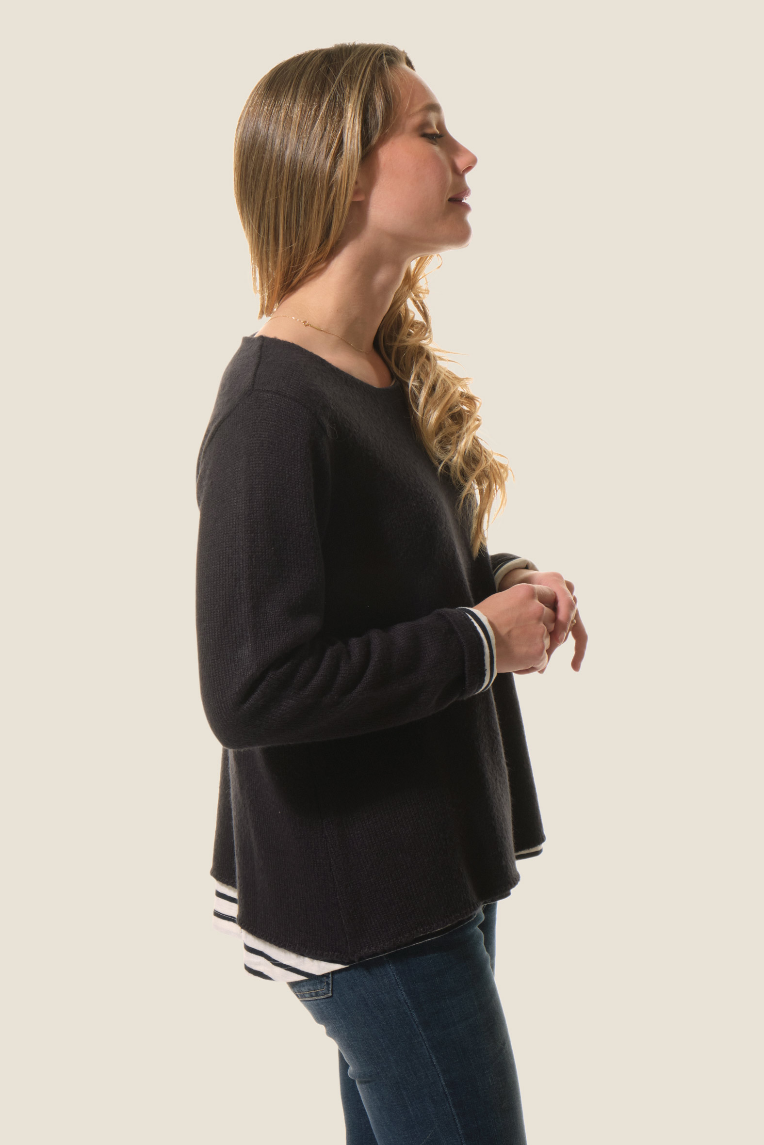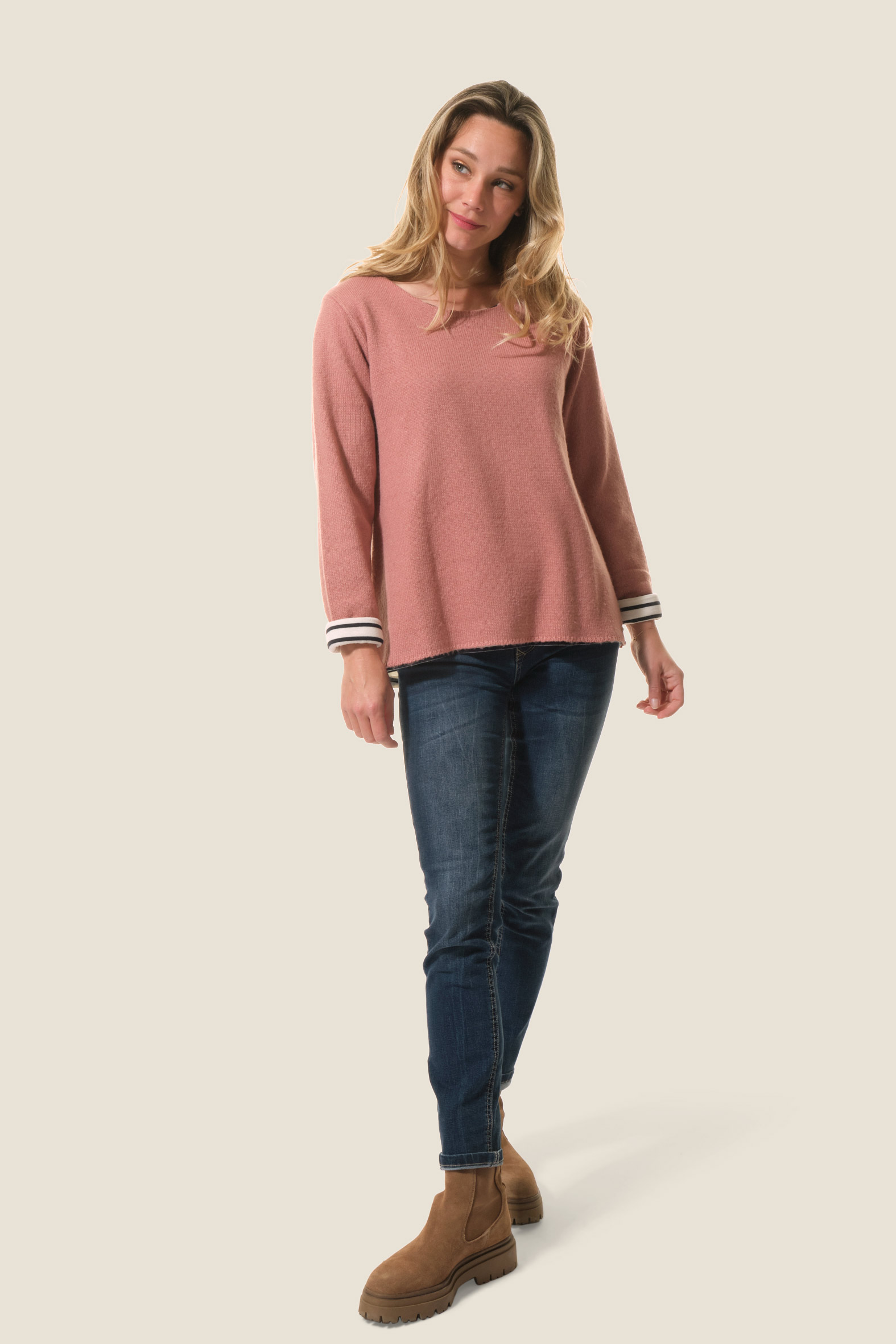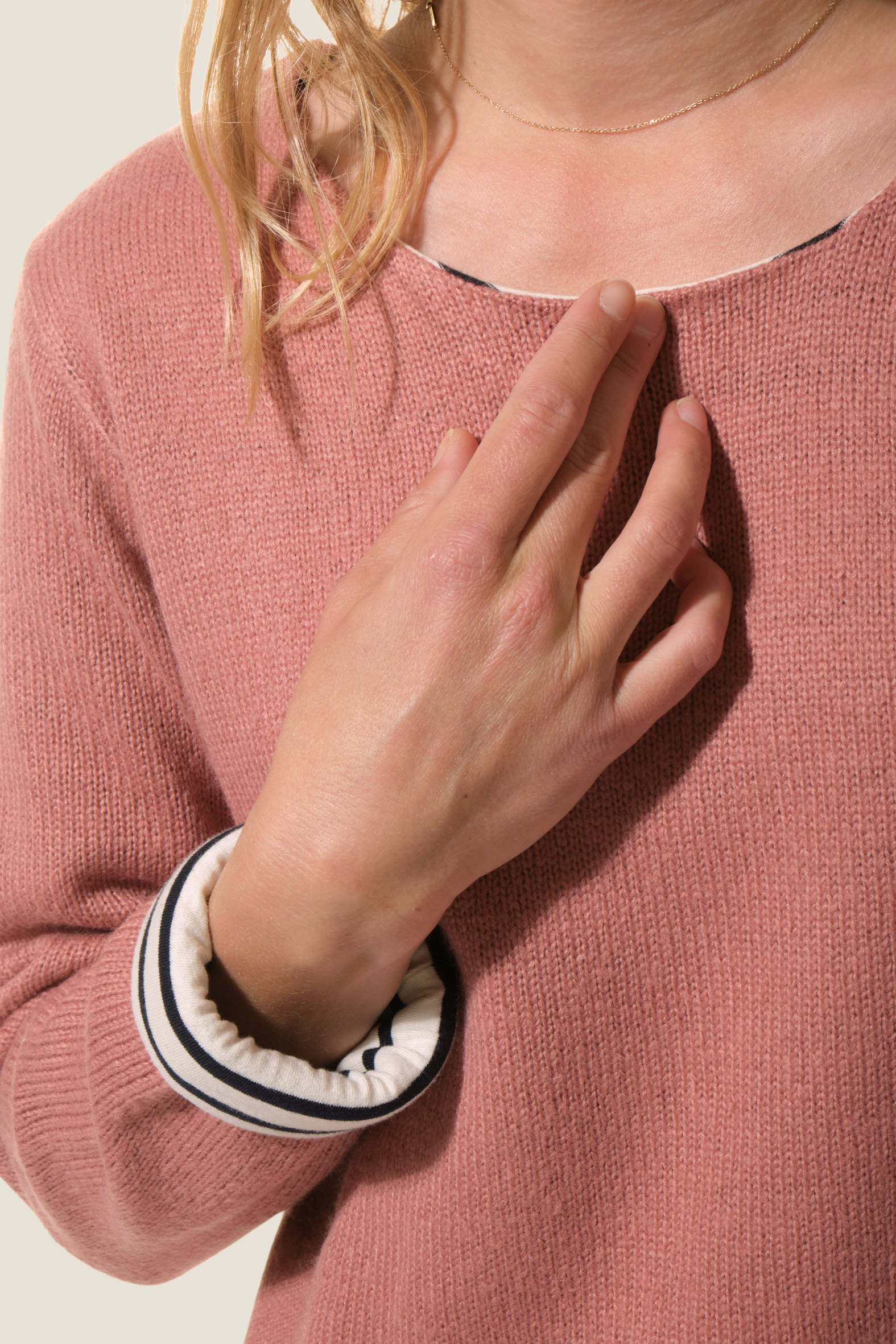 Le pull Fria allie élégance et originalité avec sa maille fine et son effet 2 en 1 grâce à sa doublure jersey rayée. Son col rond apporte une touche classique, pour un essentiel féminin chic et moderne.
