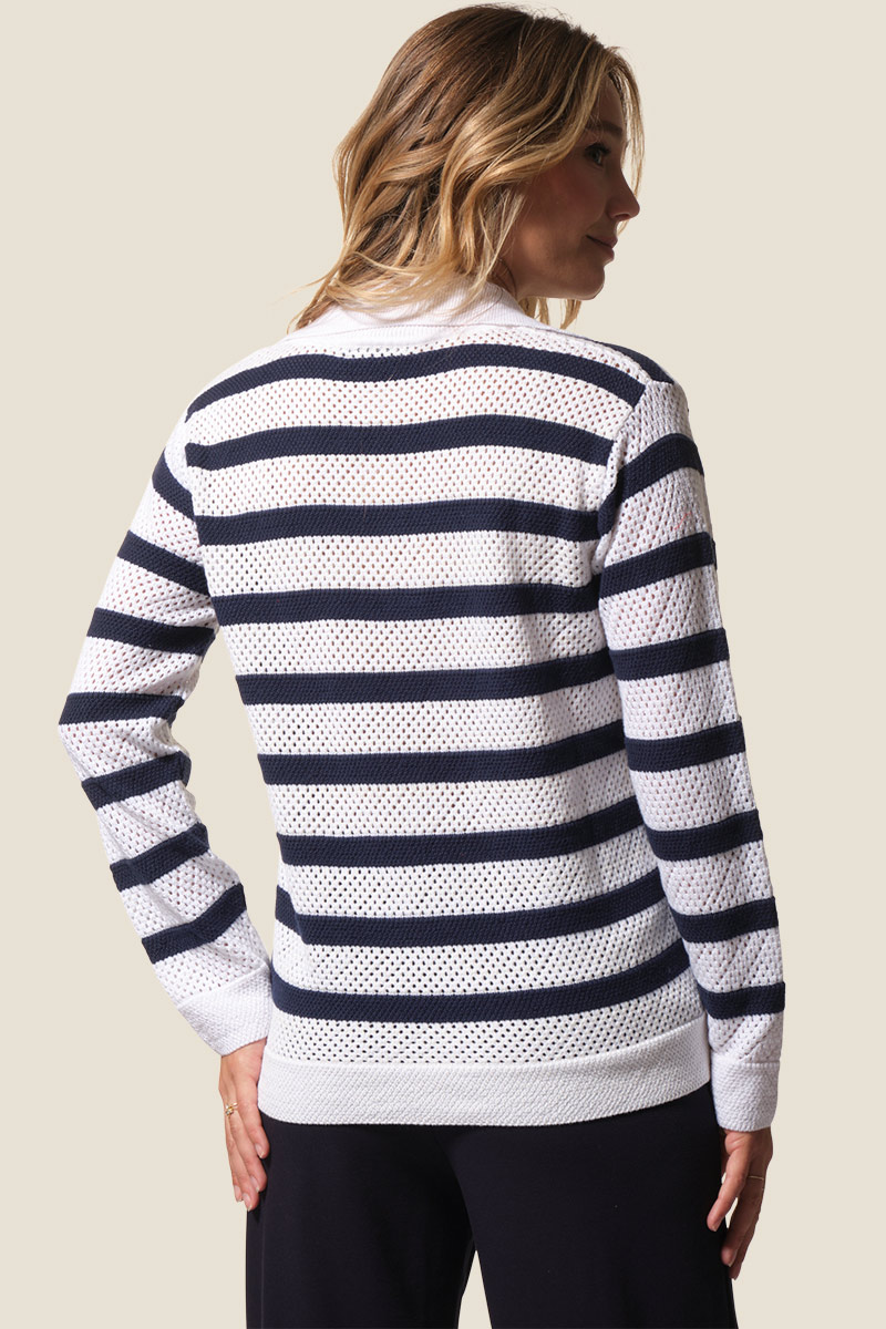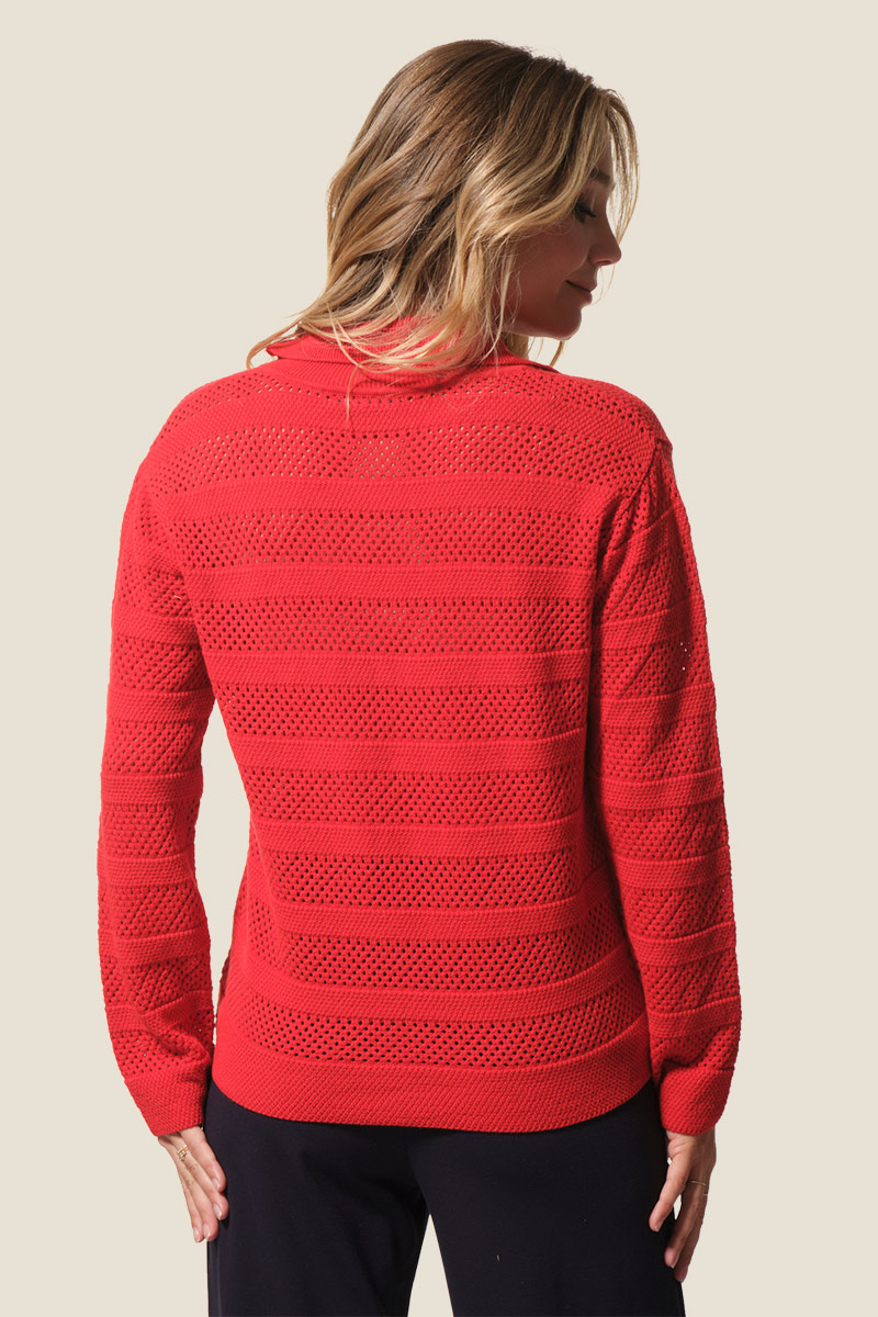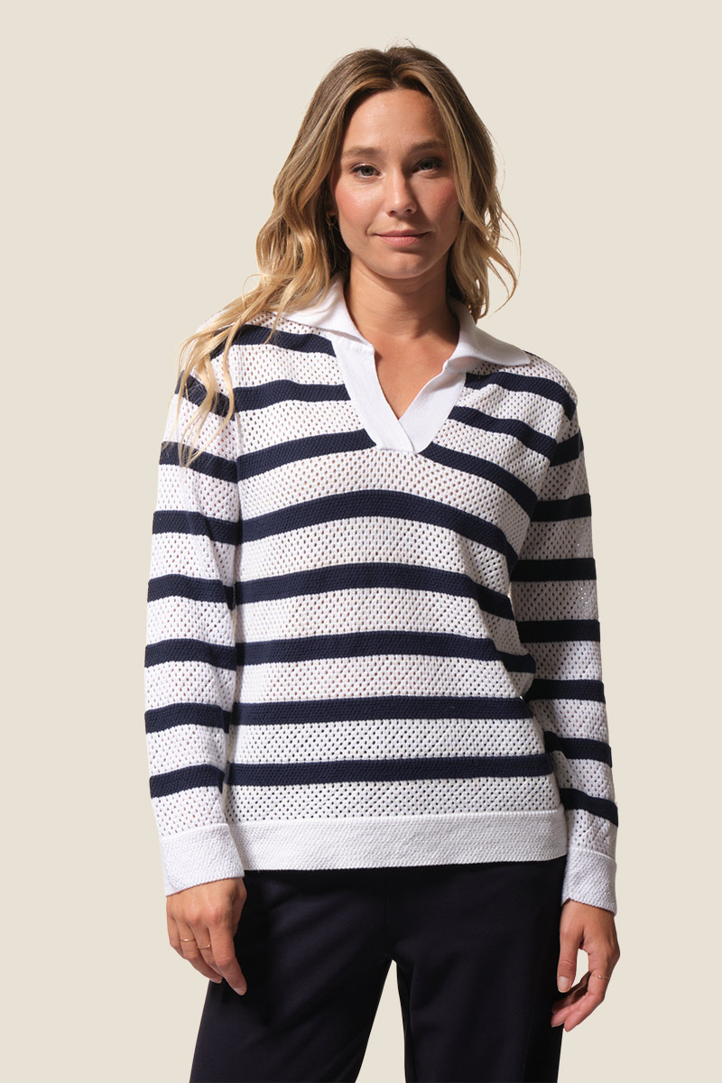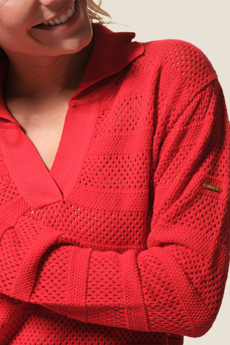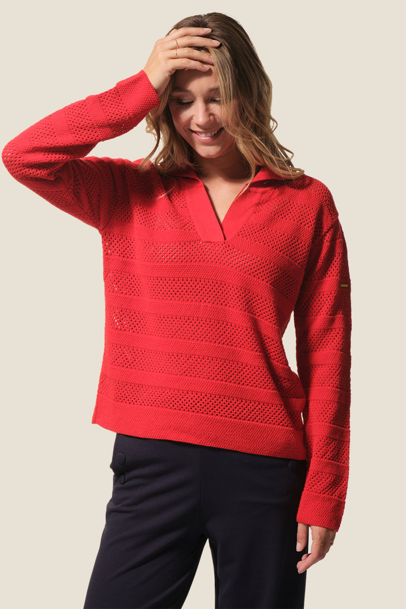 Le pull Cherry est un pull femme en maille ajourée à la coupe droite, léger et élégant. Son col V esprit polo apporte une touche moderne et féminine. Une plaque logo dorée cousue sur la manche gauche signe discrètement ce modèle raffiné.